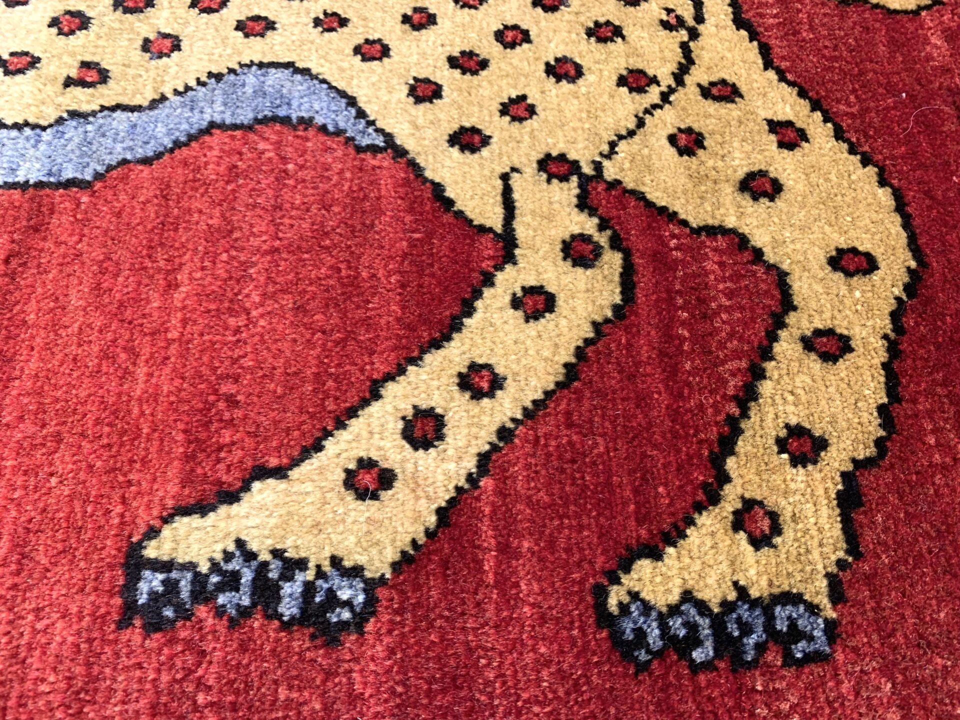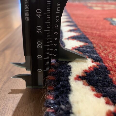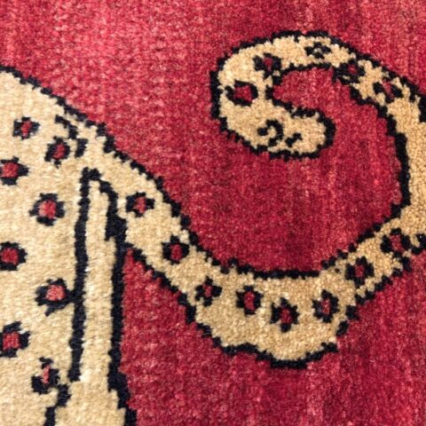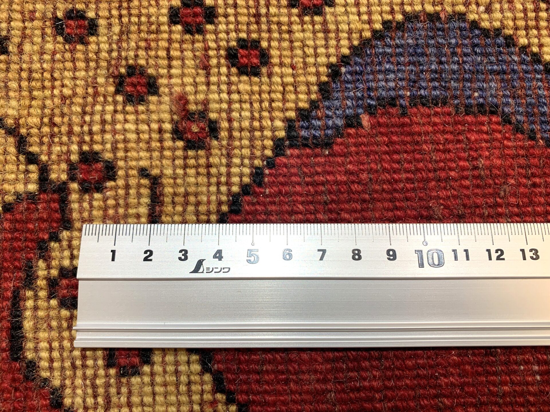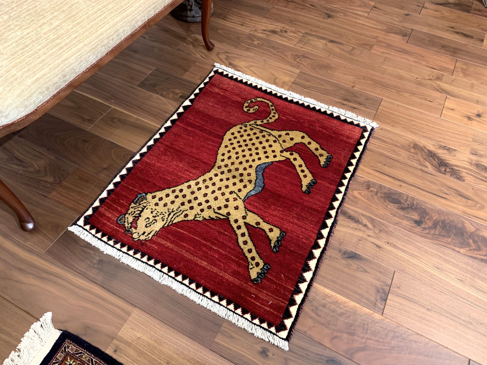 この絨毯の特徴的なデザインとして、ライオンを囲む三角模様が挙げられます。これはオオカミの牙を表し、魔除けの意味を持つ伝統的な文様。遊牧民の暮らしの中で、大切な家族や財産を邪悪なものから守るために取り入れられてきたデザインです。背景の深みのある赤がライオンの存在感を一層引き立て、空間に力強いアクセントを与えます。天然ウールのふかふかとした柔らかい肌触りは、足元に心地よさをもたらし、日常の中で絨毯の温もりを感じられます。小ぶりなサイズなので、玄関、ベッドサイド、デスク前など、様々なシーンに馴染みやすいのもポイント。守護の意味が込められた一枚を、大切な空間に迎えてみてはいかがでしょうか?