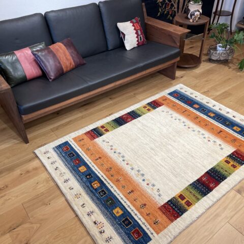 中央の広い無染色ウールのフィールドがナチュラルな空間を演出し、四方を囲むカラフルなボーダーがアクセントに。ボーダー部分には、生命の木や家族の幸せを願う伝統的な文様が散りばめられており、デザインの美しさだけでなく、深い意味合いも持つ一枚となっています。明るく軽やかな印象のデザインなので、リビングやダイニングスペース、寝室など、どんな空間にも自然に馴染みます。カシュクリならではのしなやかな踏み心地と、使うほどに増す風合いをぜひお楽しみください。