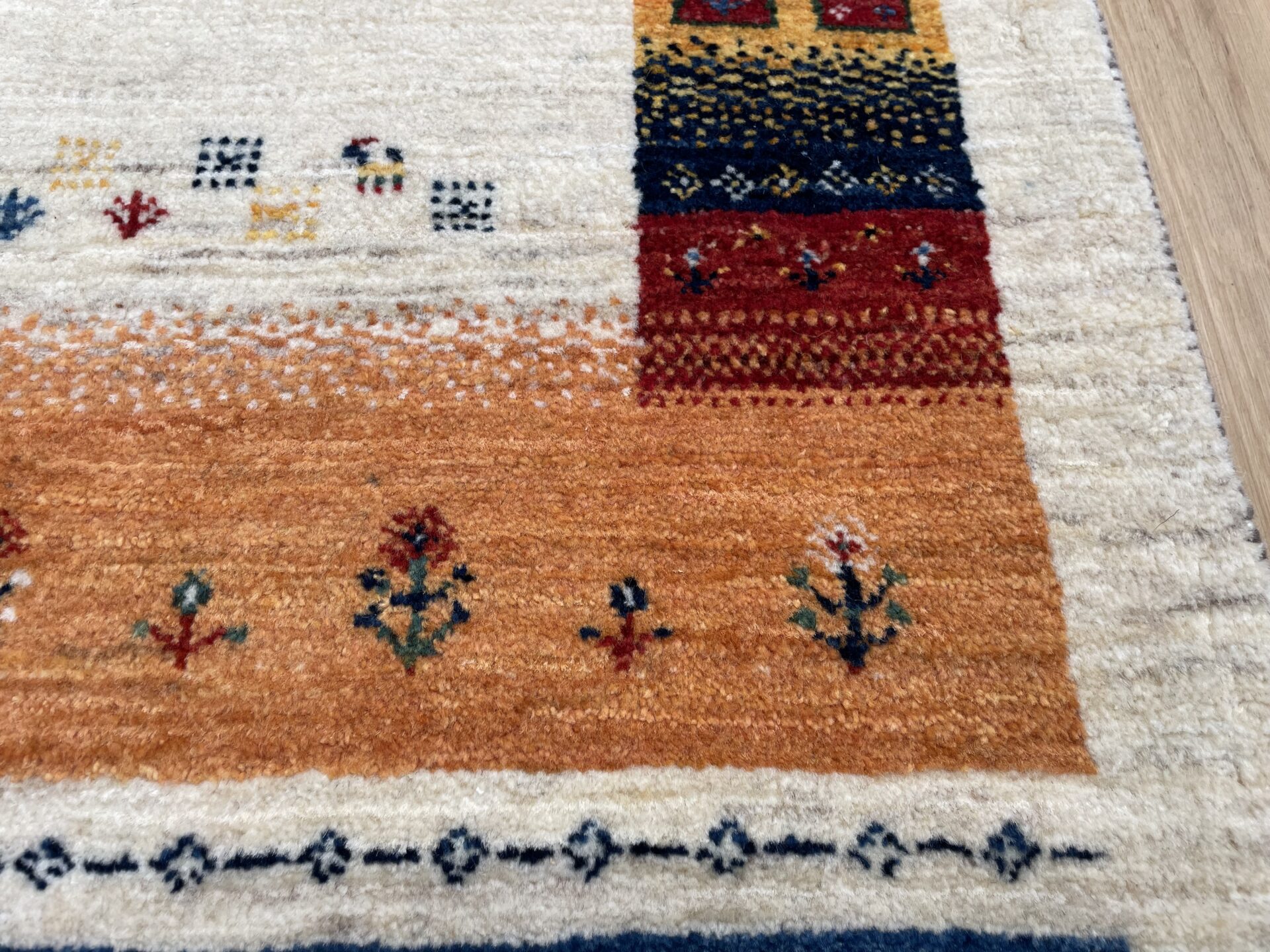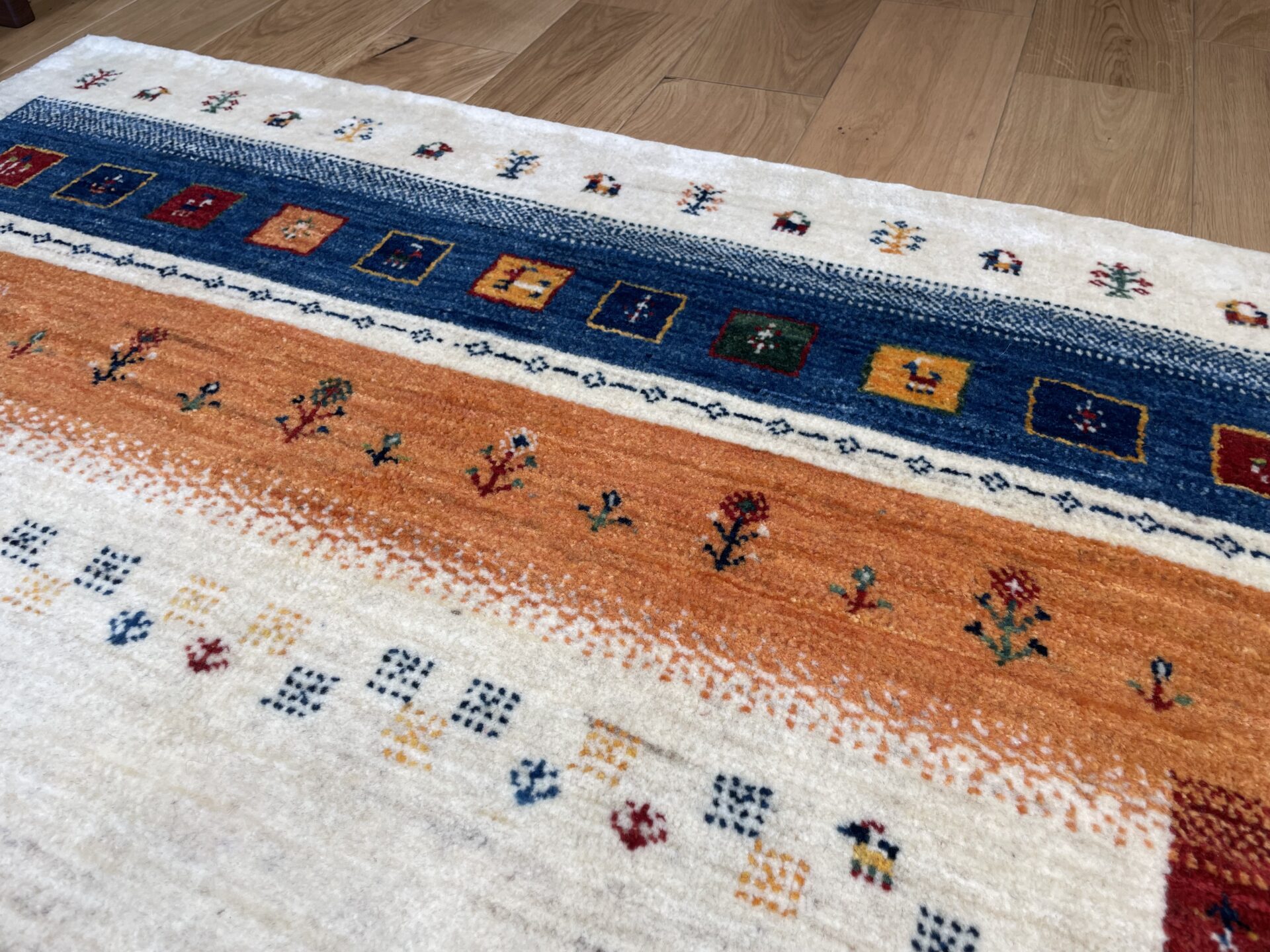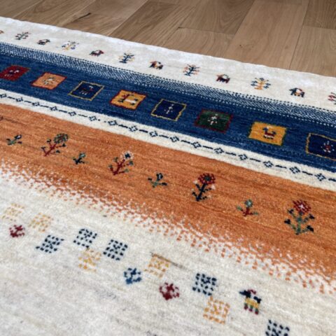 最高品質のカシュクリランクならではの細やかな織りと、鮮やかで洗練されたデザインが特徴の一枚。カシュクリギャッベは、通常のギャッベよりも織り目が細かく、柔らかでしなやかな肌触りが魅力です。