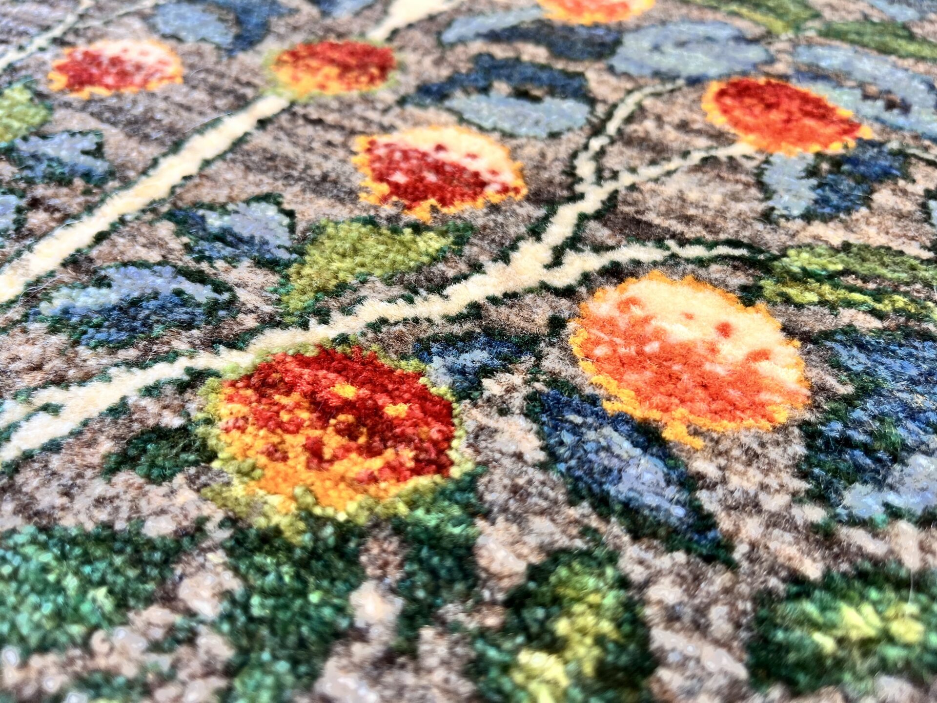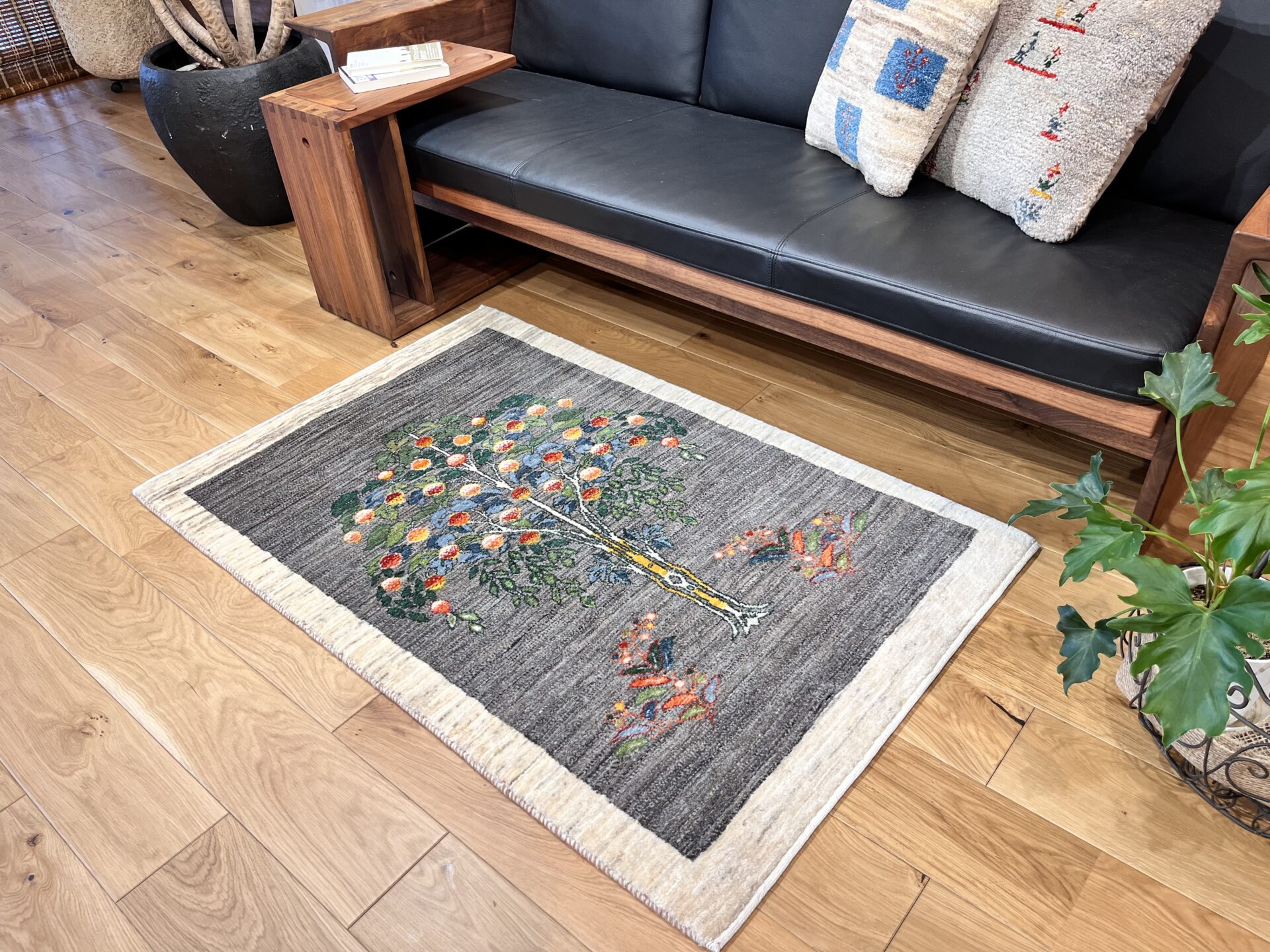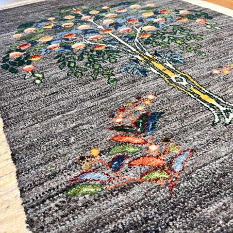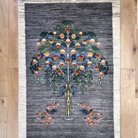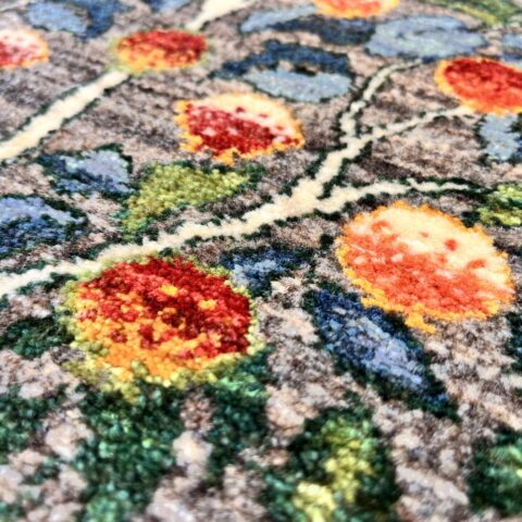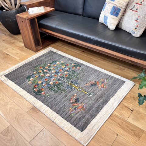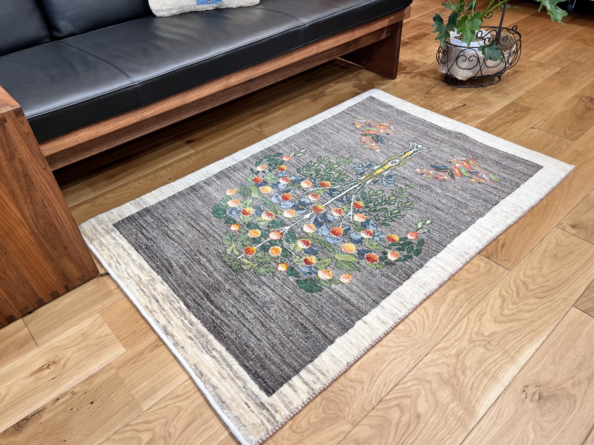 中央に描かれているのは、たわわに実をつけたザクロの樹。ザクロは“子孫繁栄”や“豊かさ”を象徴する、古くからの縁起の良いモチーフです。この一枚は、ゾランヴァリ工房の中でも特に高い技術を持つ職人によって、長い時間をかけて丁寧に織り上げられました。複雑な文様の表現力、繊細なグラデーション、そして全体の構成美――まさに芸術品と呼ぶにふさわしい仕上がりです。静謐なグレー地に鮮やかに浮かび上がる生命の樹は、空間に気品と深みをもたらします。