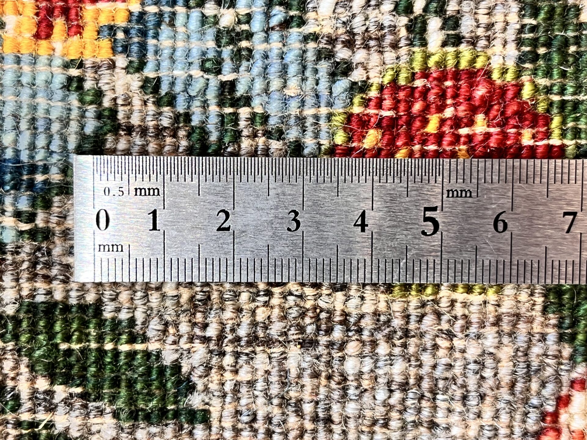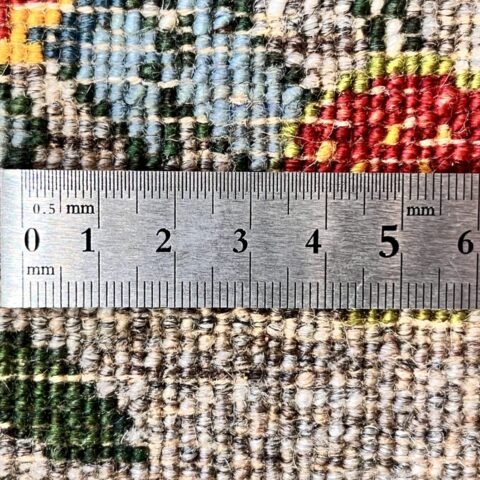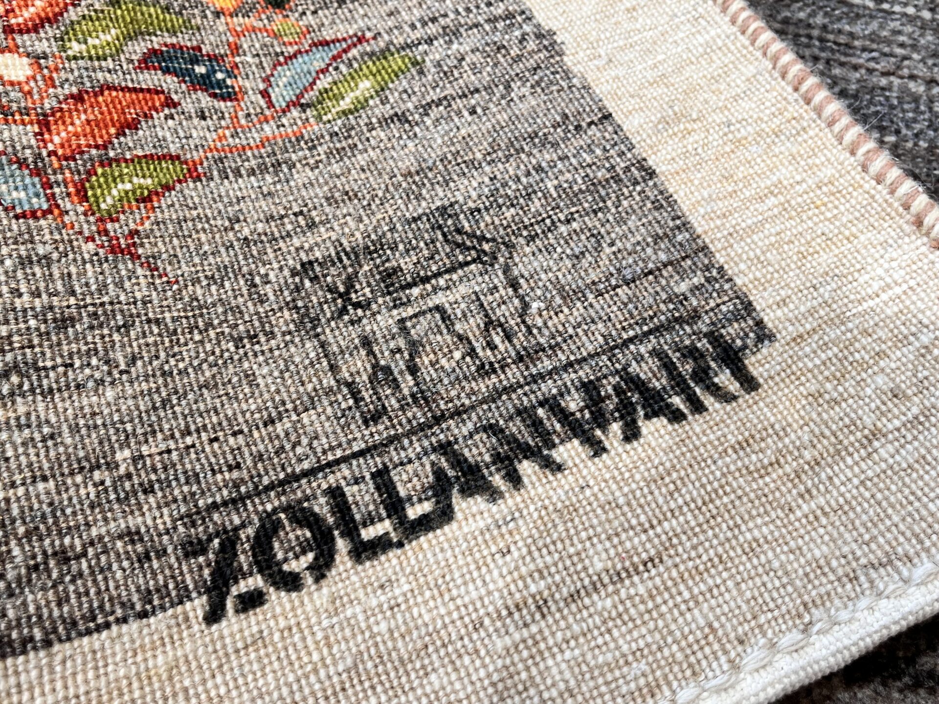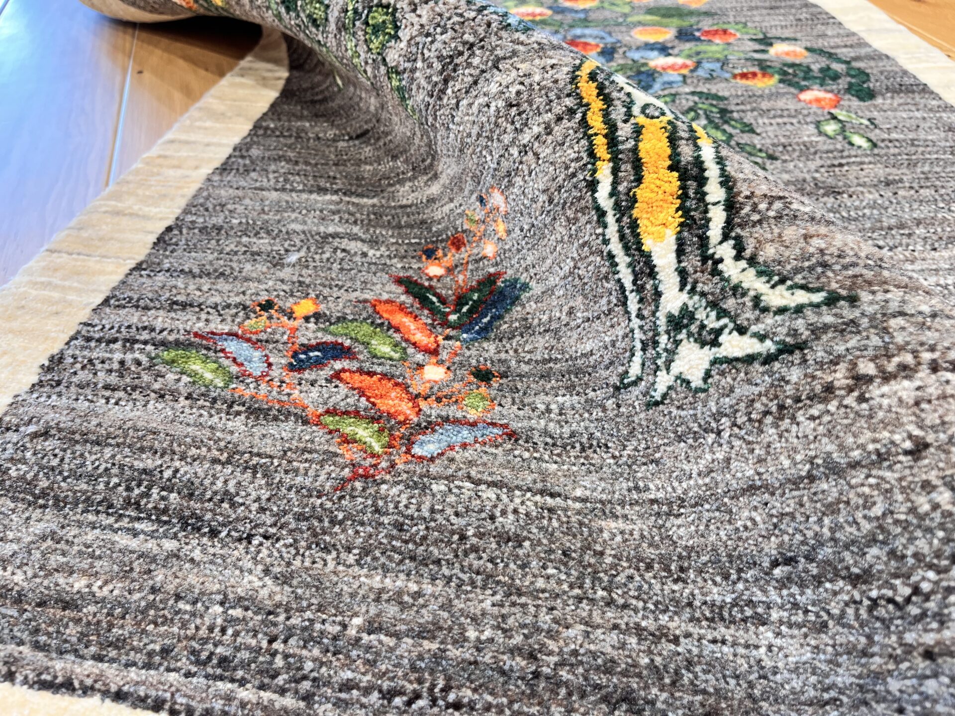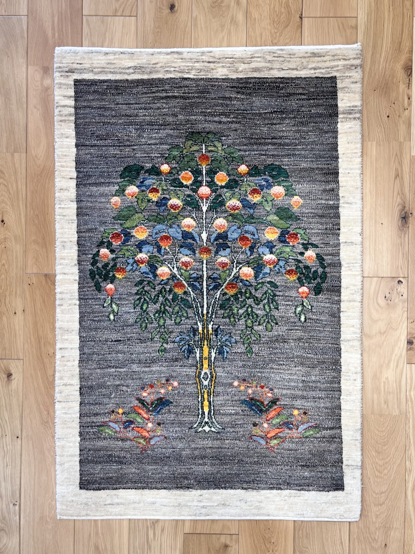 中央に描かれているのは、たわわに実をつけたザクロの樹。ザクロは“子孫繁栄”や“豊かさ”を象徴する、古くからの縁起の良いモチーフです。この一枚は、ゾランヴァリ工房の中でも特に高い技術を持つ職人によって、長い時間をかけて丁寧に織り上げられました。複雑な文様の表現力、繊細なグラデーション、そして全体の構成美――まさに芸術品と呼ぶにふさわしい仕上がりです。静謐なグレー地に鮮やかに浮かび上がる生命の樹は、空間に気品と深みをもたらします。