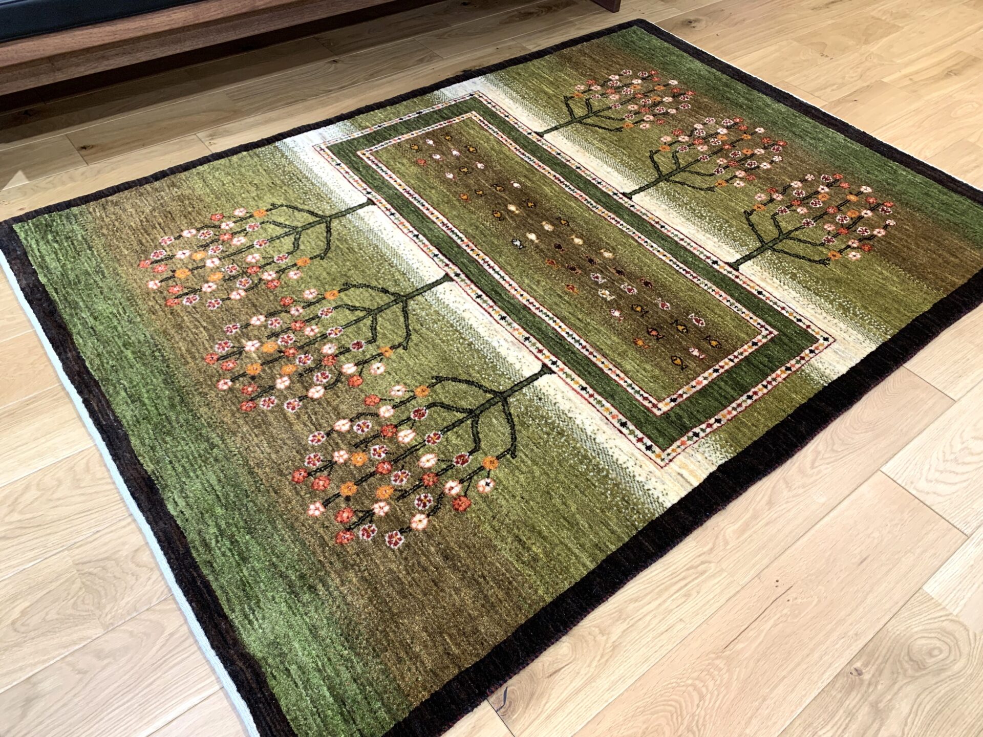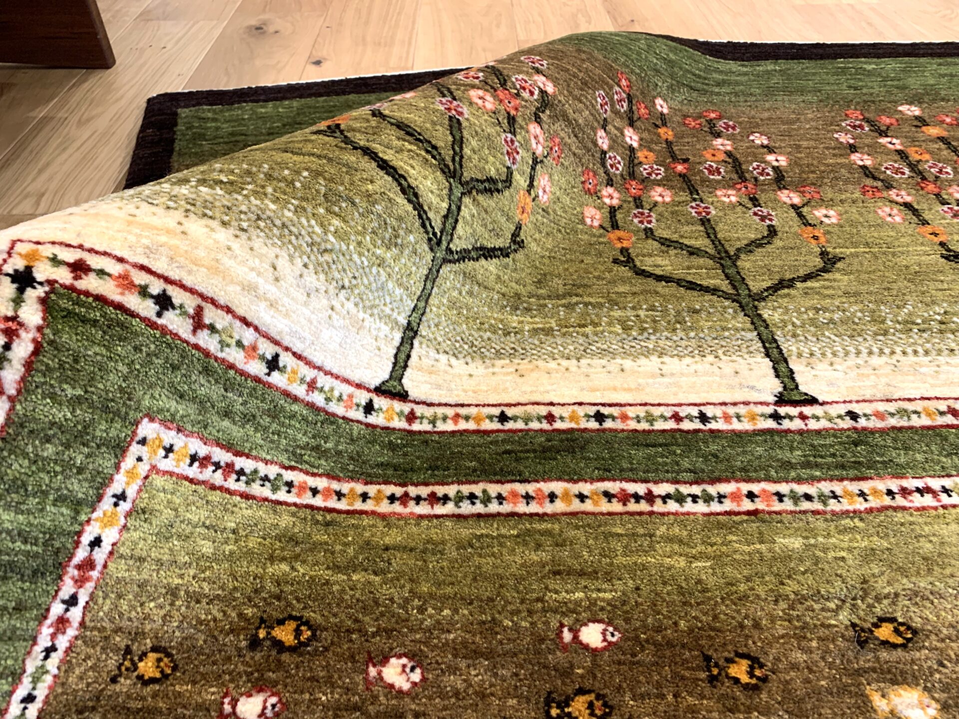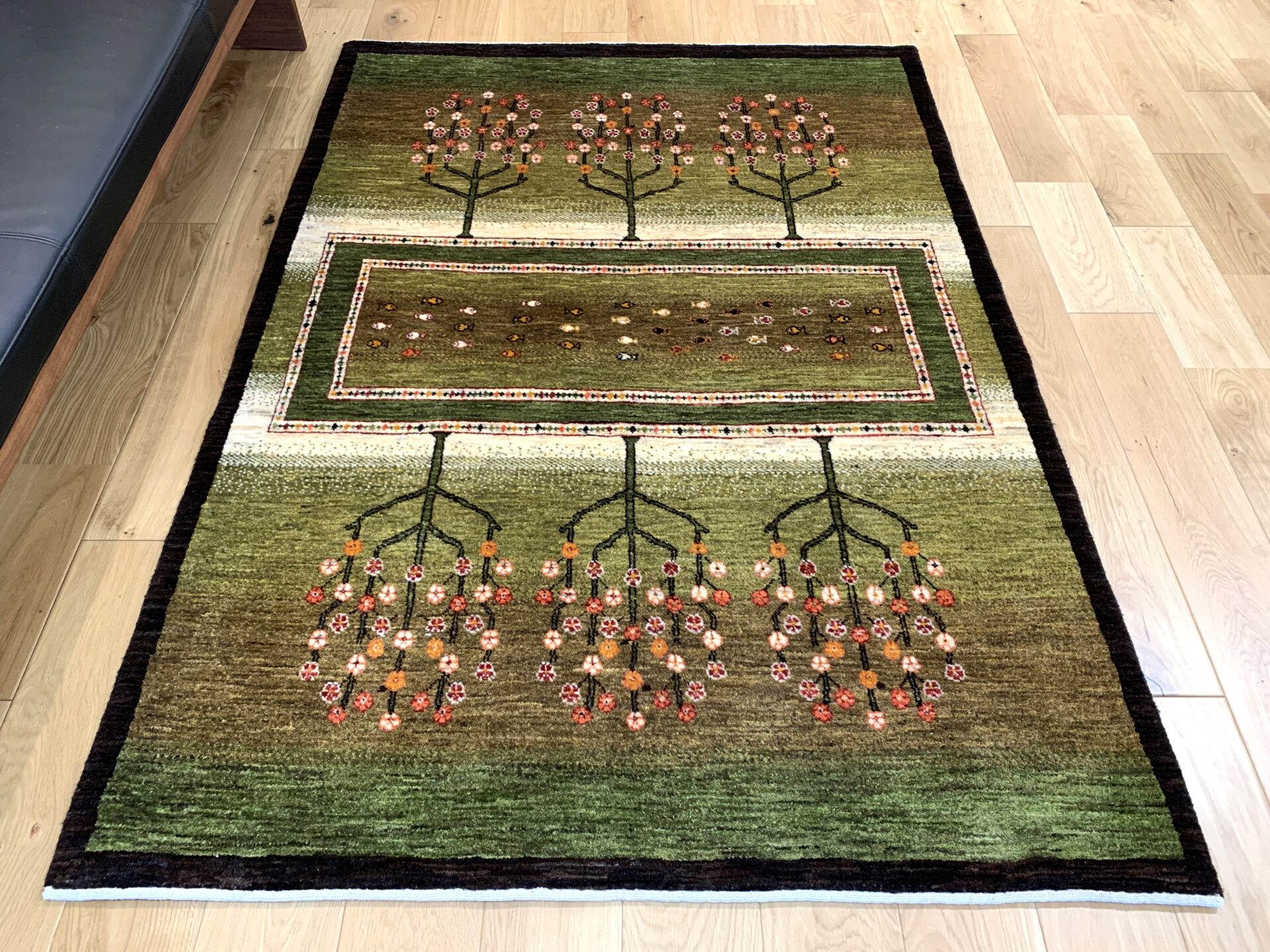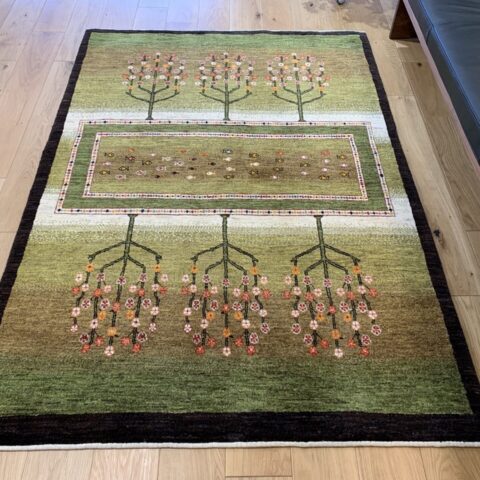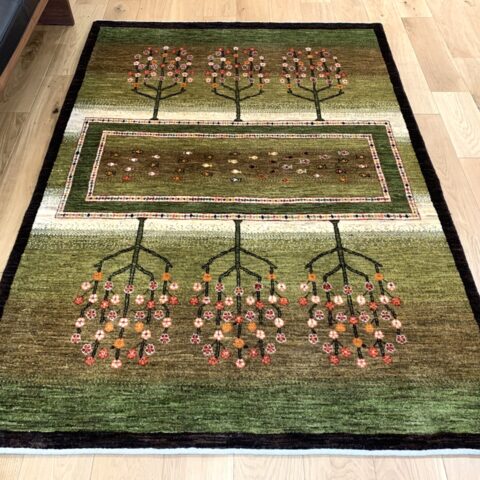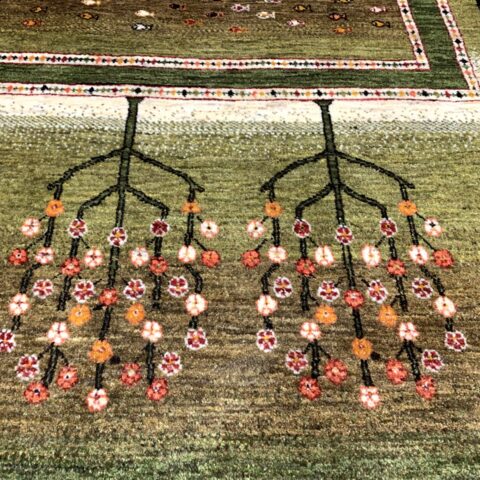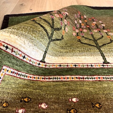 まるで庭園を上空から眺めたかのような、美しい構図のギャッベ。左右に咲き誇る生命の樹は、たわわな果実を実らせ、豊かさや成長の象徴とされています。中央のフィールドには、自由の象徴「魚」がちりばめられ、まるで水辺に命が宿っているかのよう。緑のグラデーションはジャシールの葉で丁寧に染め上げられ、自然そのもののような落ち着きと優しさを感じさせてくれます。織りの細かいカシュクリランクならではの滑らかな肌触りと、高い芸術性も魅力のひとつ。見るたびに心がほどける、癒しの一枚です。