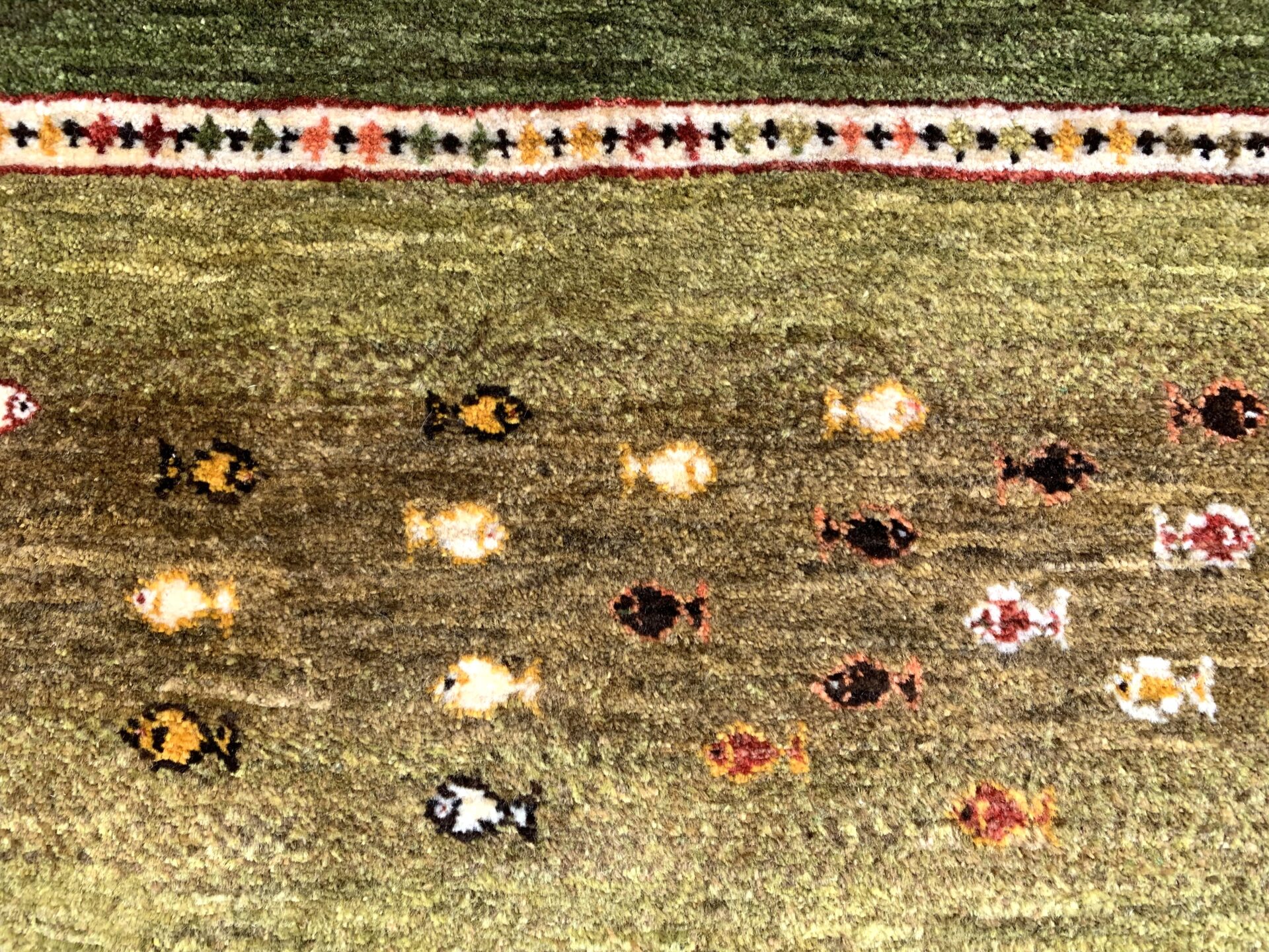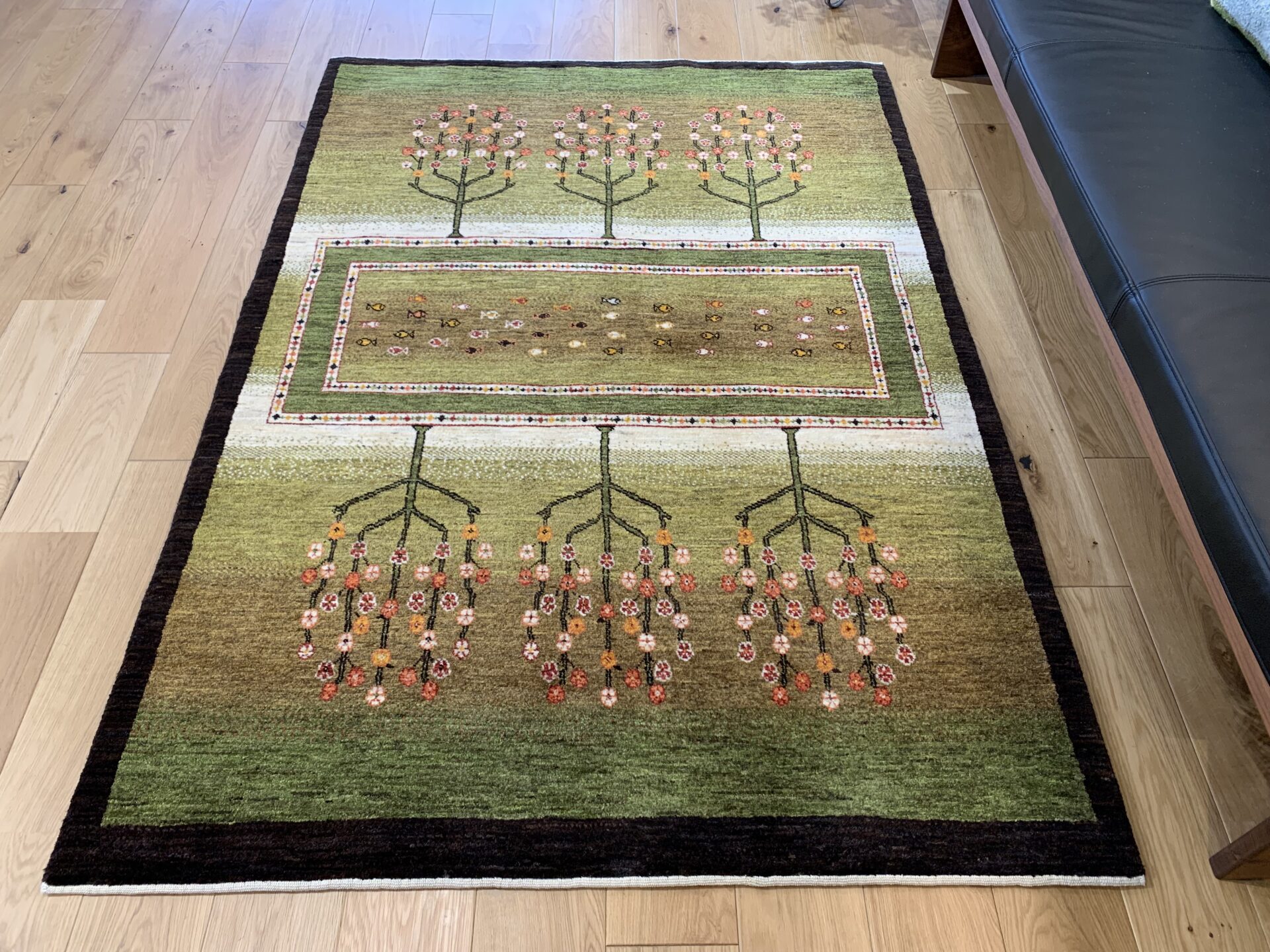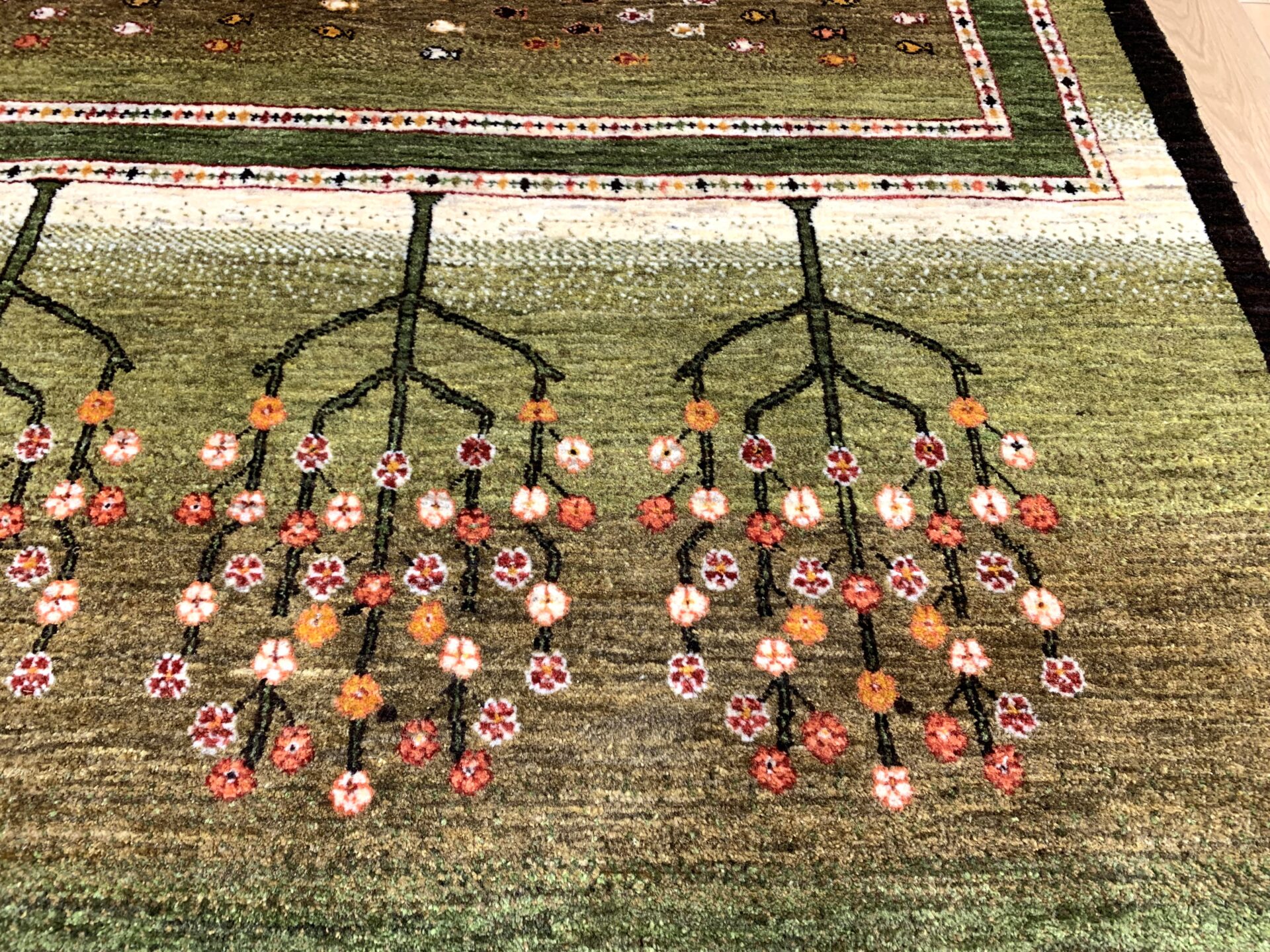 まるで庭園を上空から眺めたかのような、美しい構図のギャッベ。左右に咲き誇る生命の樹は、たわわな果実を実らせ、豊かさや成長の象徴とされています。中央のフィールドには、自由の象徴「魚」がちりばめられ、まるで水辺に命が宿っているかのよう。緑のグラデーションはジャシールの葉で丁寧に染め上げられ、自然そのもののような落ち着きと優しさを感じさせてくれます。織りの細かいカシュクリランクならではの滑らかな肌触りと、高い芸術性も魅力のひとつ。見るたびに心がほどける、癒しの一枚です。