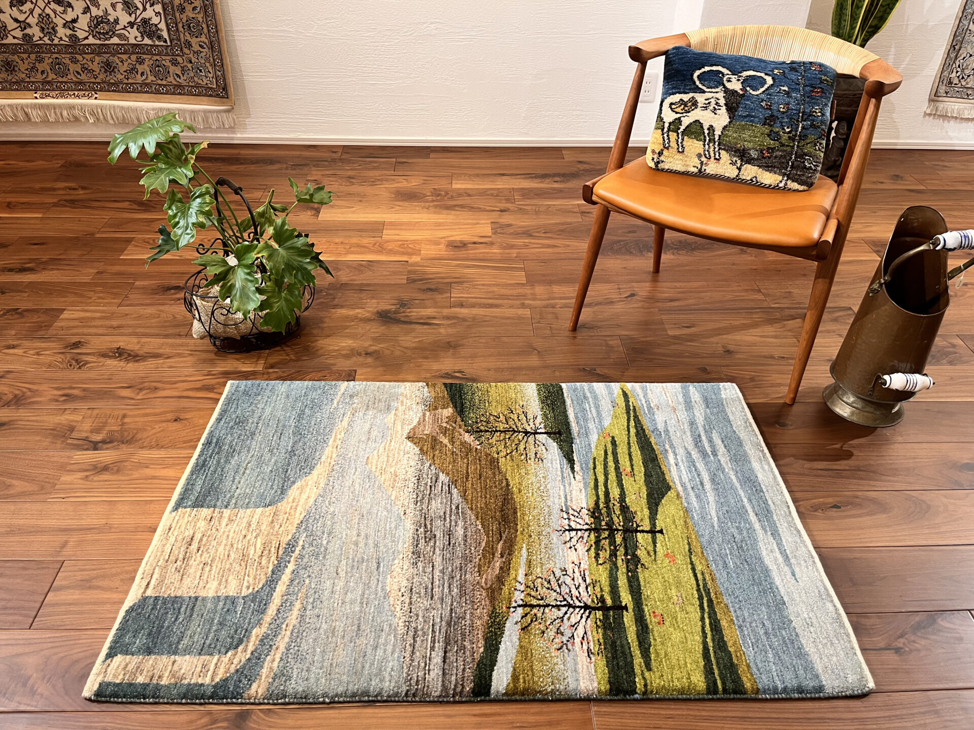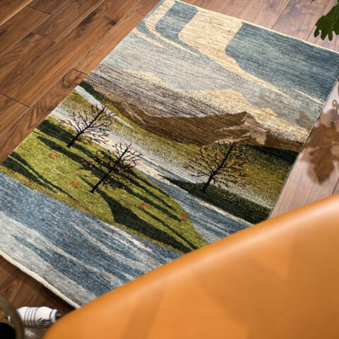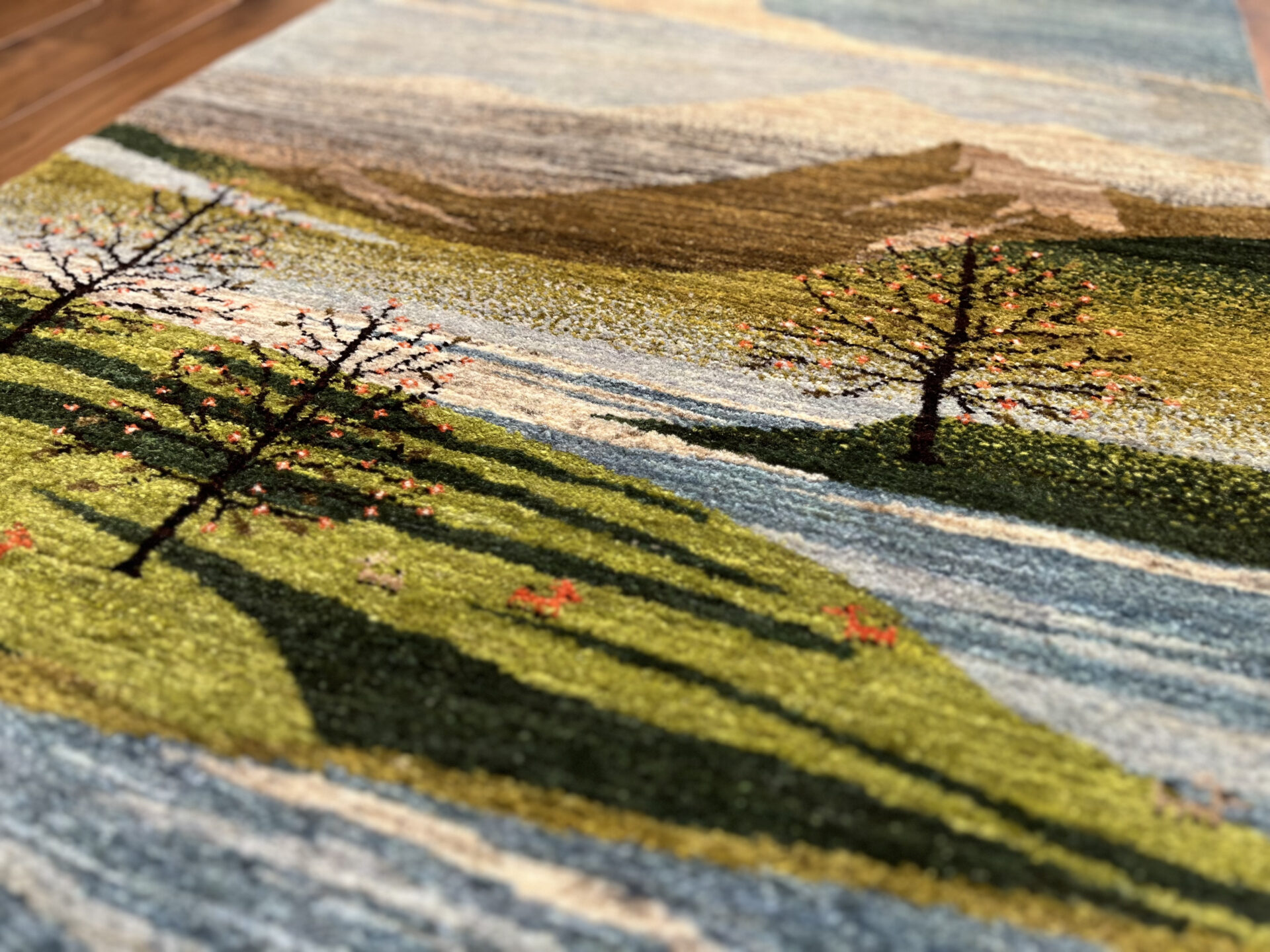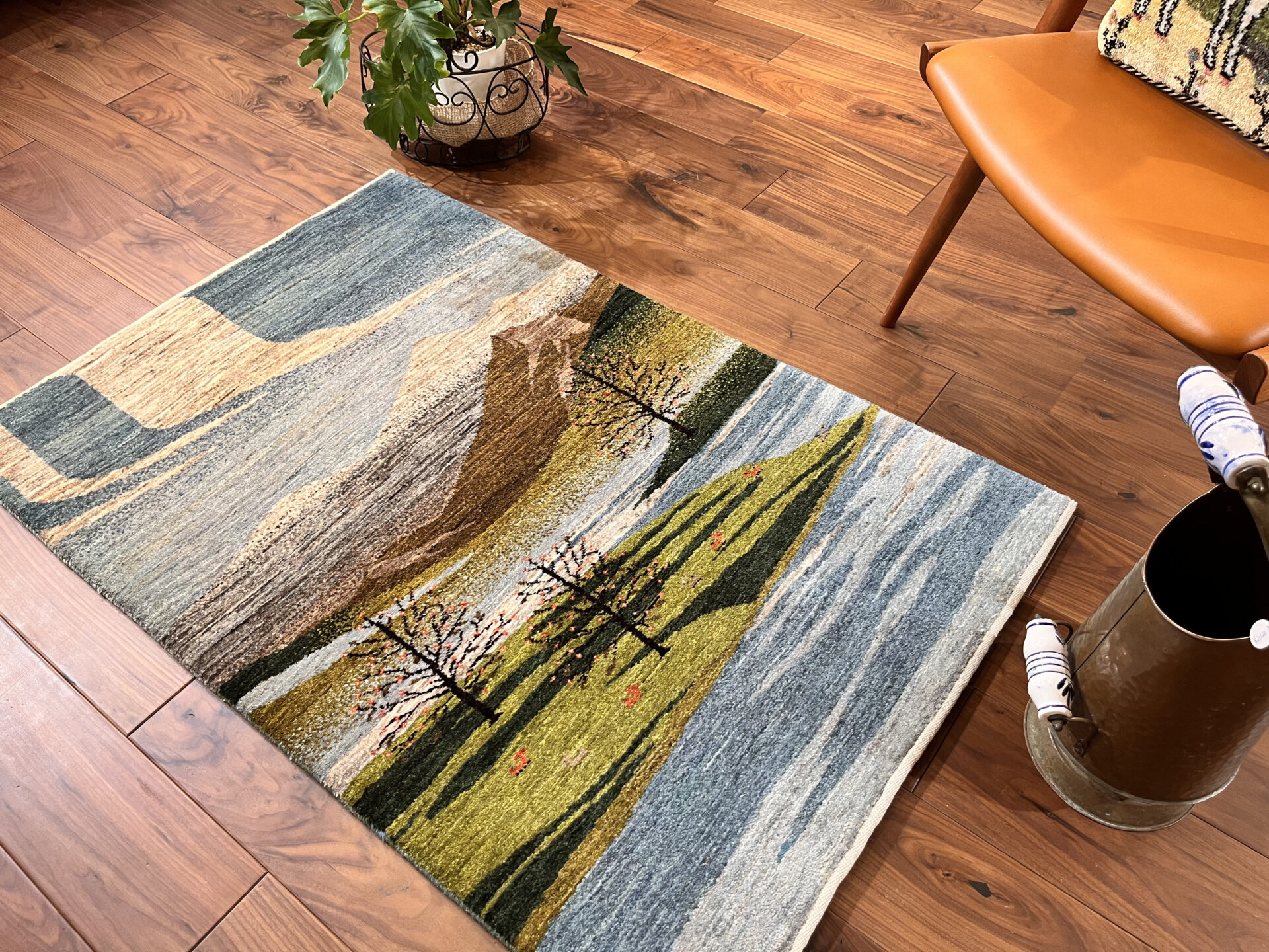一枚の風景画のように。心に残る、イランの大地。広がる空、なだらかな丘、そびえる木々。イランの自然を、まるで絵画のように織り込んだ、芸術性の高い一枚です。爽やかなブルーとグリーンの色調が、空間に静かな彩りを添えてくれます。毛足もやや長めで質の良いウールを使用しており、踏み心地もふんわり柔らか。ラグとしてはもちろん、壁に掛けて絵画として楽しむのもおすすめ。実用性と芸術性を兼ね備えた、“間違いなし”の逸品です。