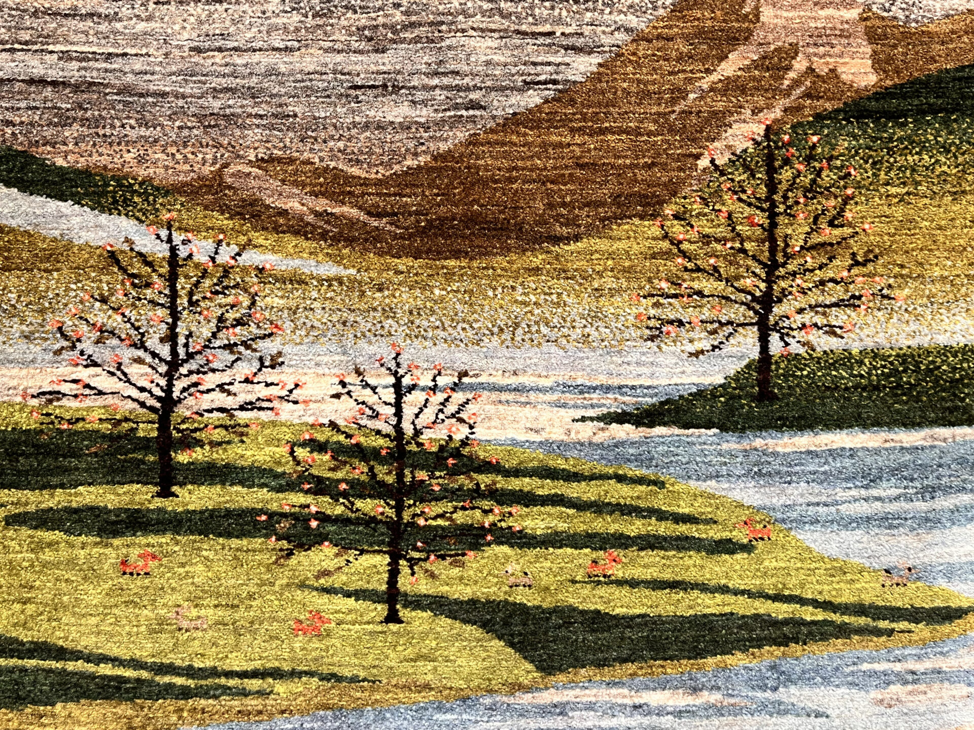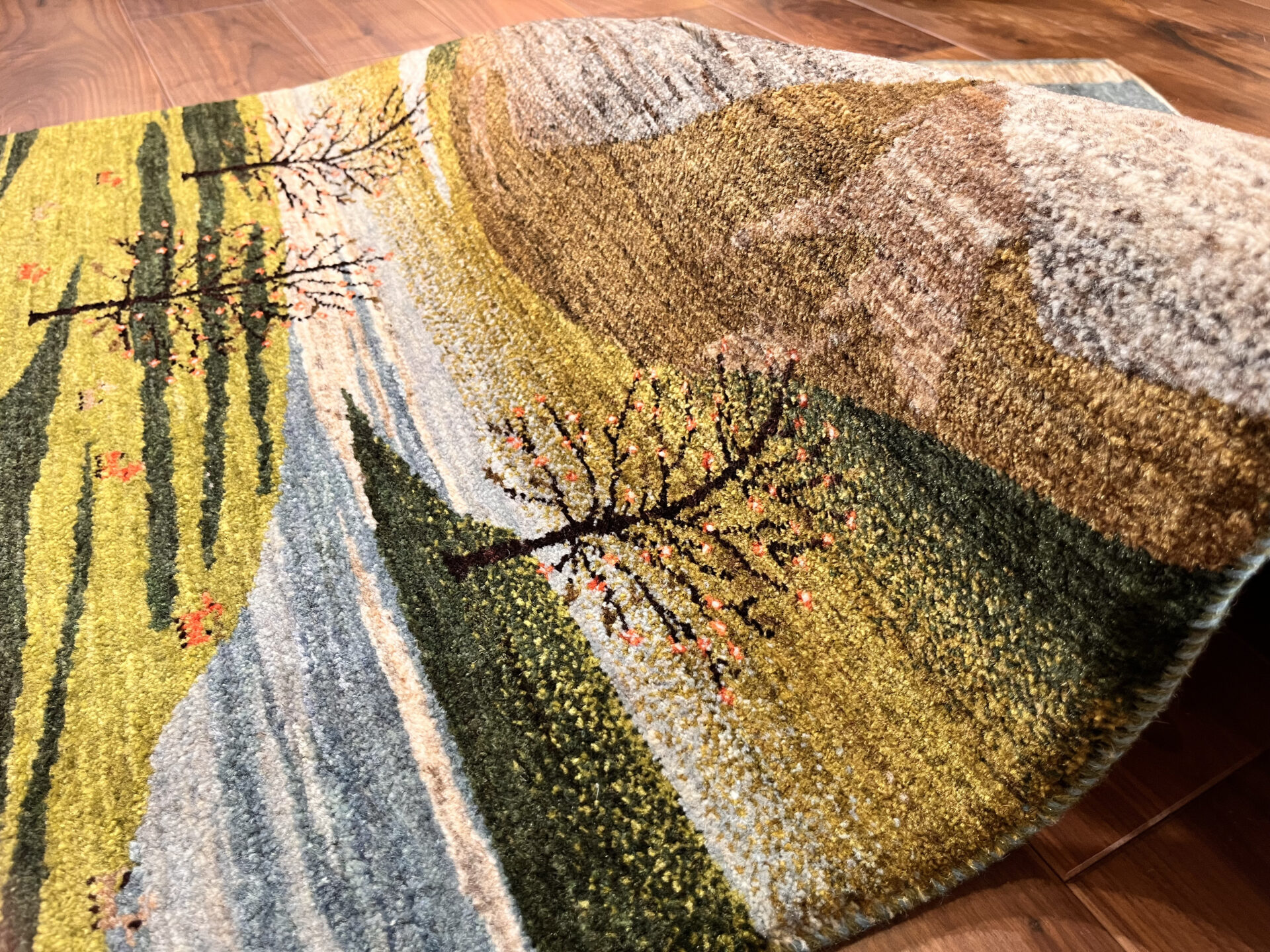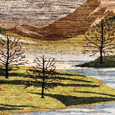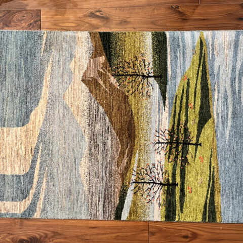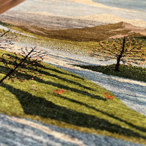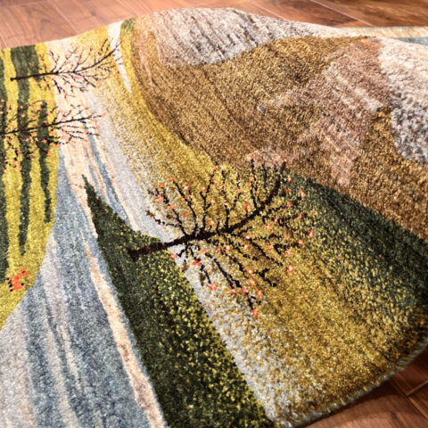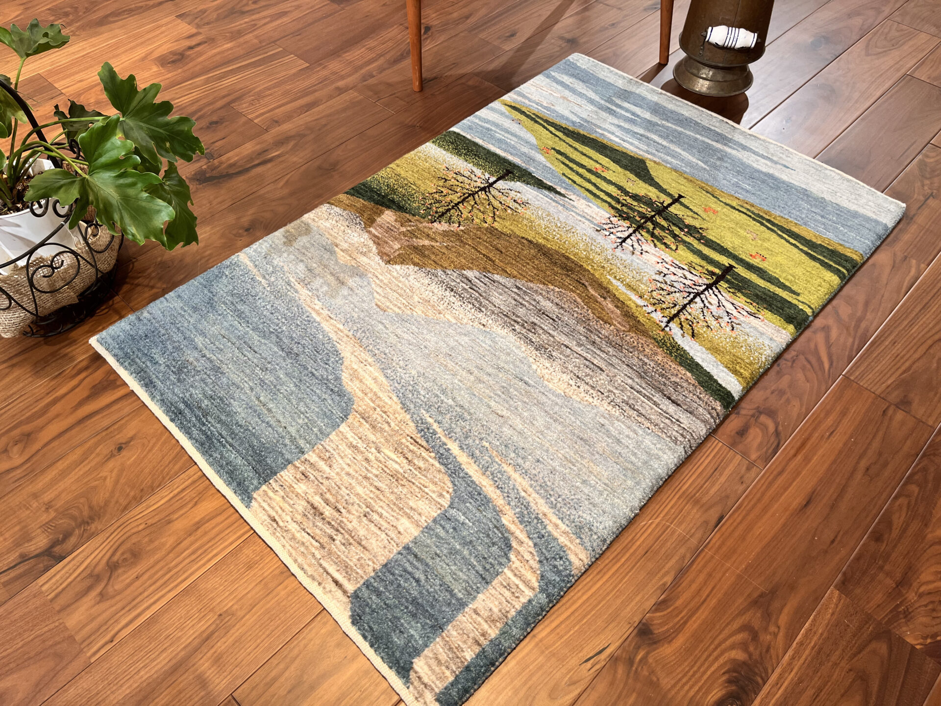 一枚の風景画のように。心に残る、イランの大地。広がる空、なだらかな丘、そびえる木々。イランの自然を、まるで絵画のように織り込んだ、芸術性の高い一枚です。爽やかなブルーとグリーンの色調が、空間に静かな彩りを添えてくれます。毛足もやや長めで質の良いウールを使用しており、踏み心地もふんわり柔らか。ラグとしてはもちろん、壁に掛けて絵画として楽しむのもおすすめ。実用性と芸術性を兼ね備えた、“間違いなし”の逸品です。