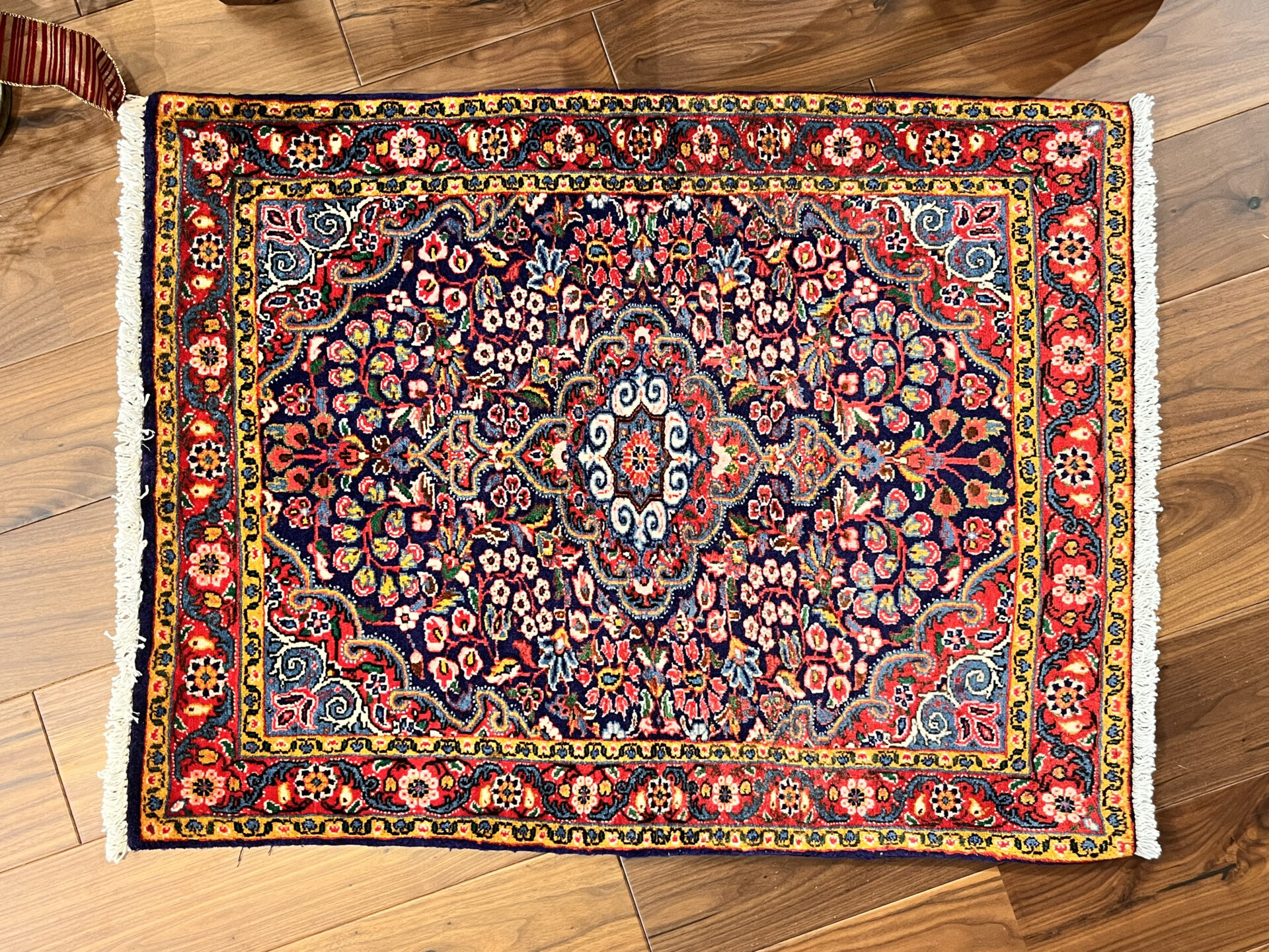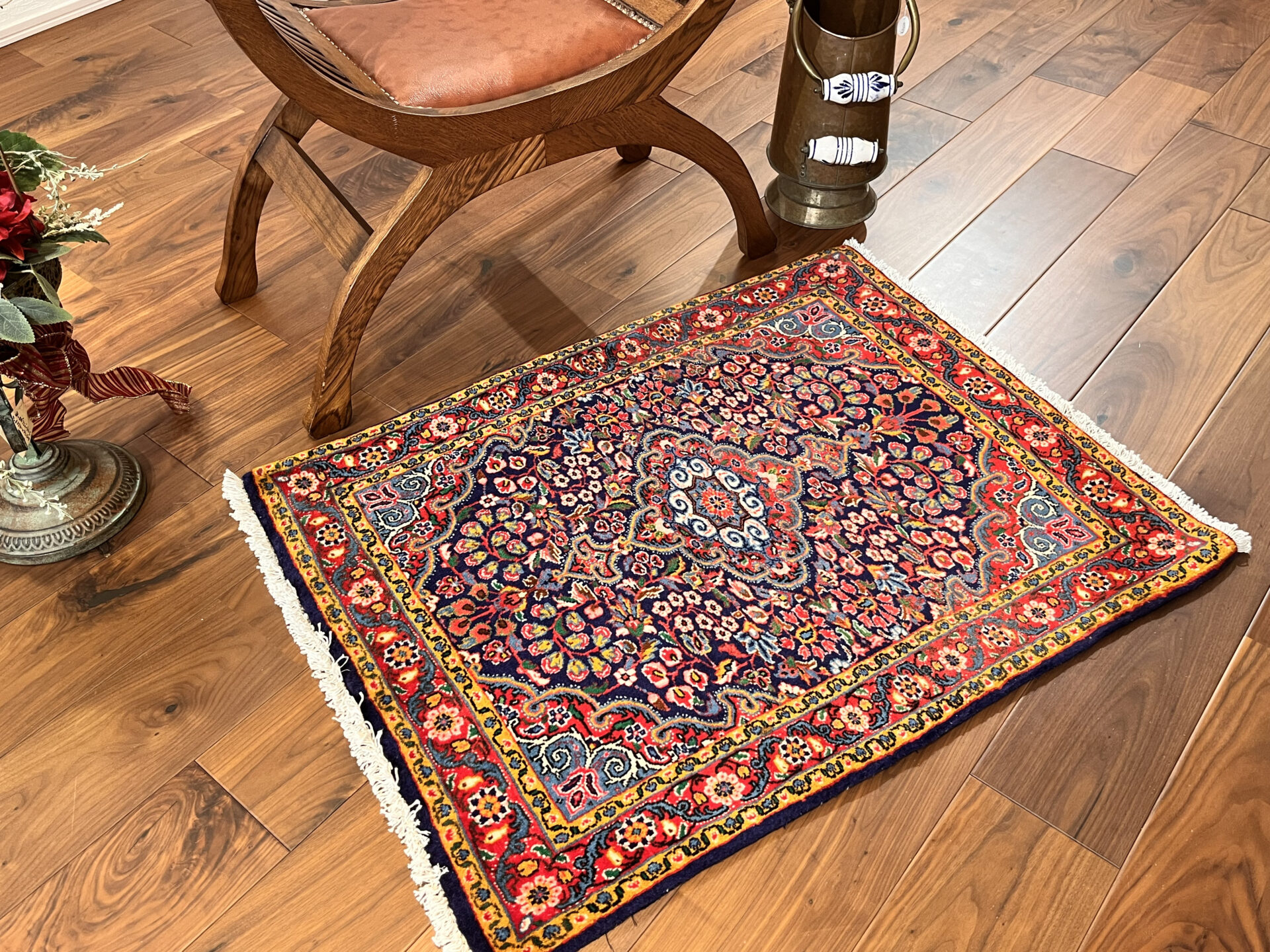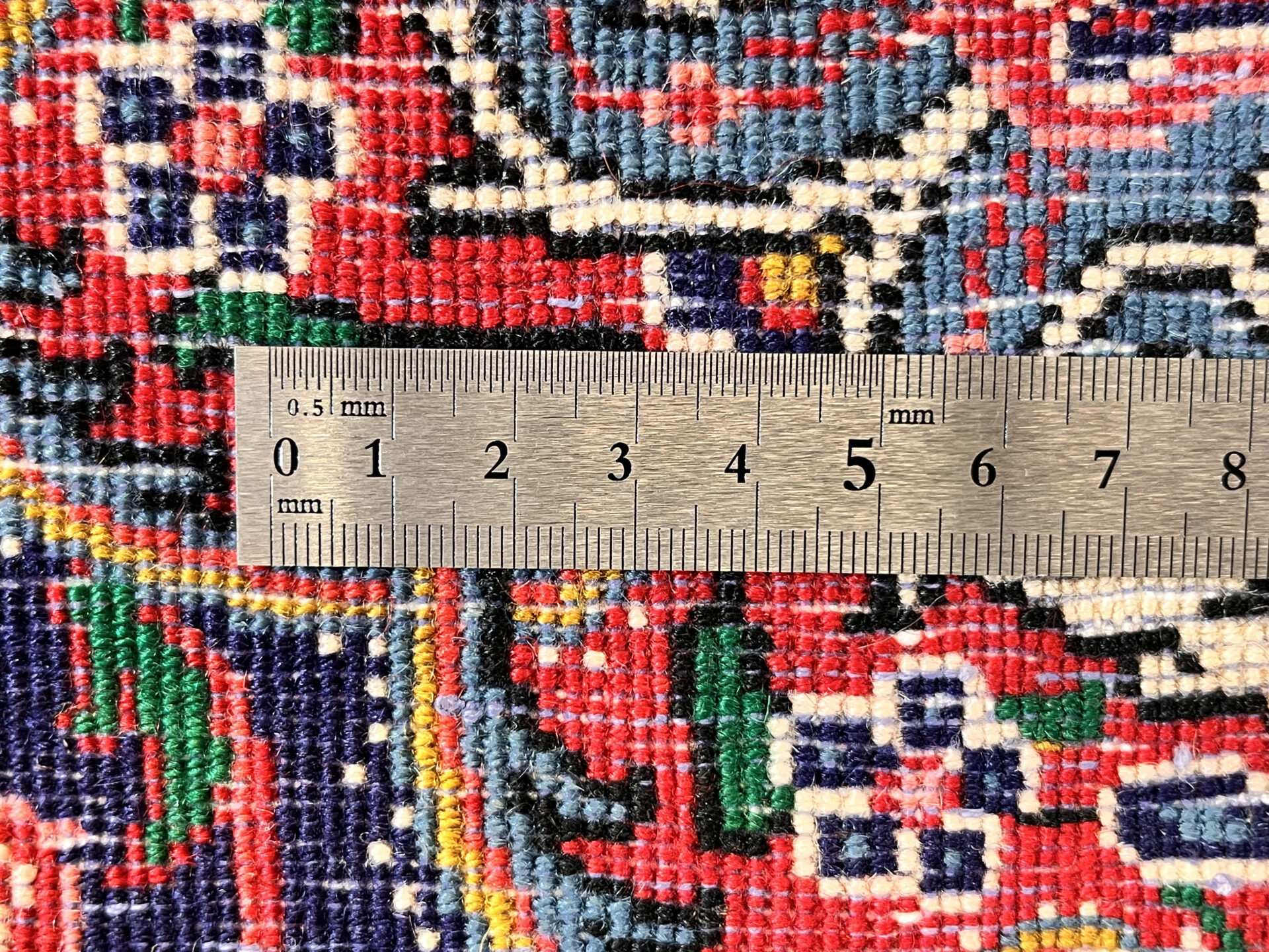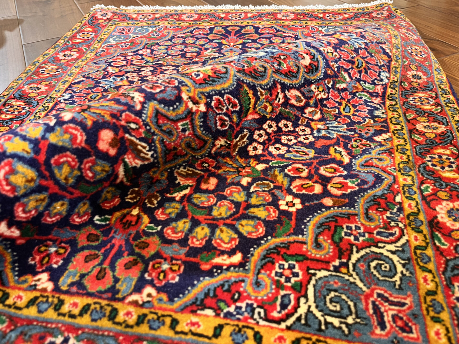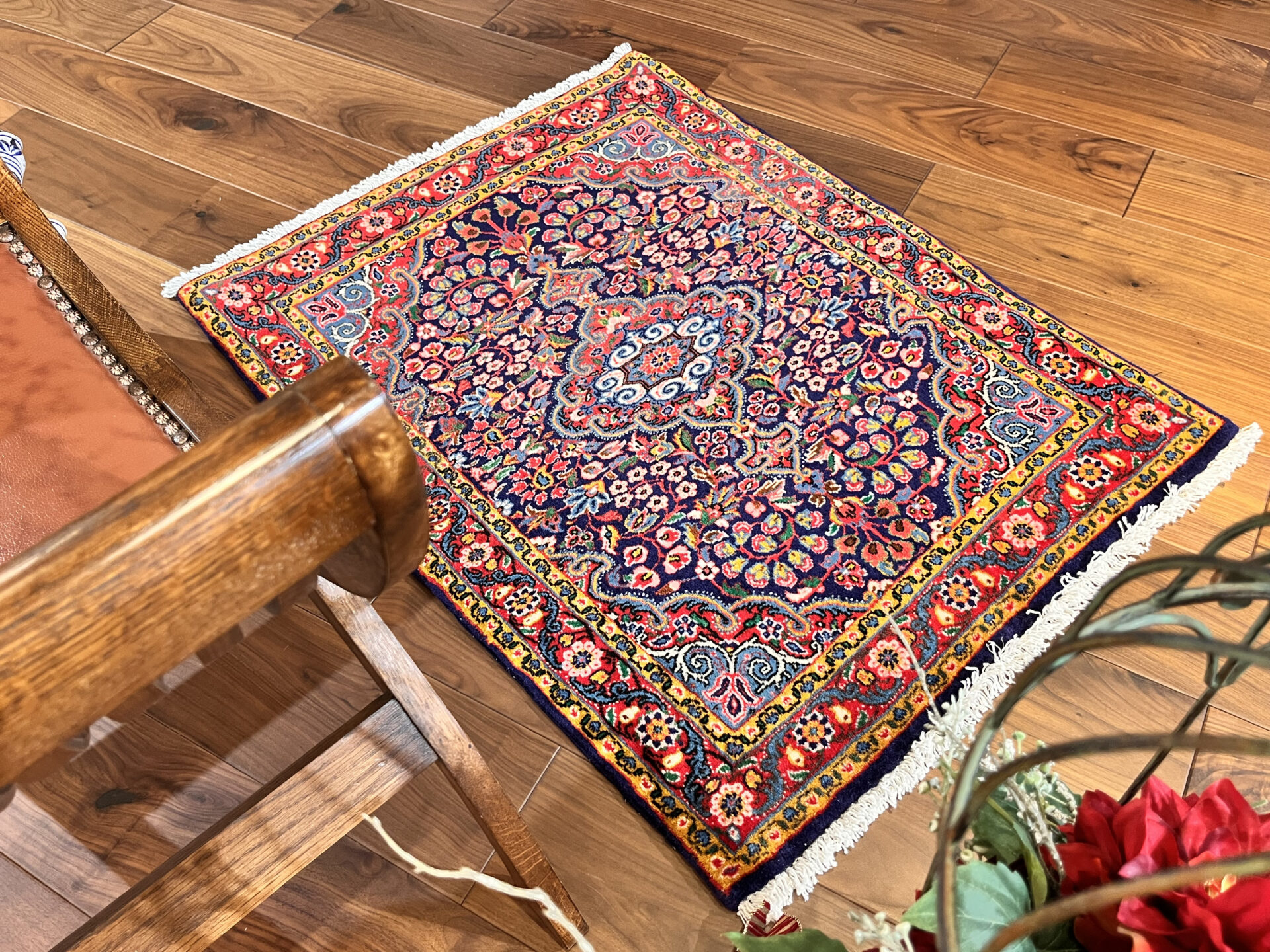 鮮やかな赤や藍を基調に、無数の小花が散りばめられた華やかなビジャーの絨毯。明るい色彩が室内をパッと照らし、足元から空間全体を華やかに演出してくれます。ビジャー特有の強靭な織りはそのままに、花園のようなデザインが柔らかさと優美さを加えています。玄関やベッドサイドなど小さなスペースに敷けば、まるで部屋に一輪の花を飾ったかのような彩りを添えてくれるでしょう。力強さと華やかさを兼ね備えた、日常を明るくしてくれる一枚です。