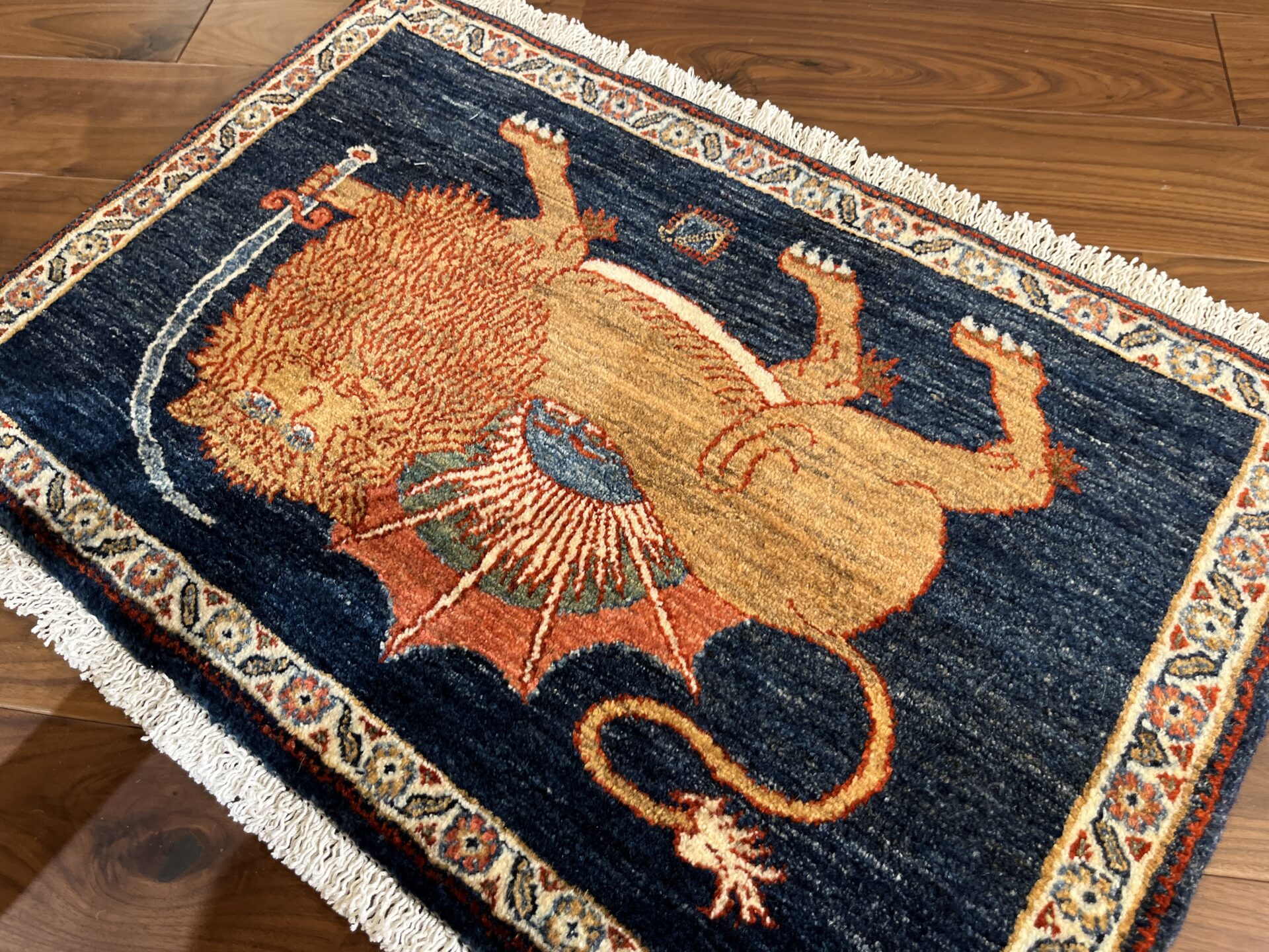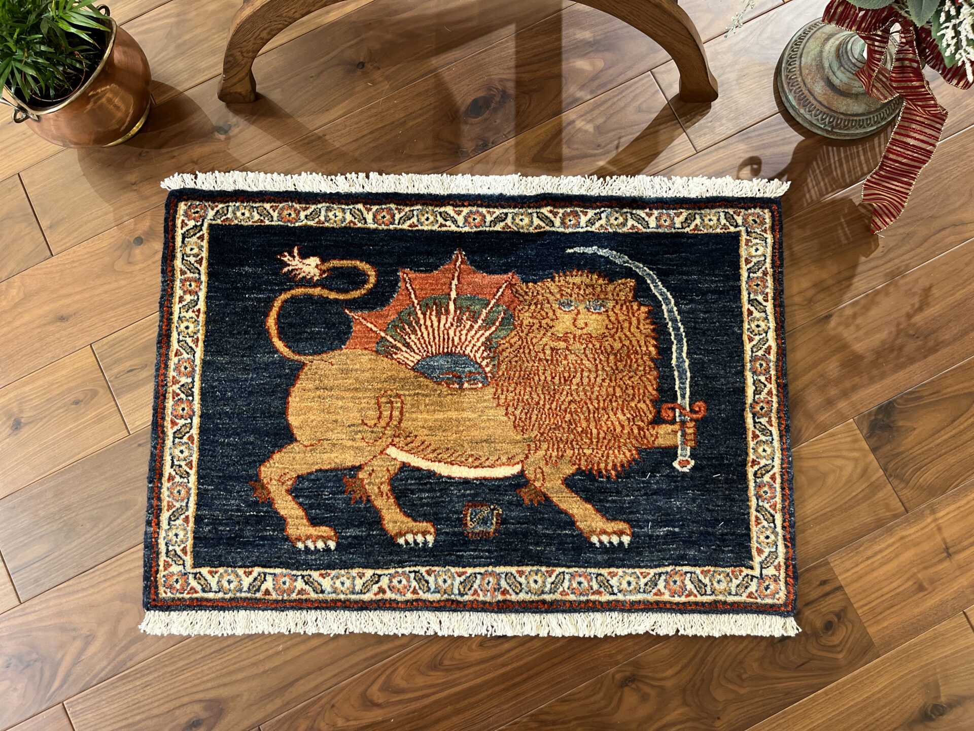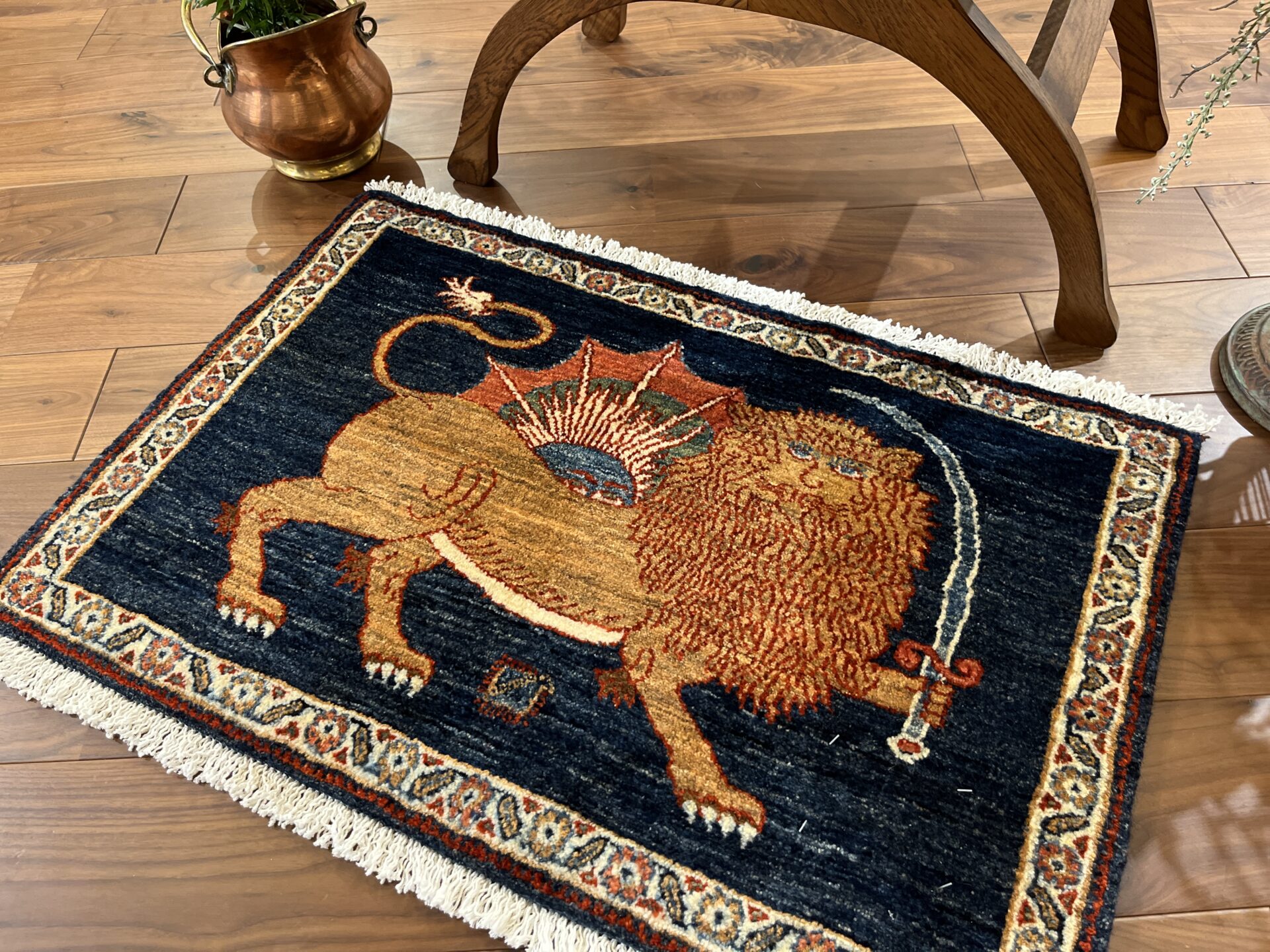 勇気、知恵、力強さなどを象徴する剣を持ったライオンが、太陽を守護するように構えています。
