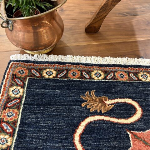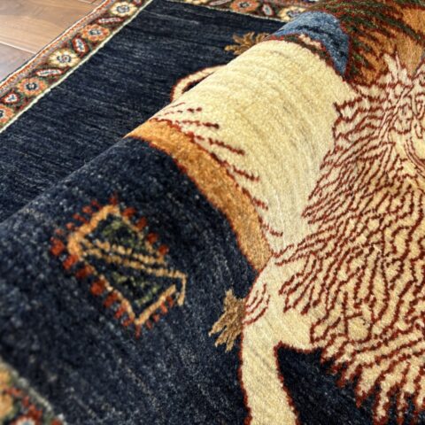 美しく深いインティゴカラーのフィールドに勇気、知恵、力強さなどを象徴する剣を持ったライオンは、存在感あふれる佇まいで、空間に力強さをもたらします。