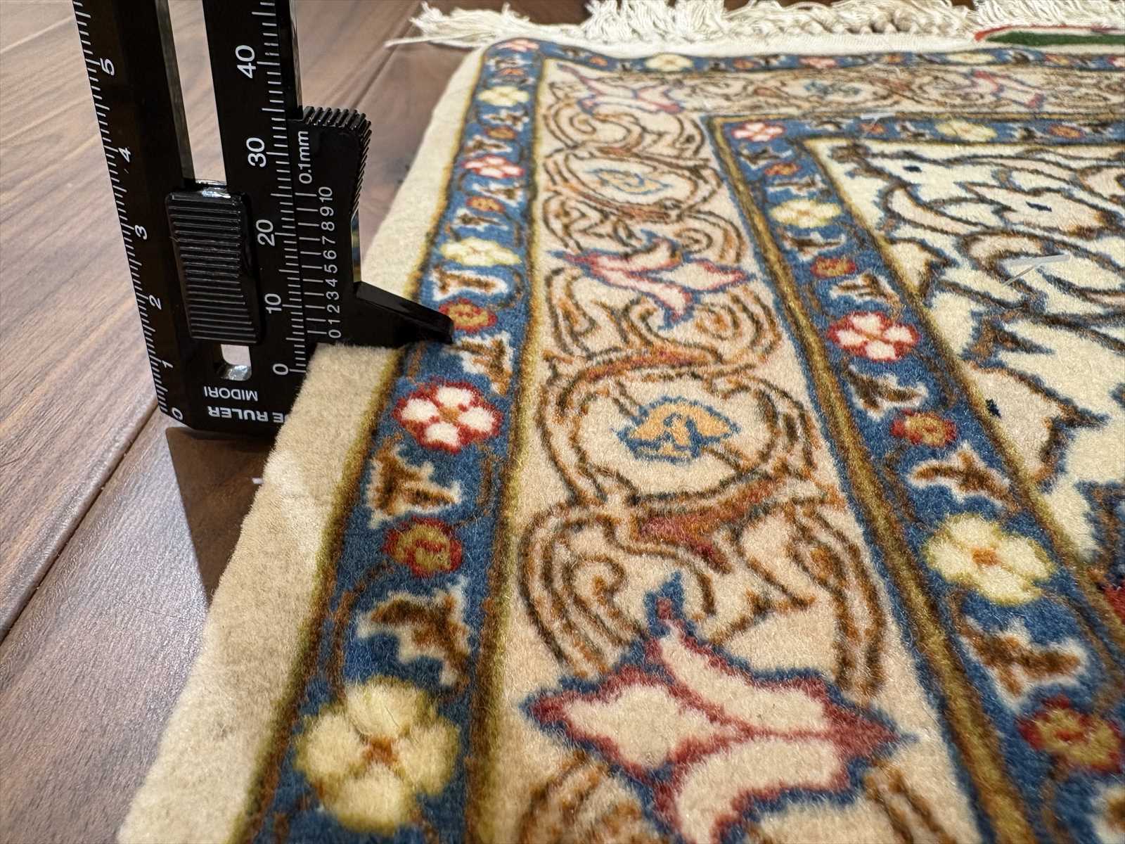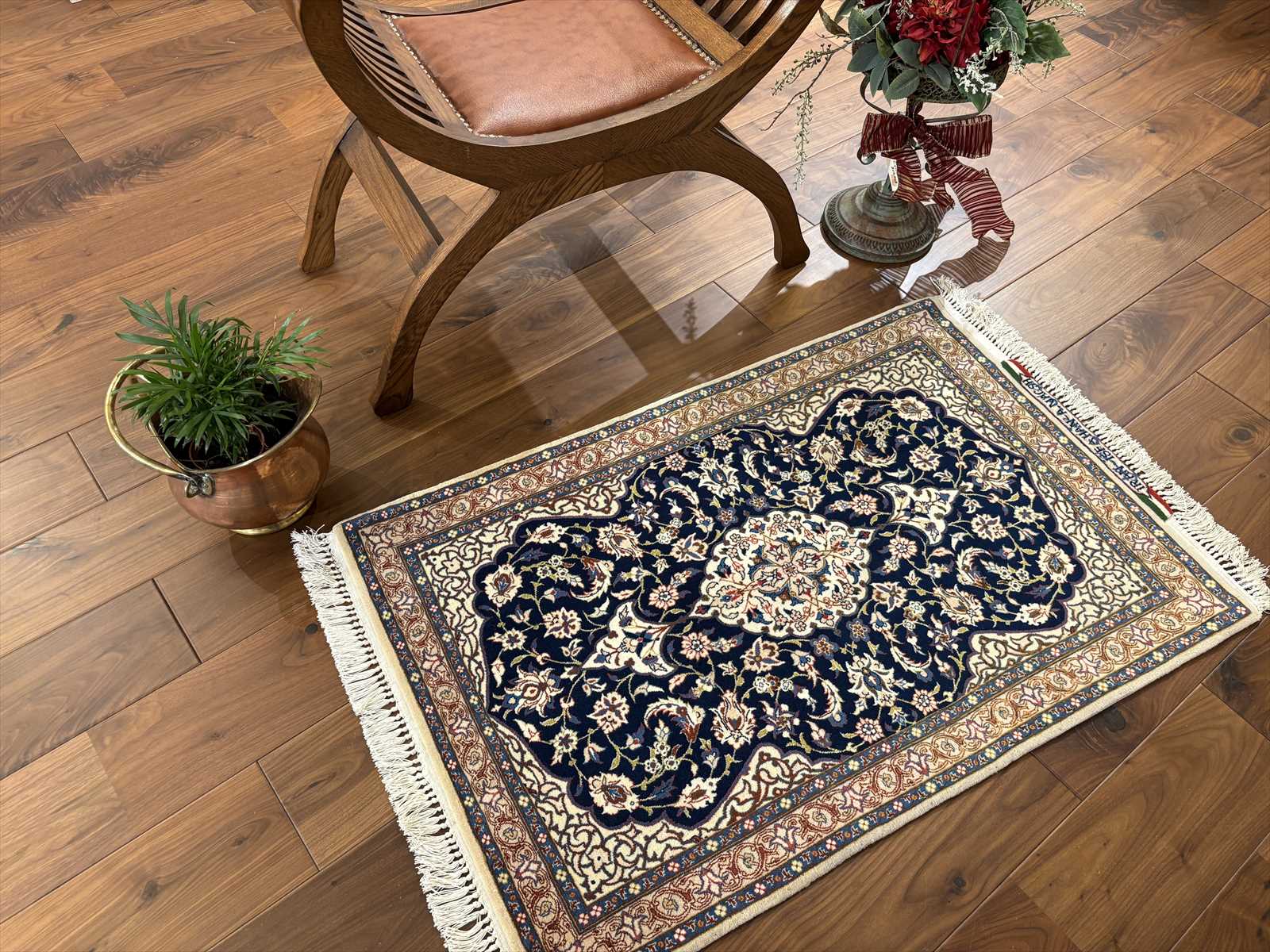 こちらはエスファハン産のペルシャ絨毯。エスファハンは古くから宮廷文化とともに栄えた都市で、絨毯織りの中心地のひとつとして有名です。