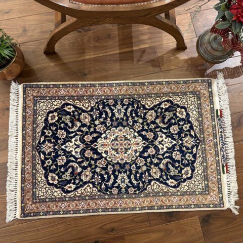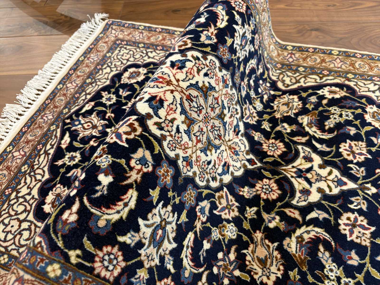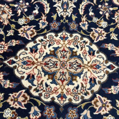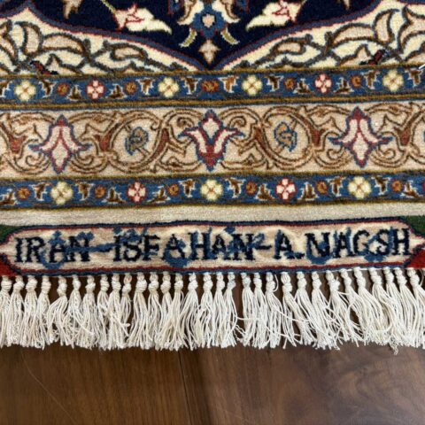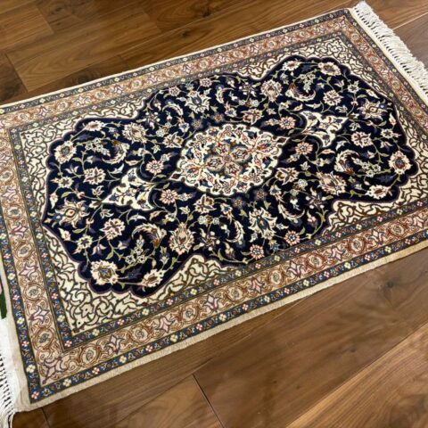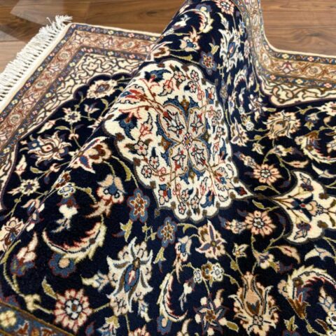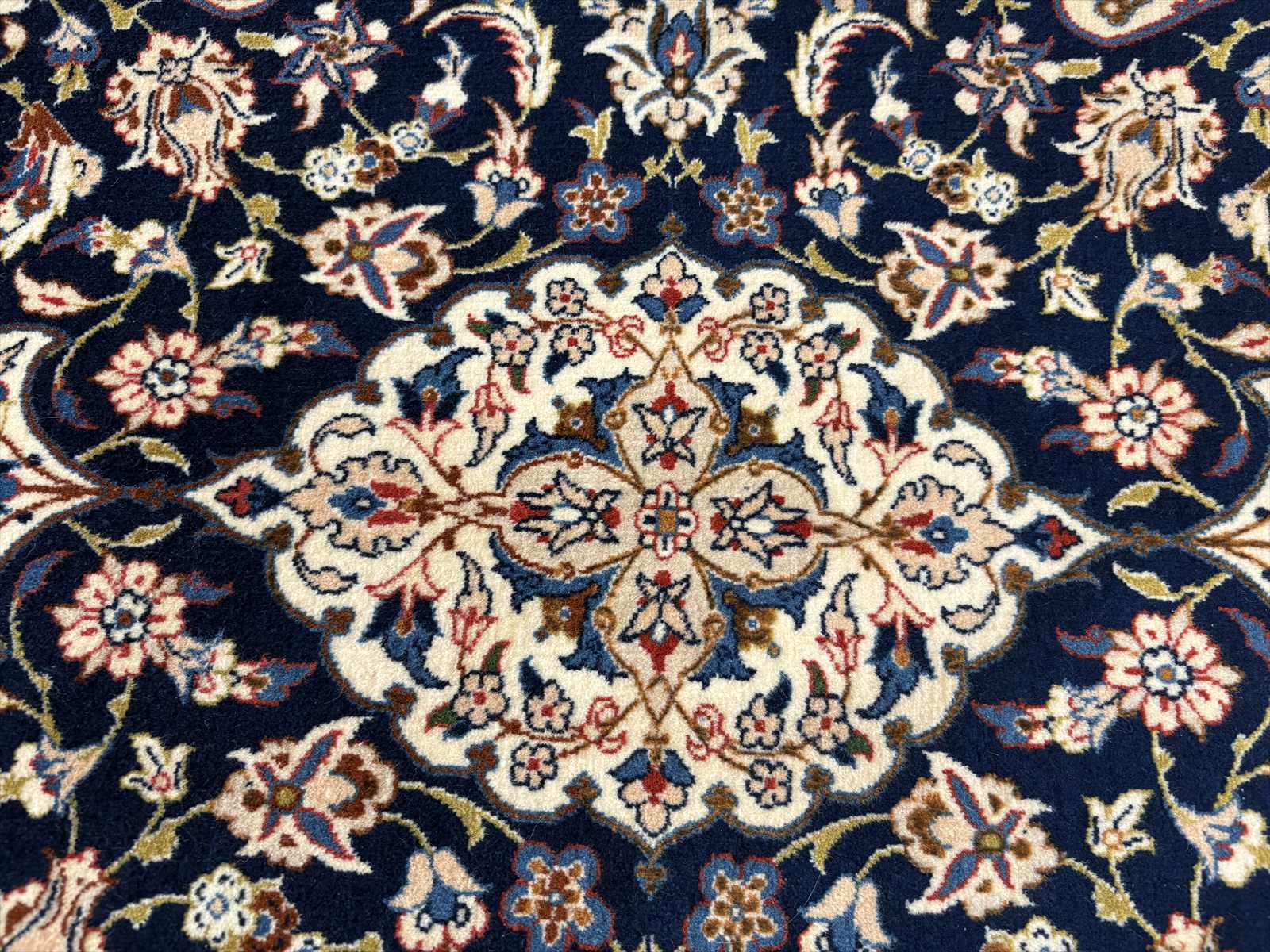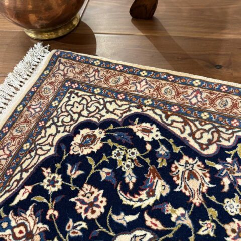 中央にメダリオン(大きな花のモチーフ)を配し、蔓草や花々が四方に広がる典型的なエスファハン文様。濃紺とアイボリーを基調に、赤やベージュの差し色が華やかさを演出しています。