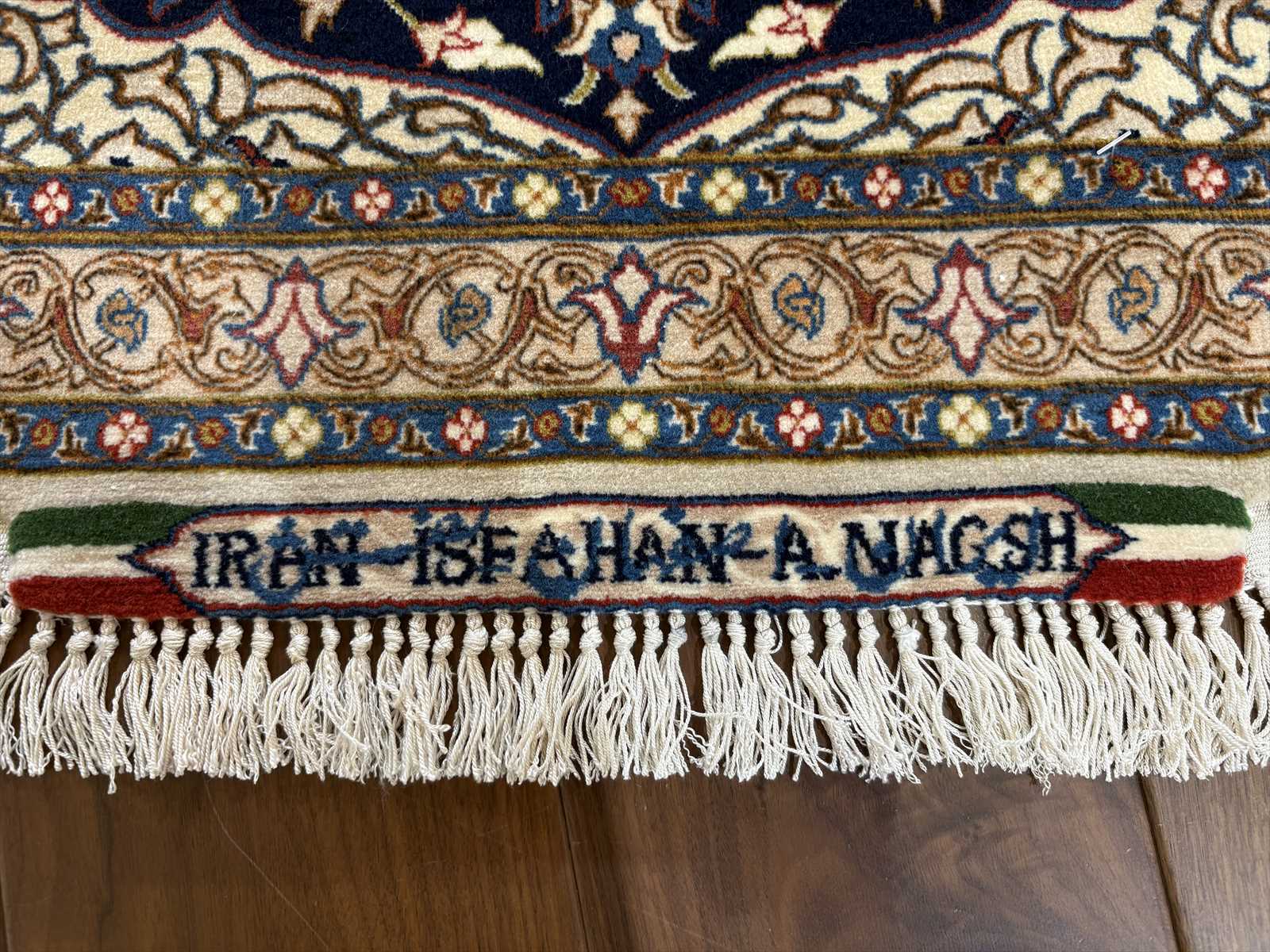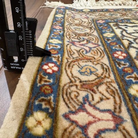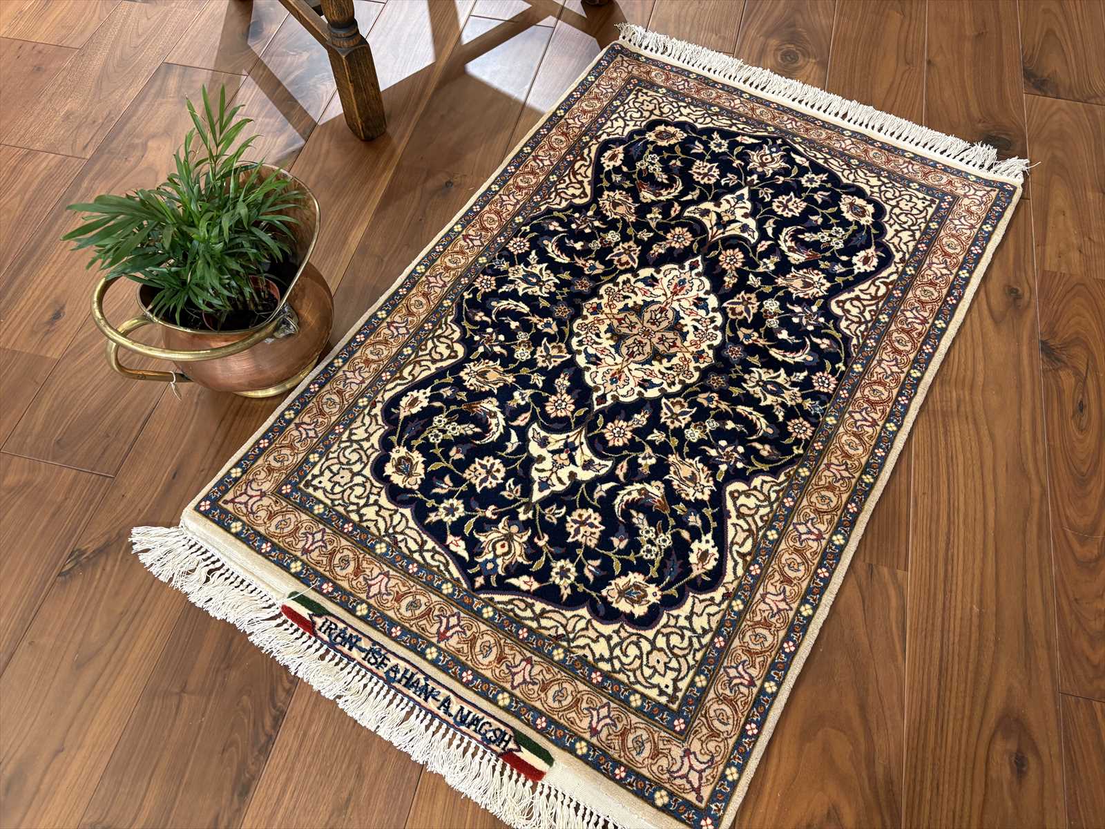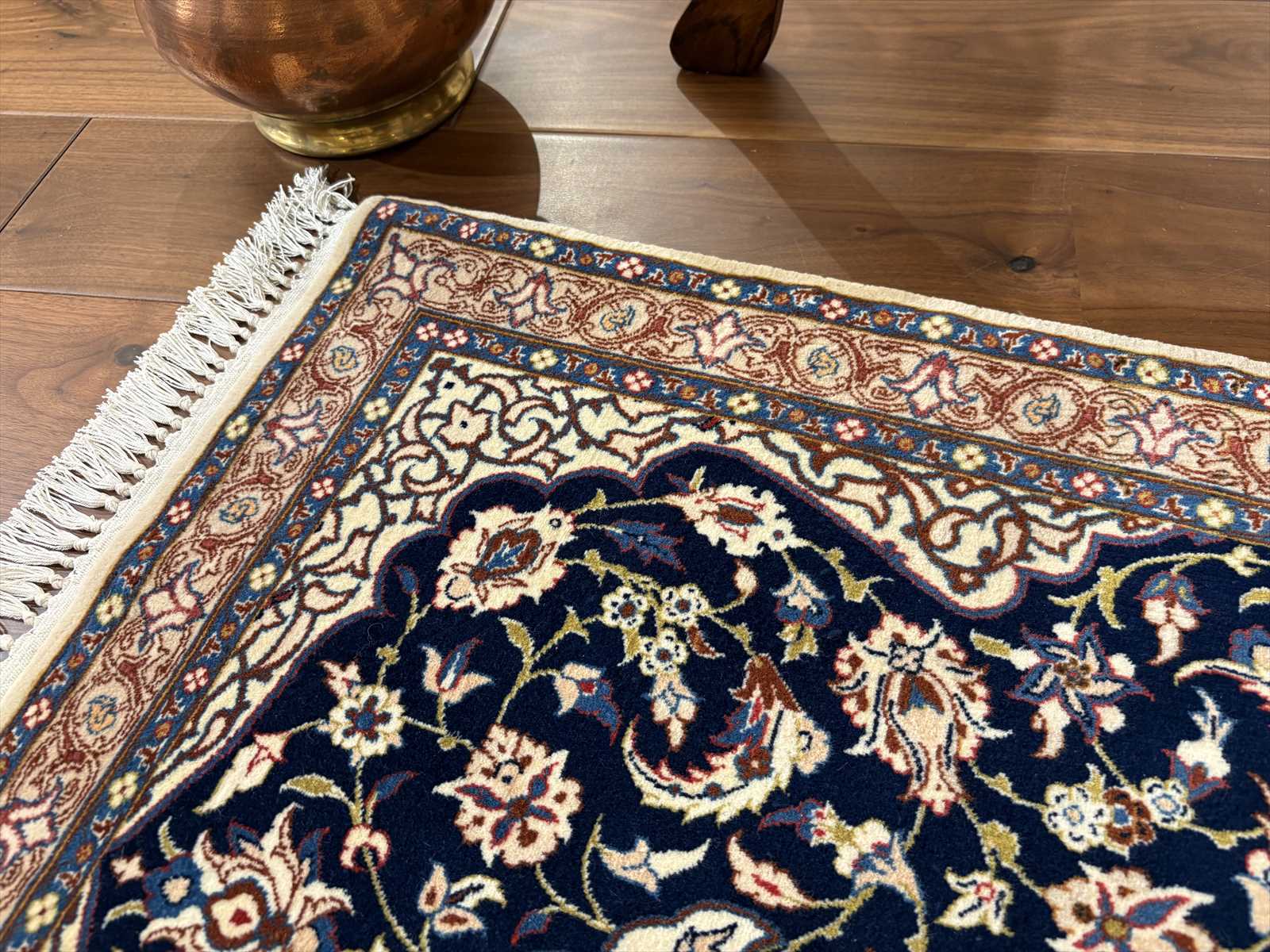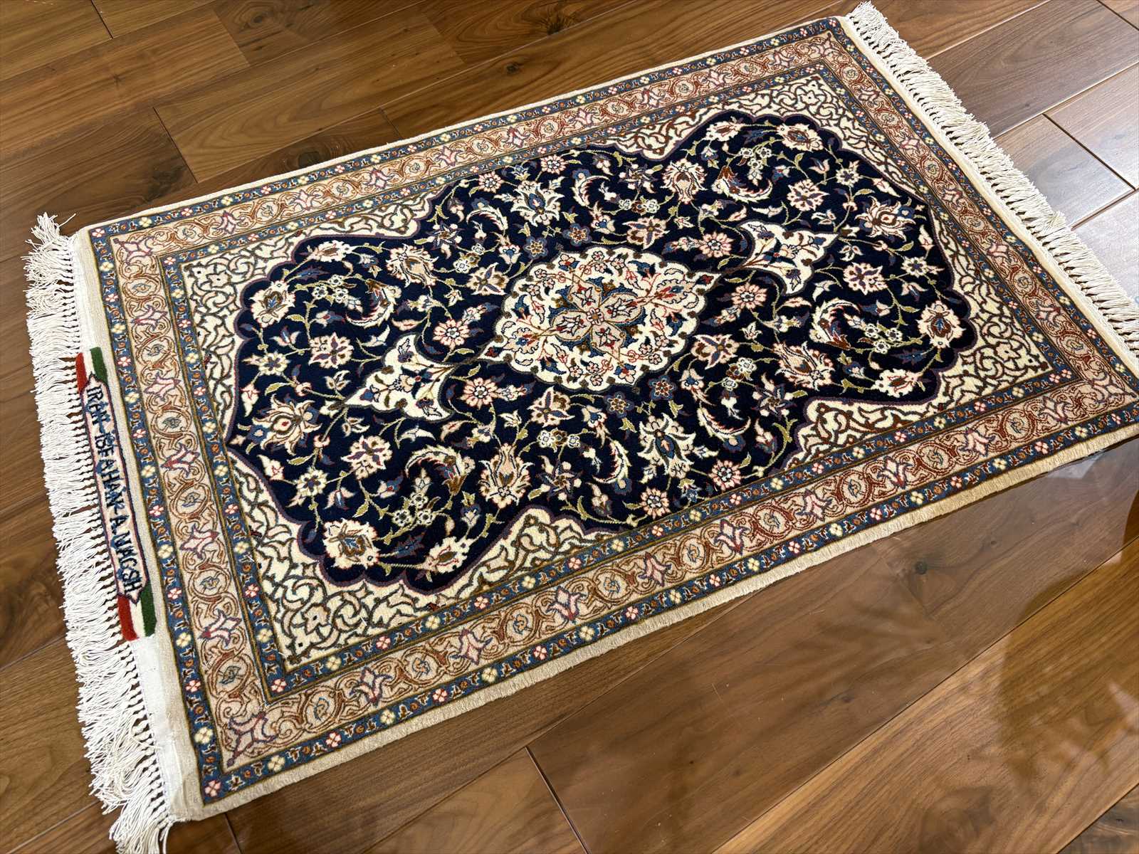 中央にメダリオン(大きな花のモチーフ)を配し、蔓草や花々が四方に広がる典型的なエスファハン文様。濃紺とアイボリーを基調に、赤やベージュの差し色が華やかさを演出しています。