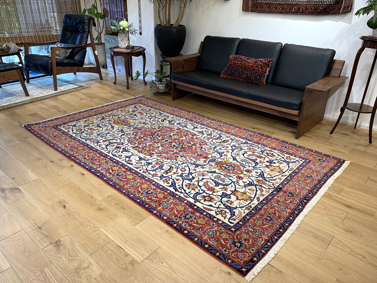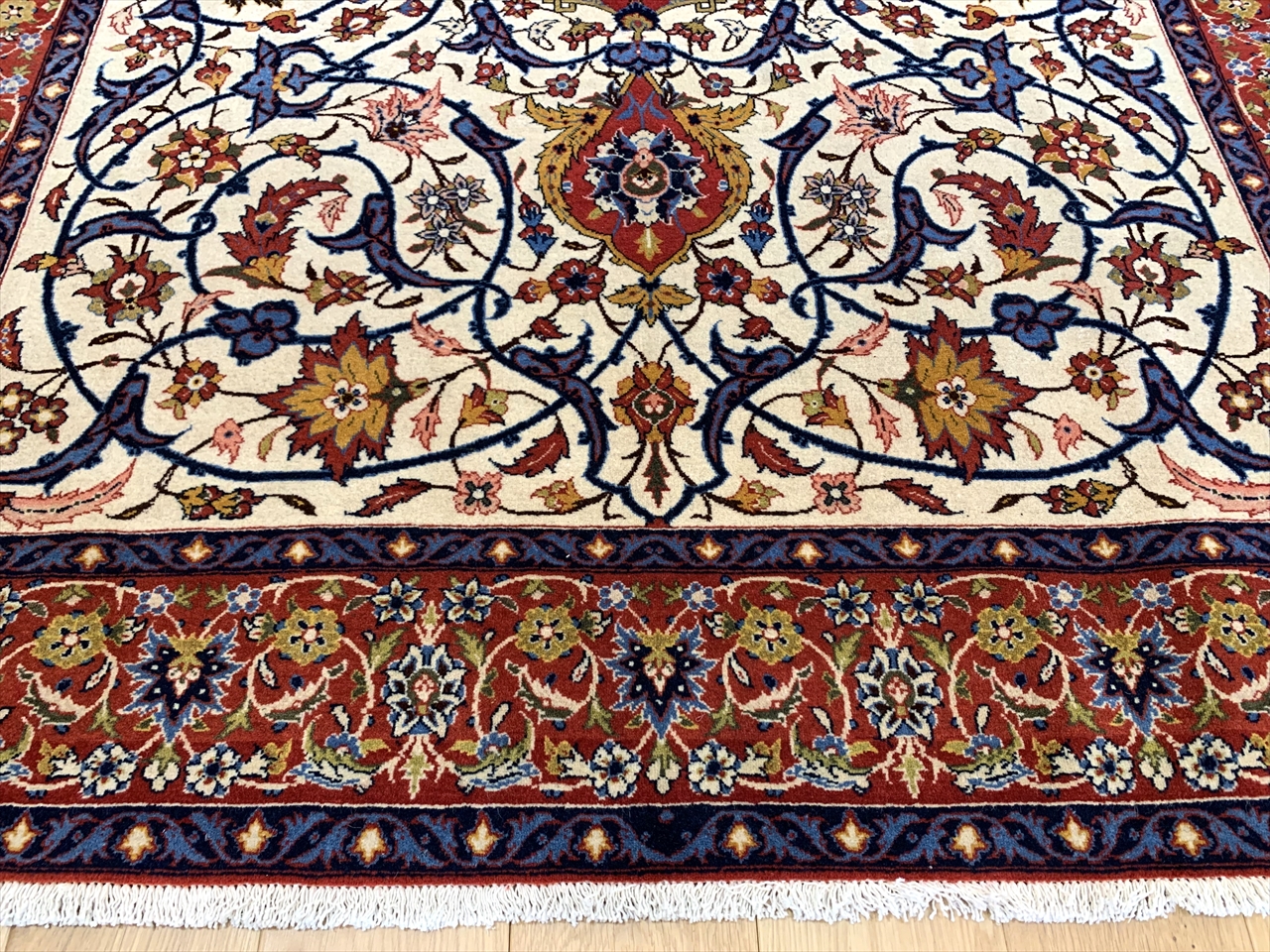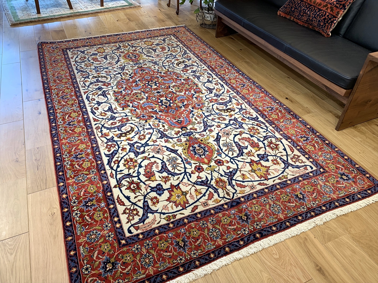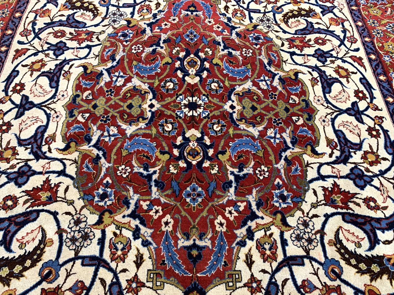 中央に広がるメダリオンを基調とし、白地には流れるような花唐草文様が細密に織り込まれています。そこに鮮やかな赤がアクセントを添え、さらに濃紺のラインが全体を引き締めています。