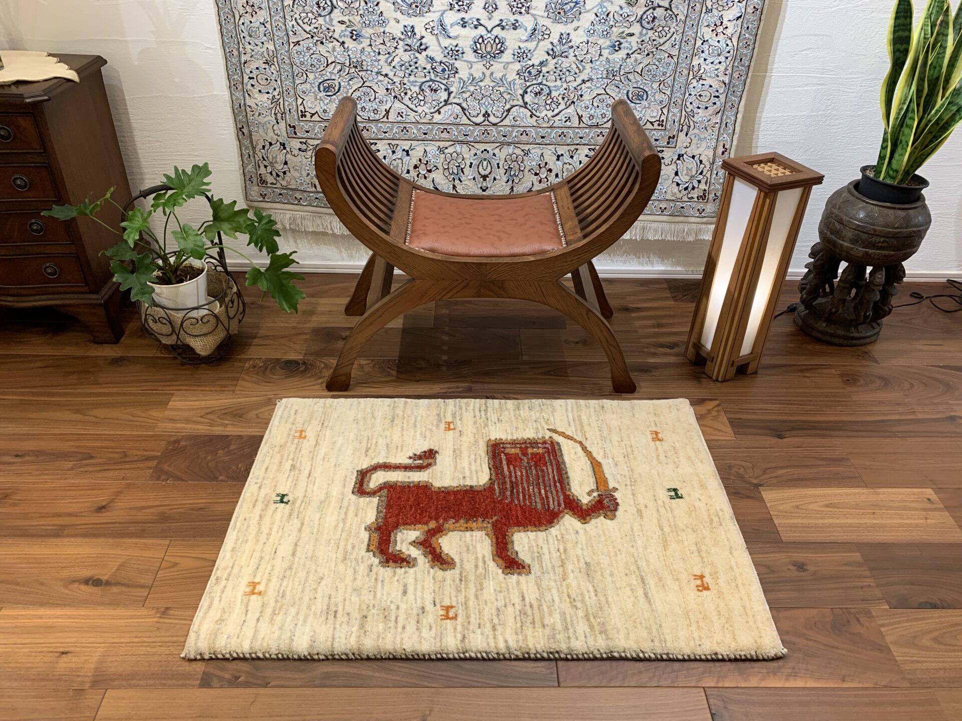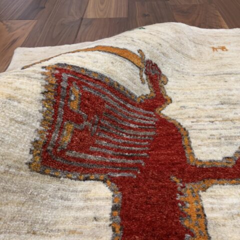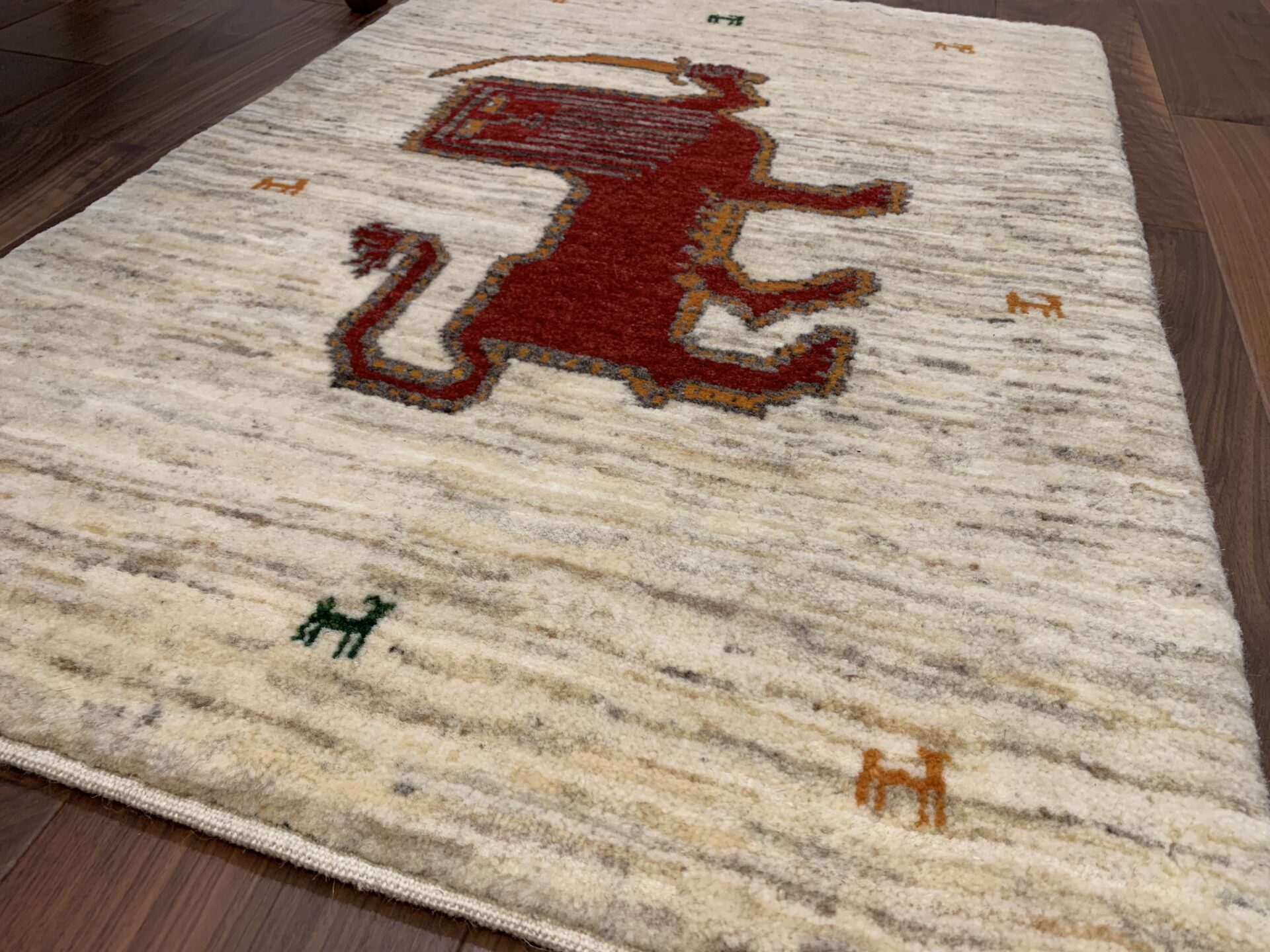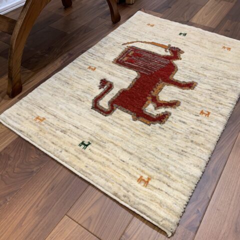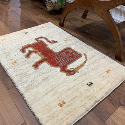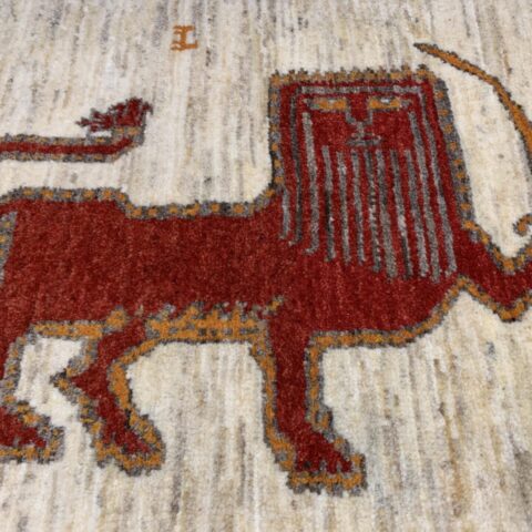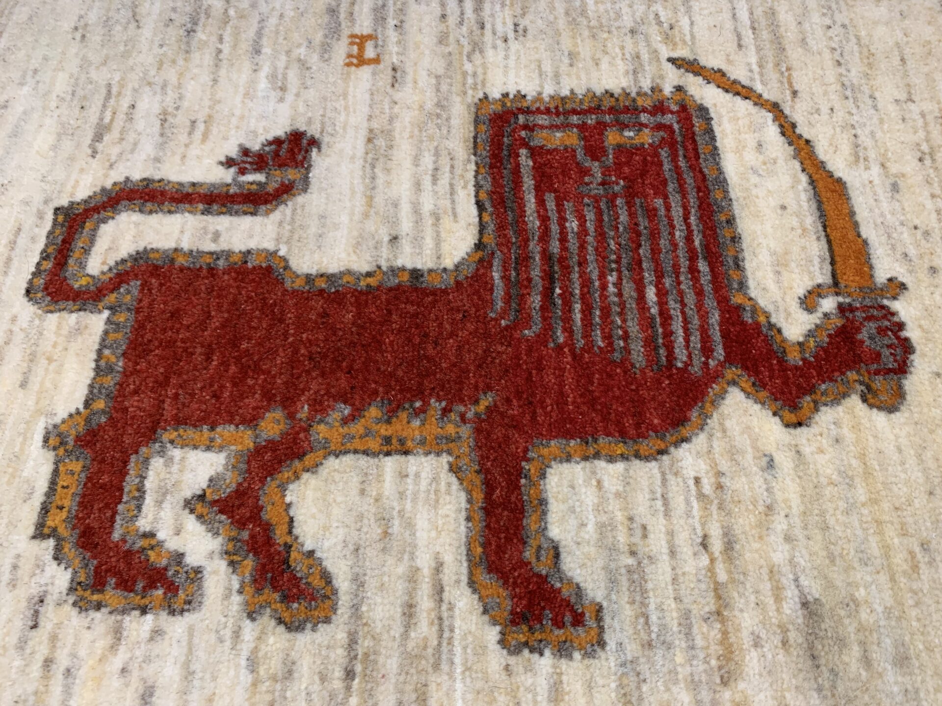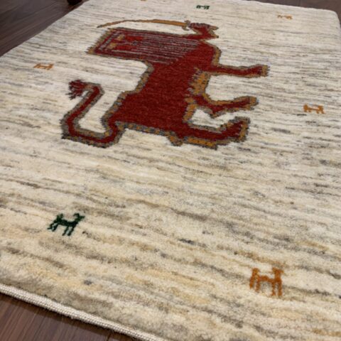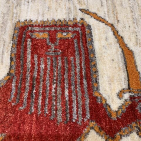 堂々たる姿で織り上げられた「サーベルライオン紋様」のギャッベです。
