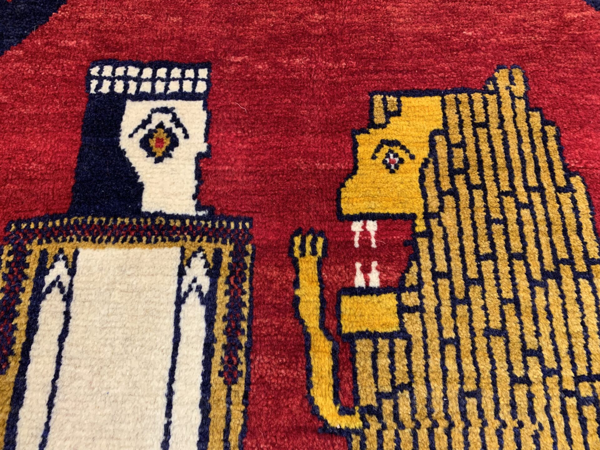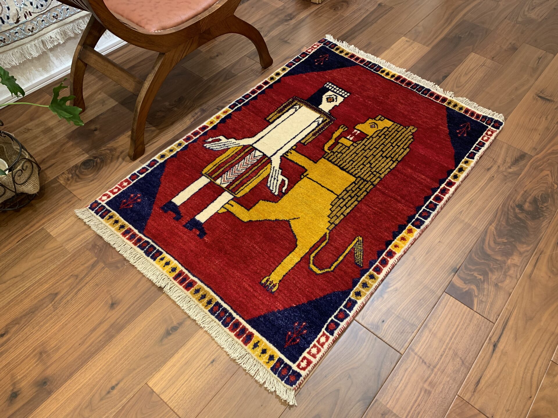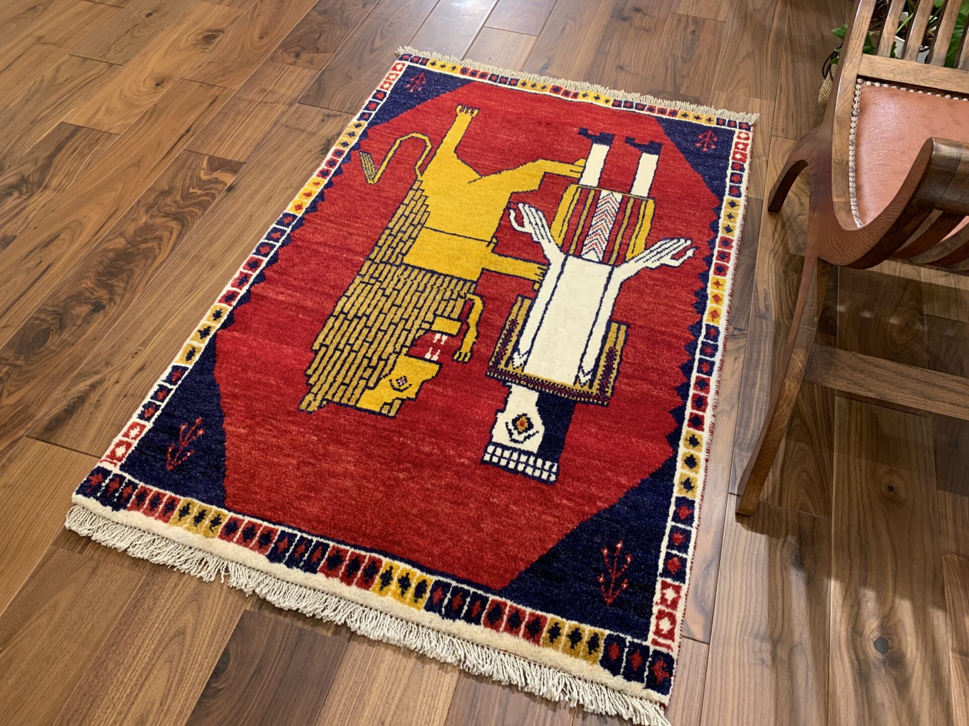 鮮やかな茜色のフィールドに、黄金のライオンと人の姿を織り込んだギャッベです。