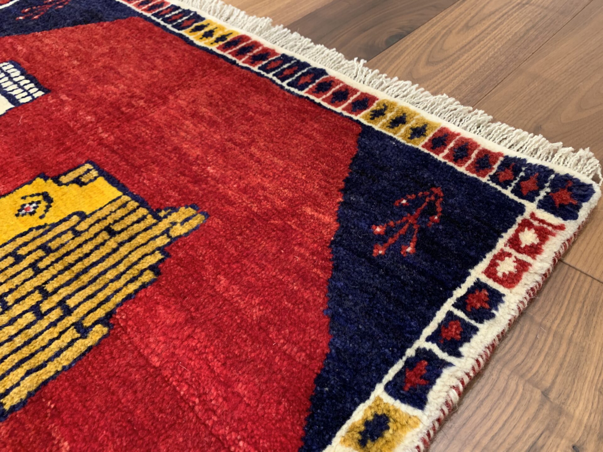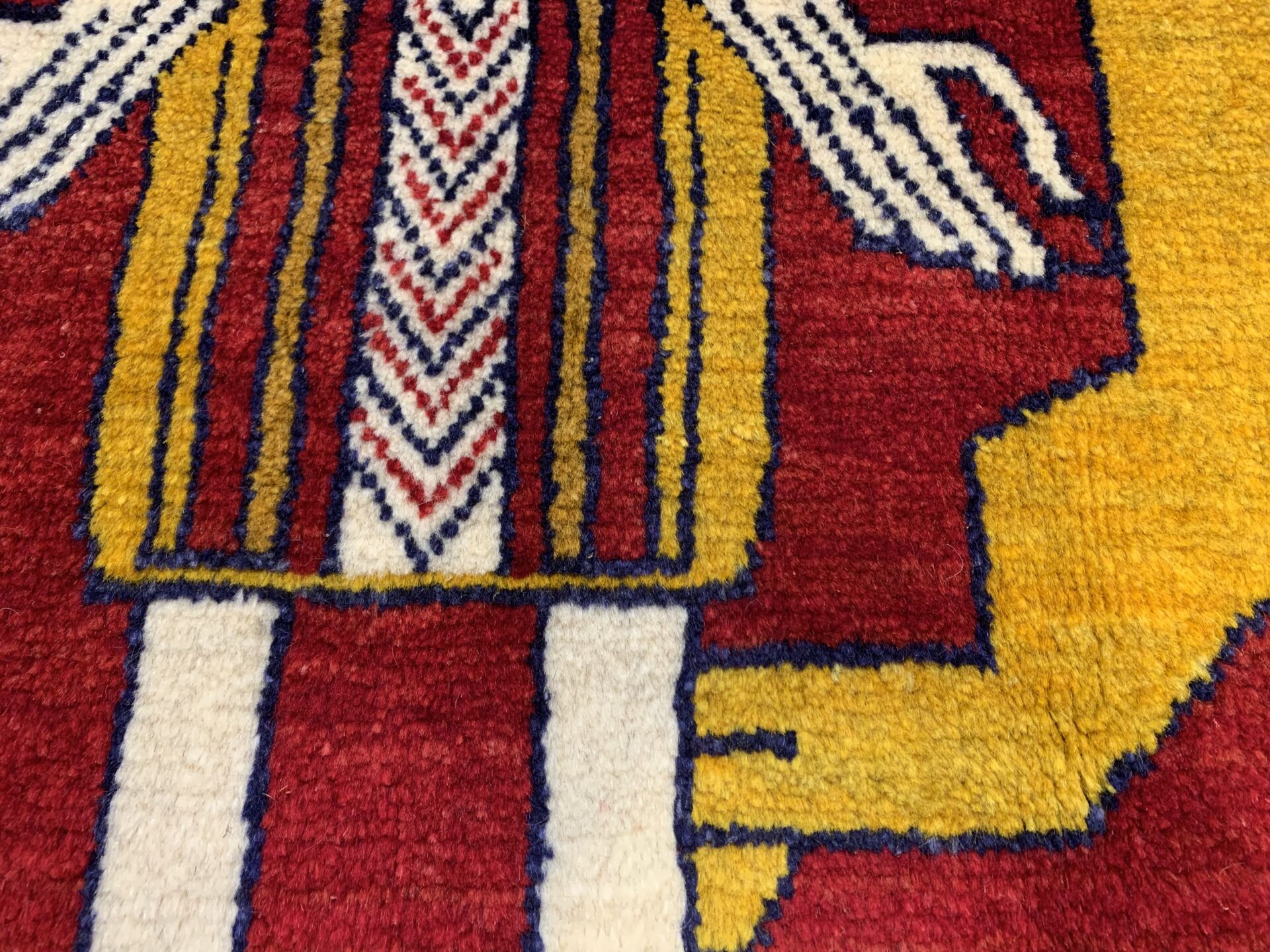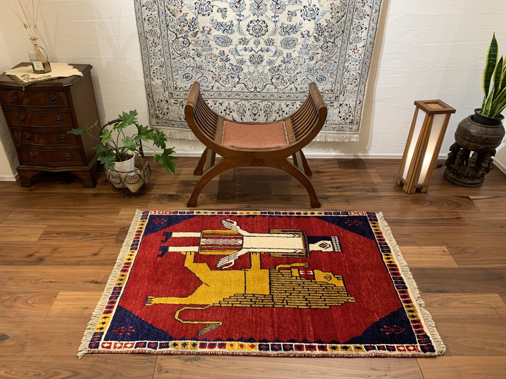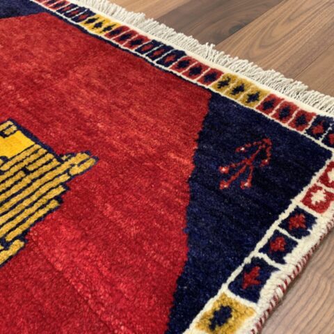 鮮やかな茜色のフィールドに、黄金のライオンと人の姿を織り込んだギャッベです。