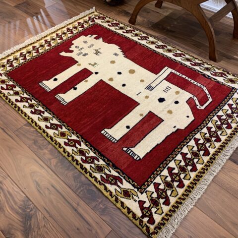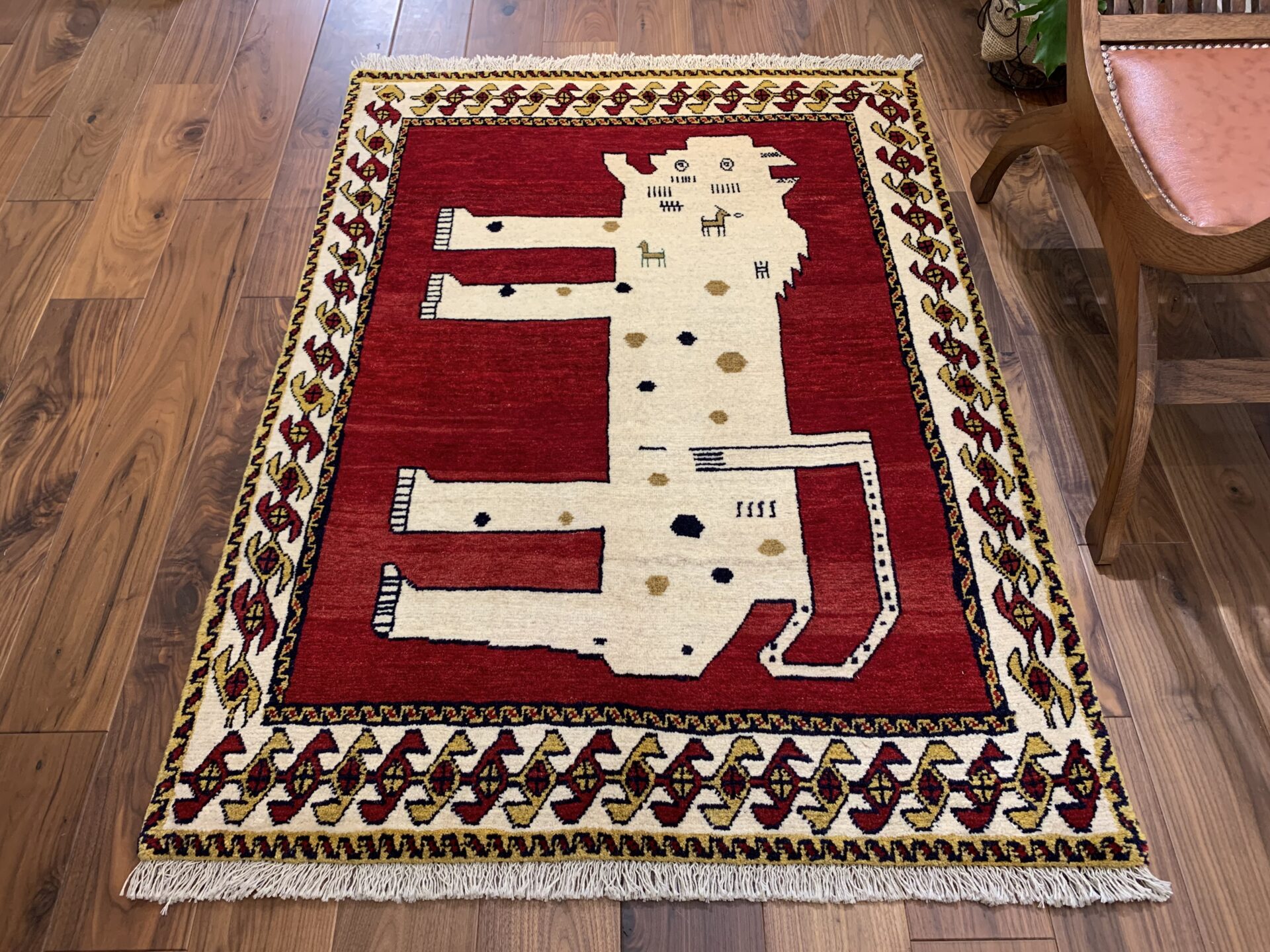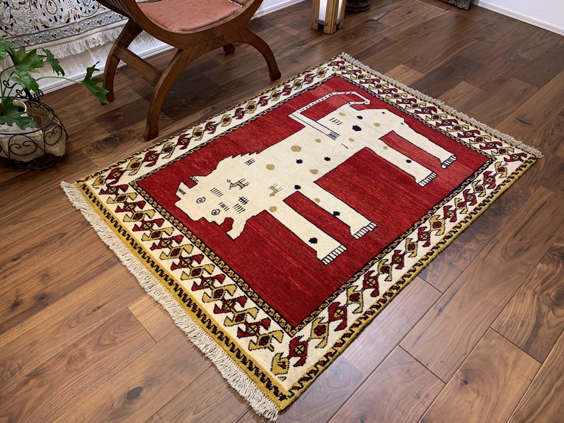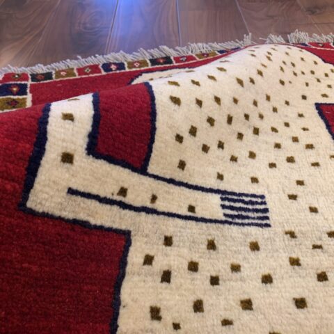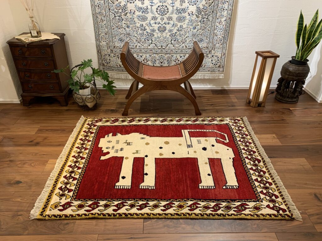 遊牧民の祈りや自然への感謝が込められた、世界に一枚だけのギャッベ。力強さと愛嬌を併せ持ち、お部屋に特別な物語を添える存在感ある一枚です。