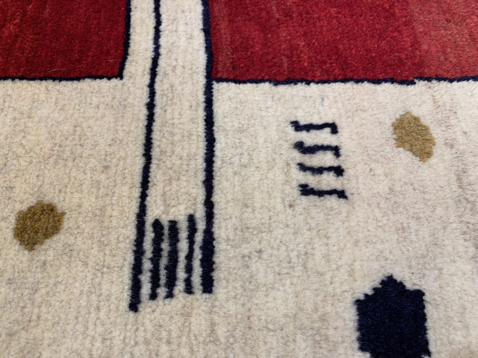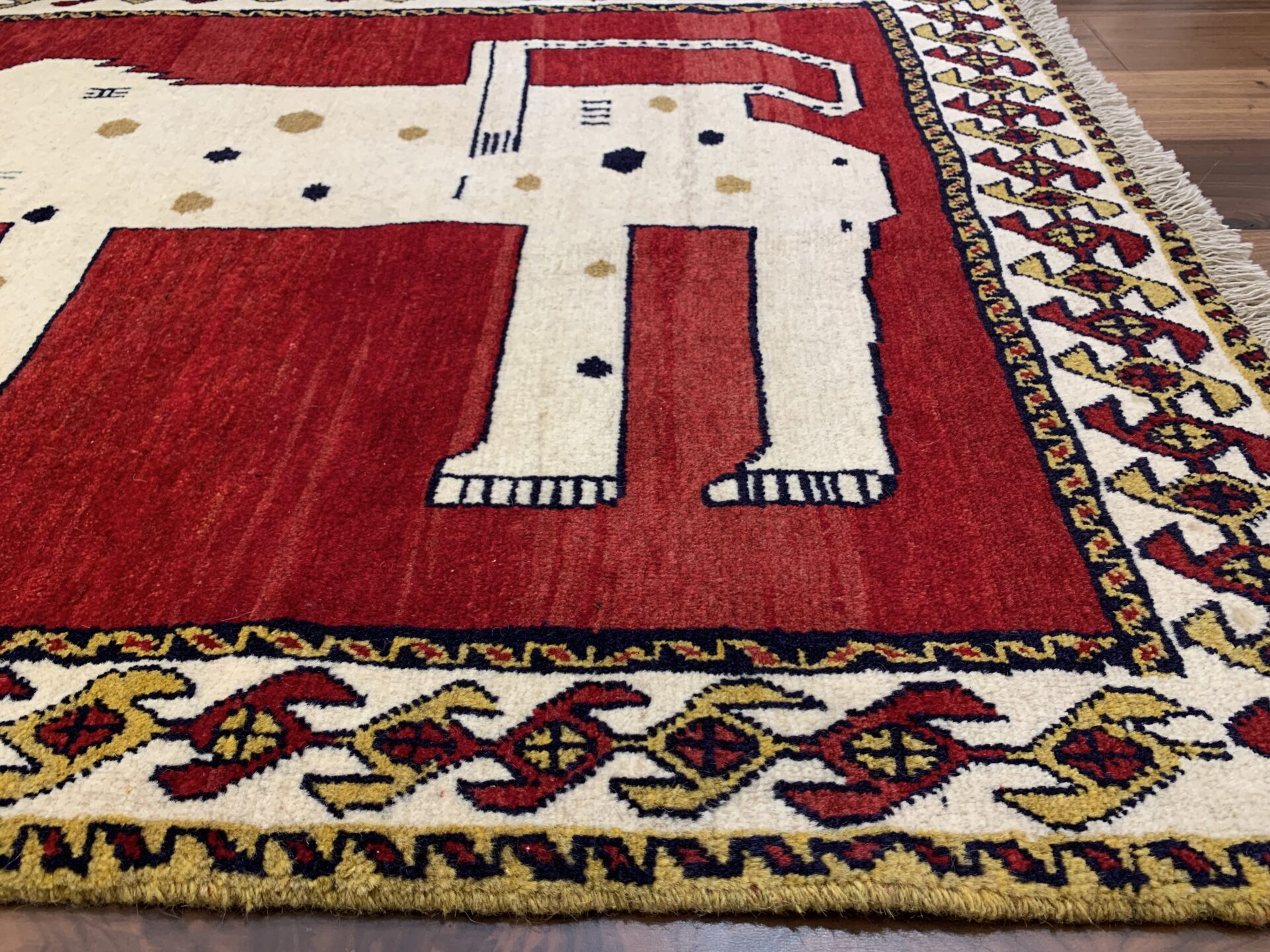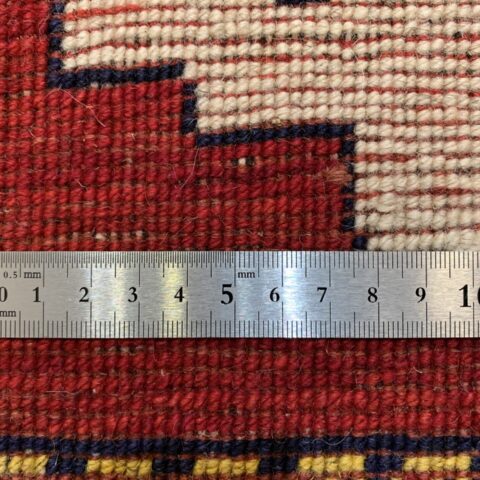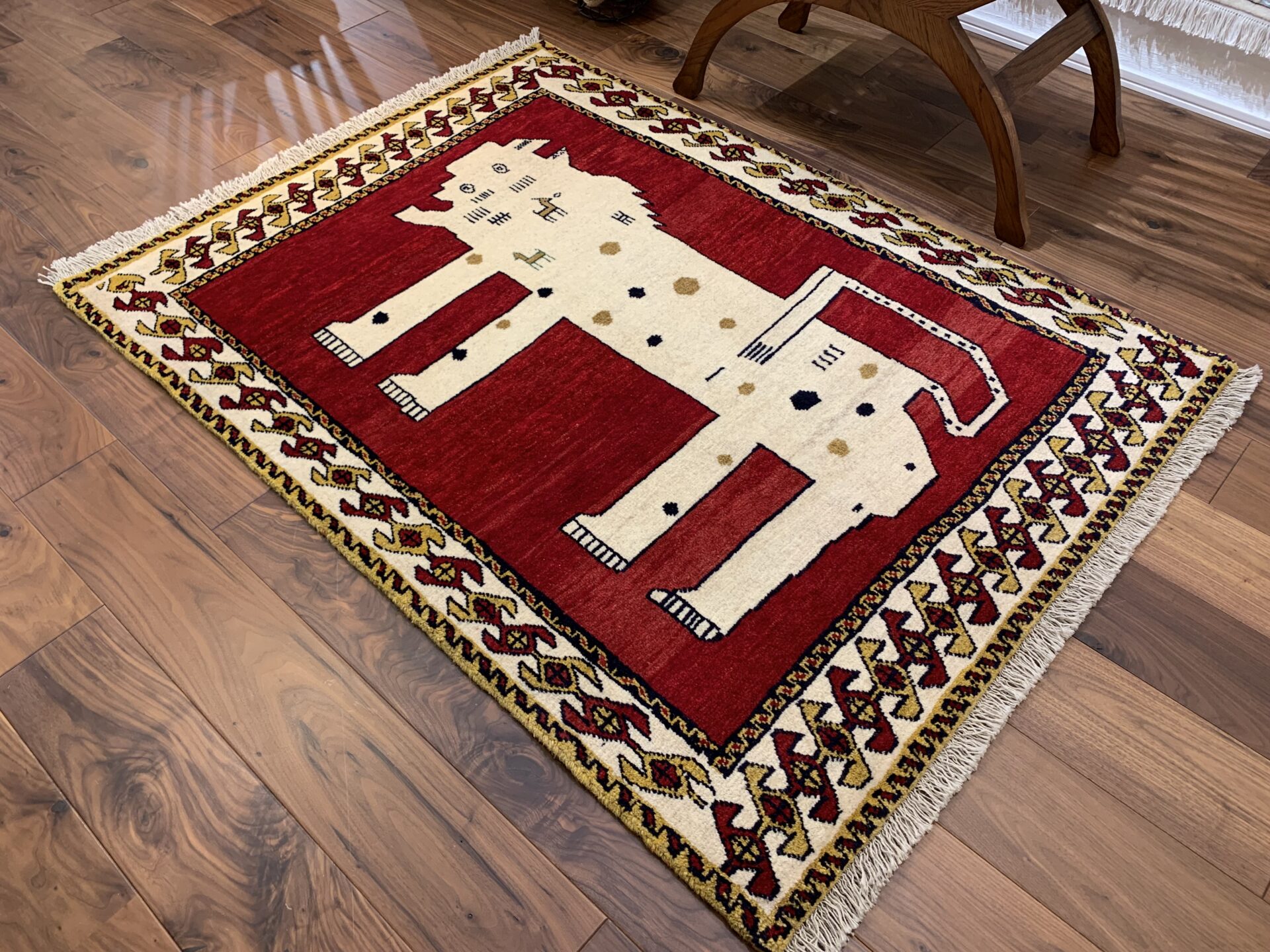 遊牧民の祈りや自然への感謝が込められた、世界に一枚だけのギャッベ。力強さと愛嬌を併せ持ち、お部屋に特別な物語を添える存在感ある一枚です。