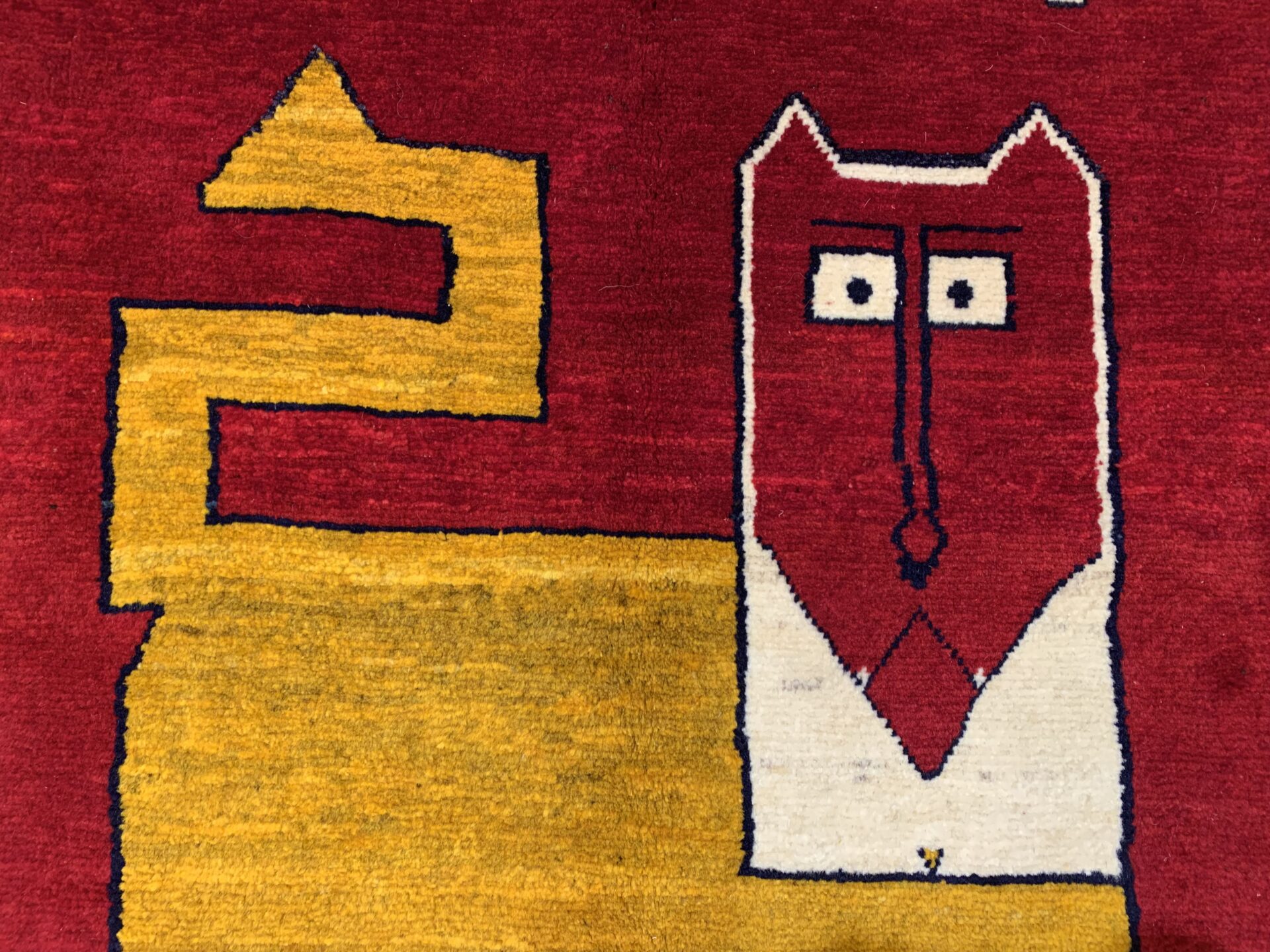 大胆でユーモラスなライオンの姿に、鳥たちの穏やかな存在感が加わり、遊牧民の祈りや日常の喜びが織り込まれた唯一無二の一枚となっています。