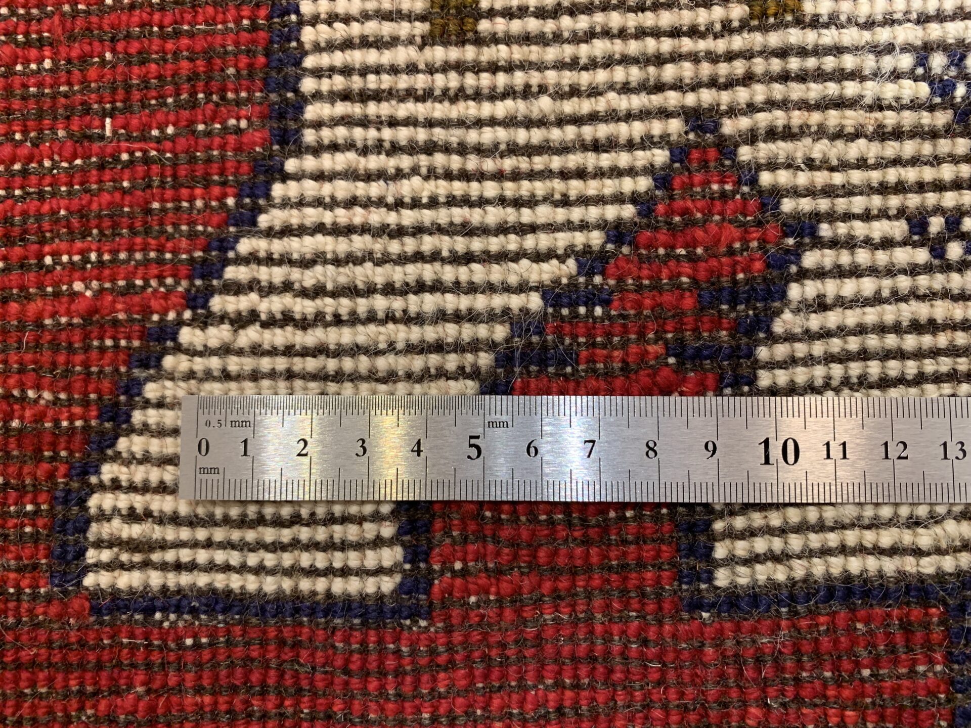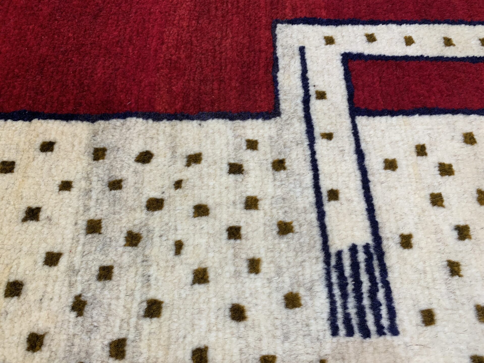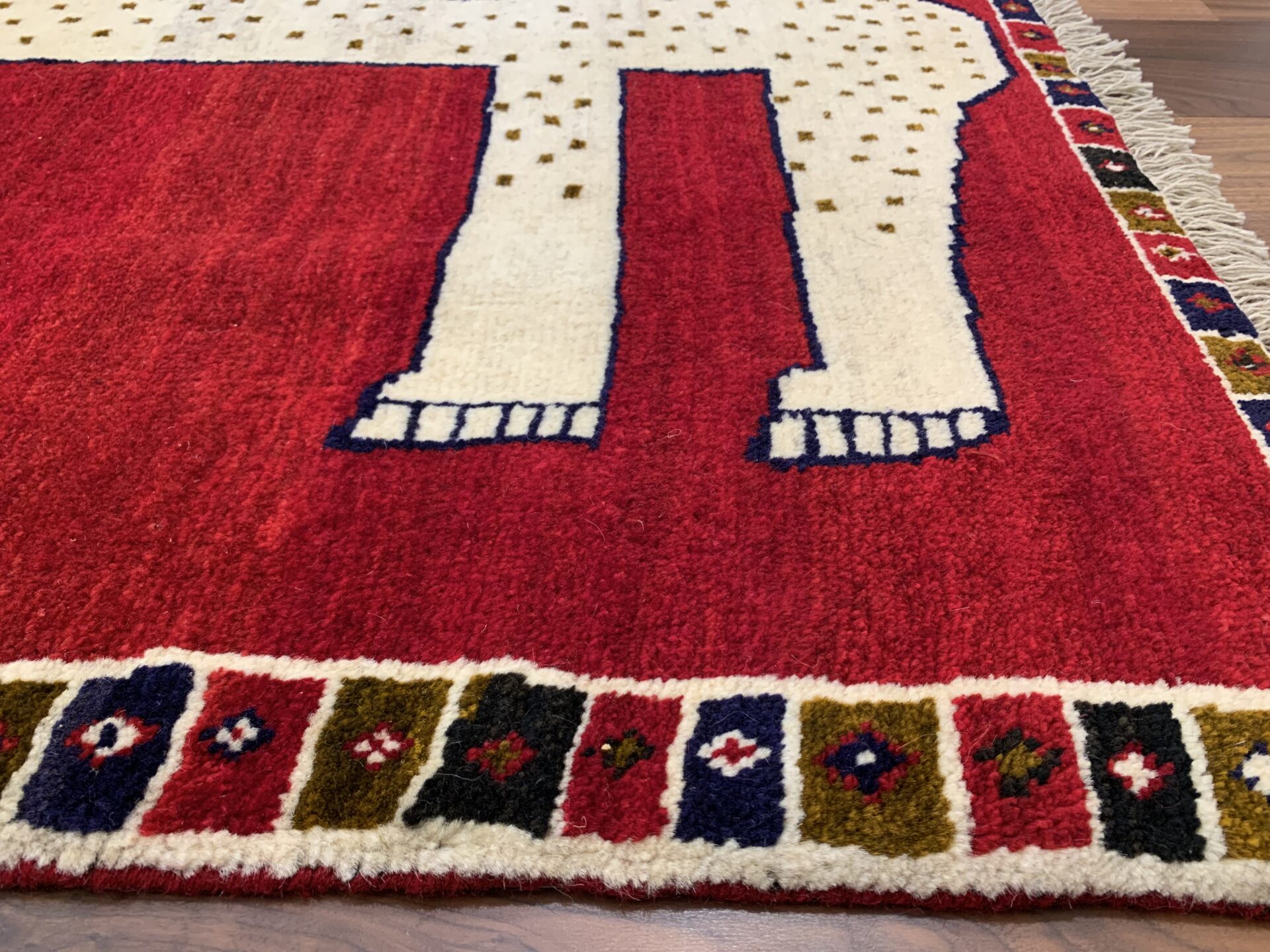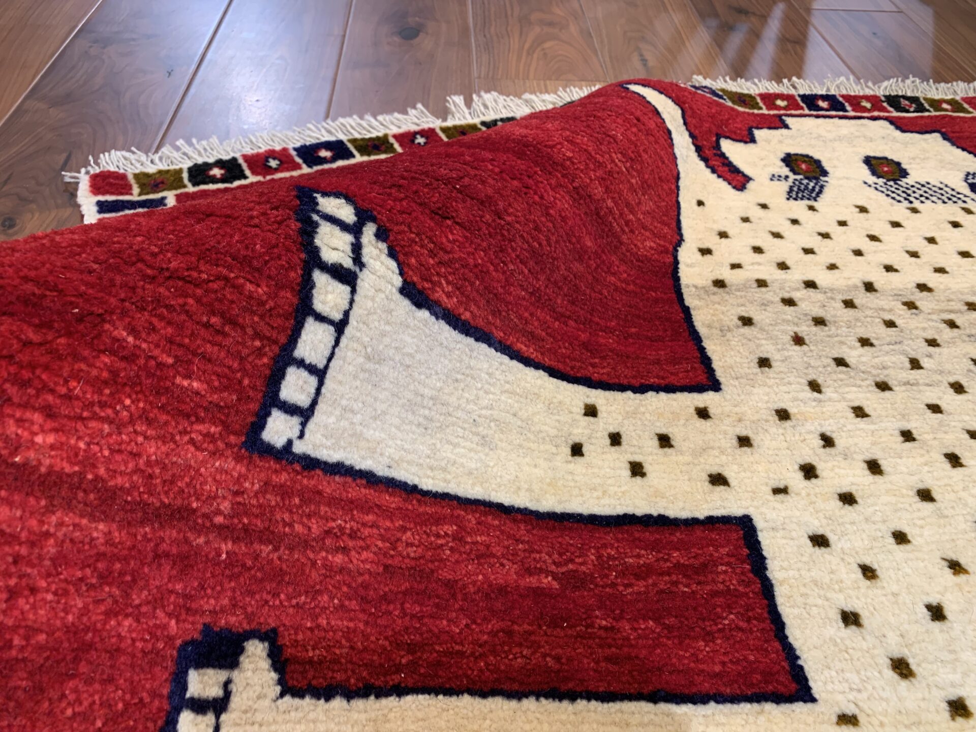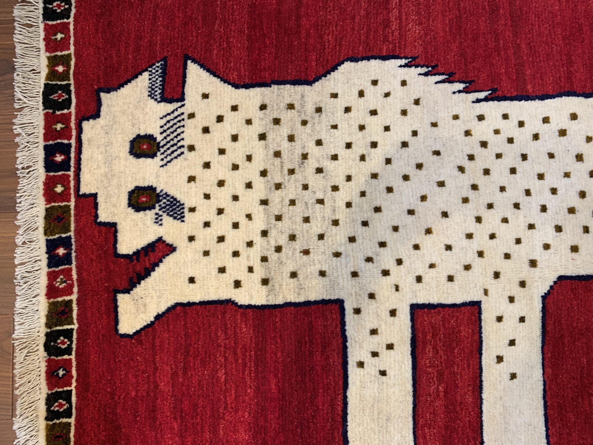 白いライオンの胴体にドットの紋様が施された、独特の存在感を放つギャッベ。