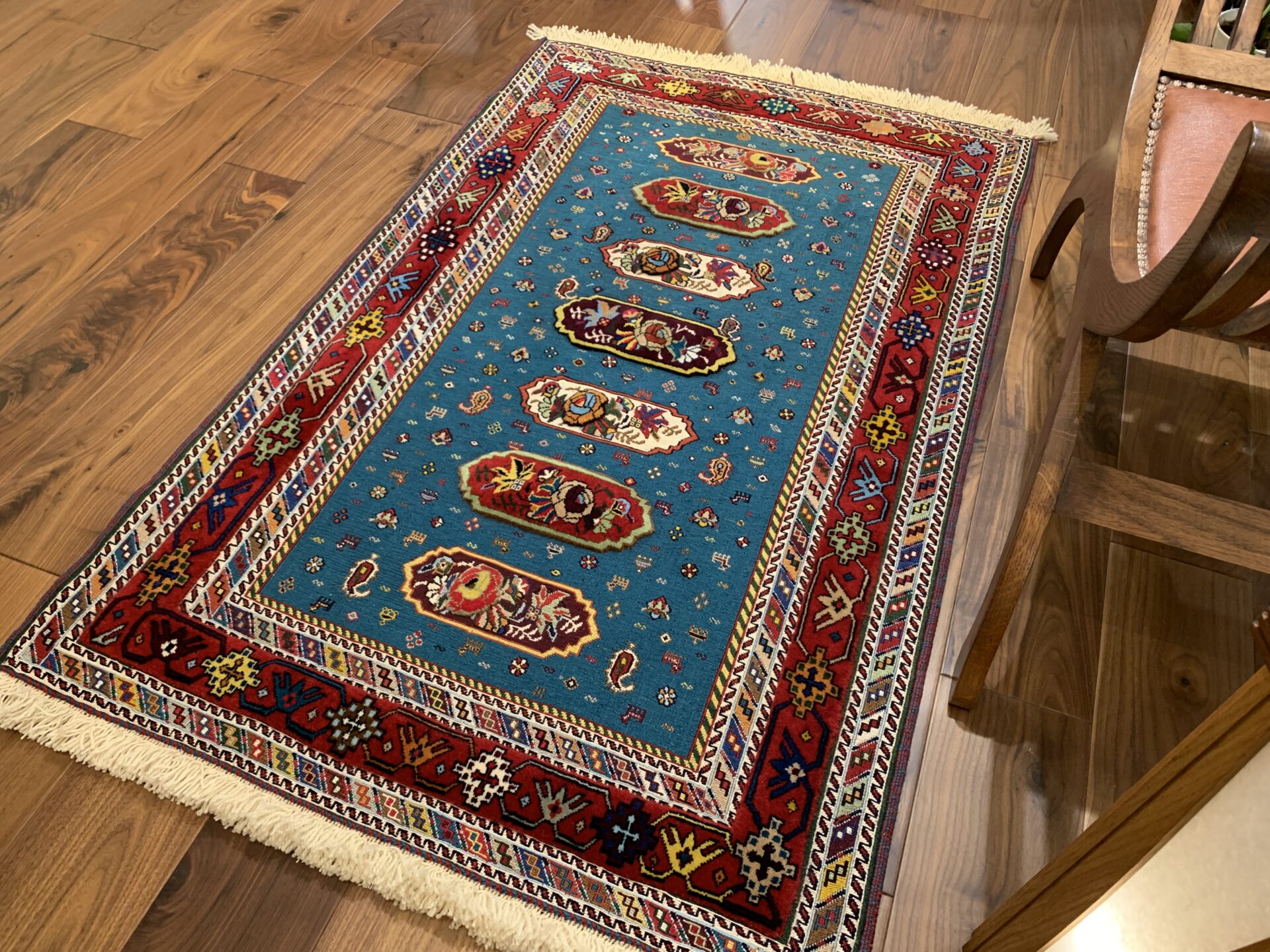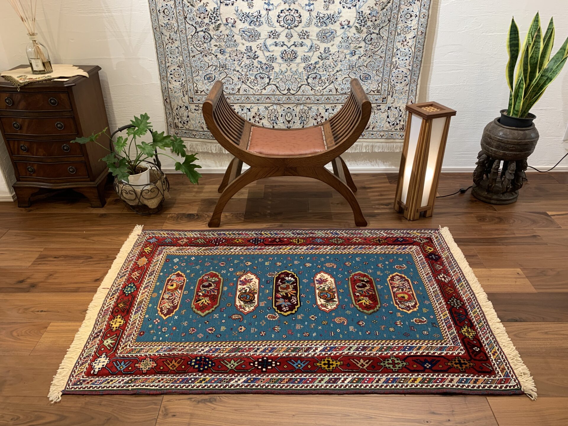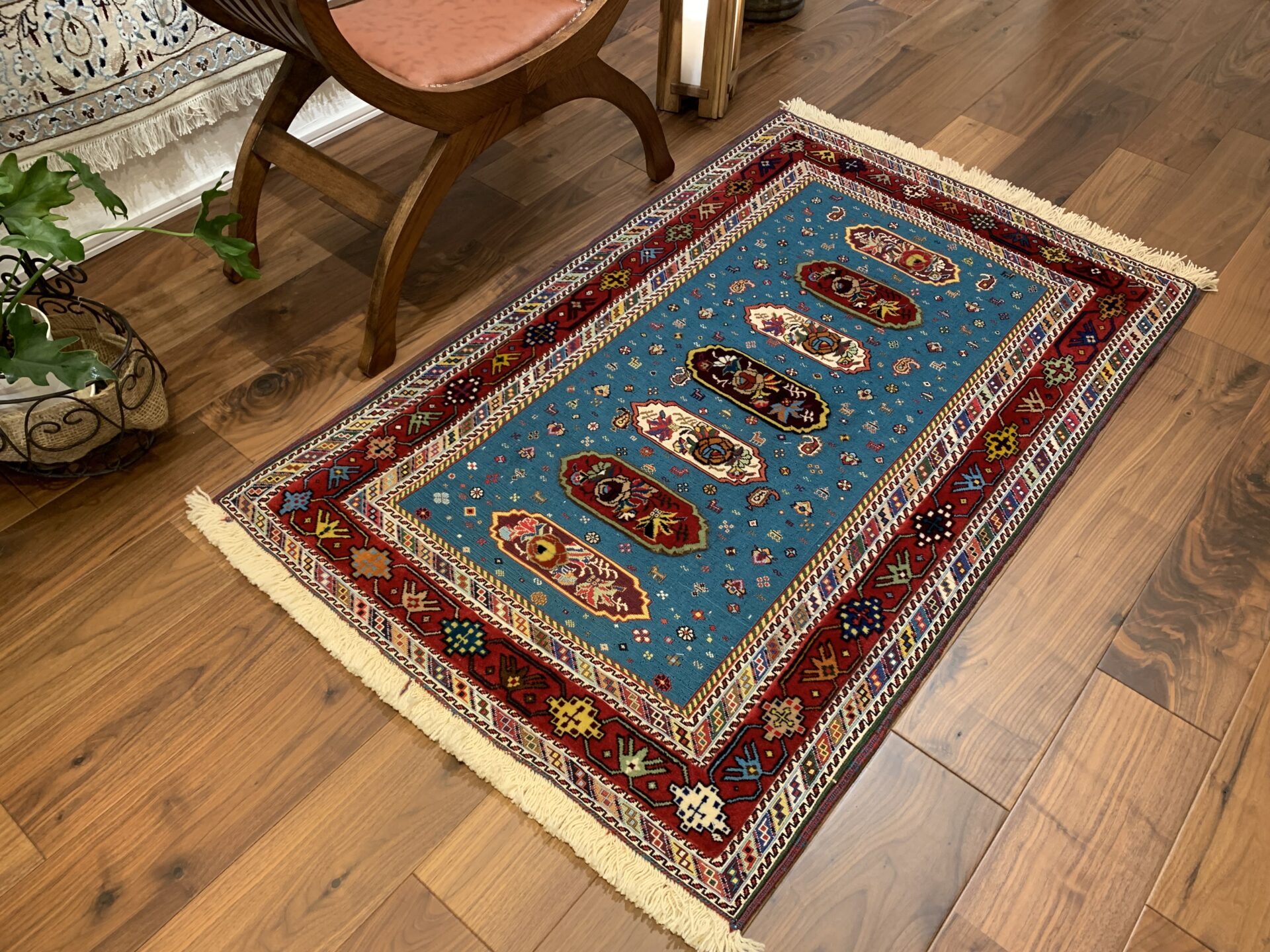 鮮やかなターコイズブルーを基調に、中央には生命や繁栄を意味するシンボルが織り込まれています。周囲の赤いボーダーには、幾何学模様や植物紋様が散りばめられ、空間に豊かな表情を添えてくれます。
