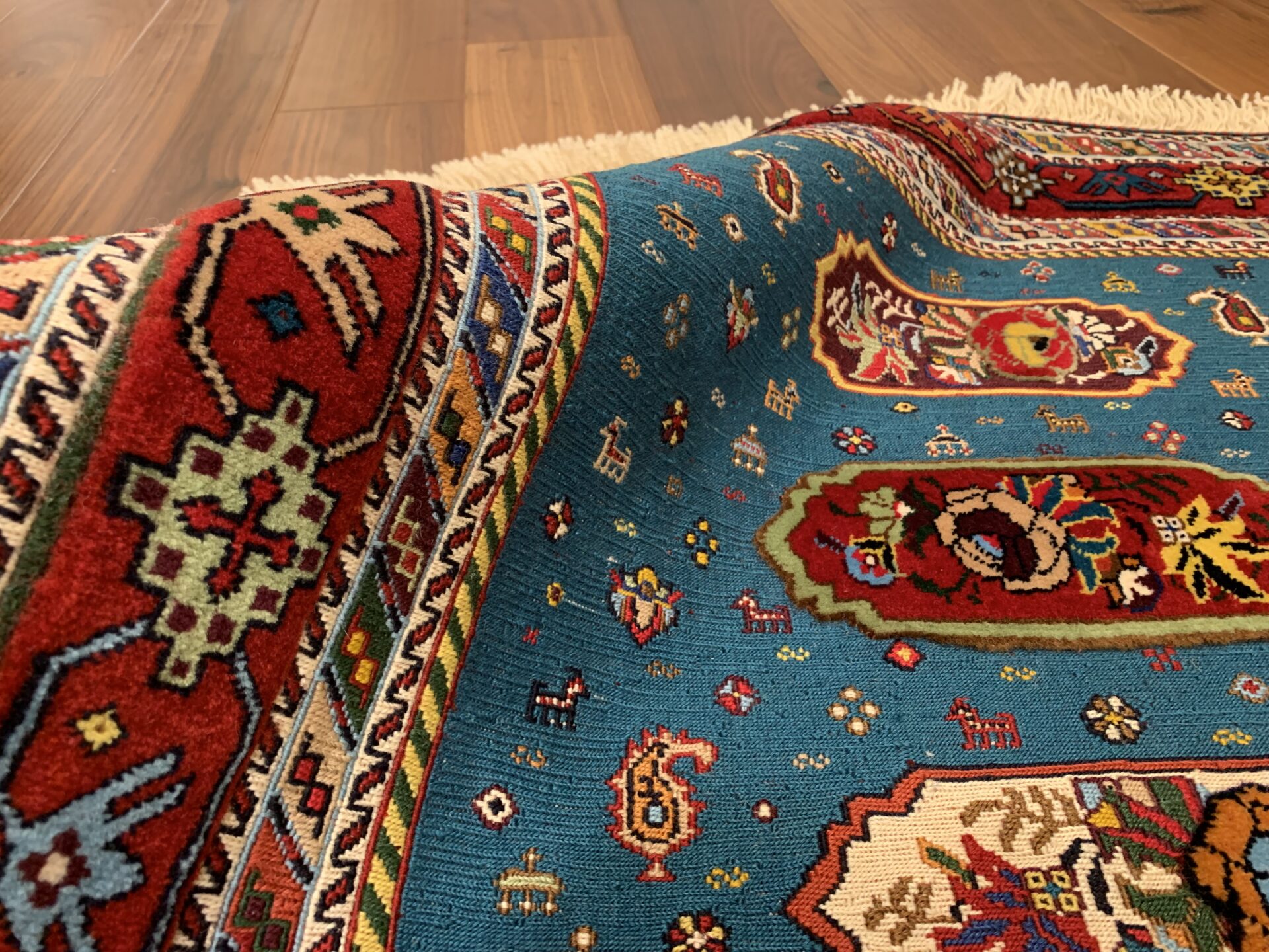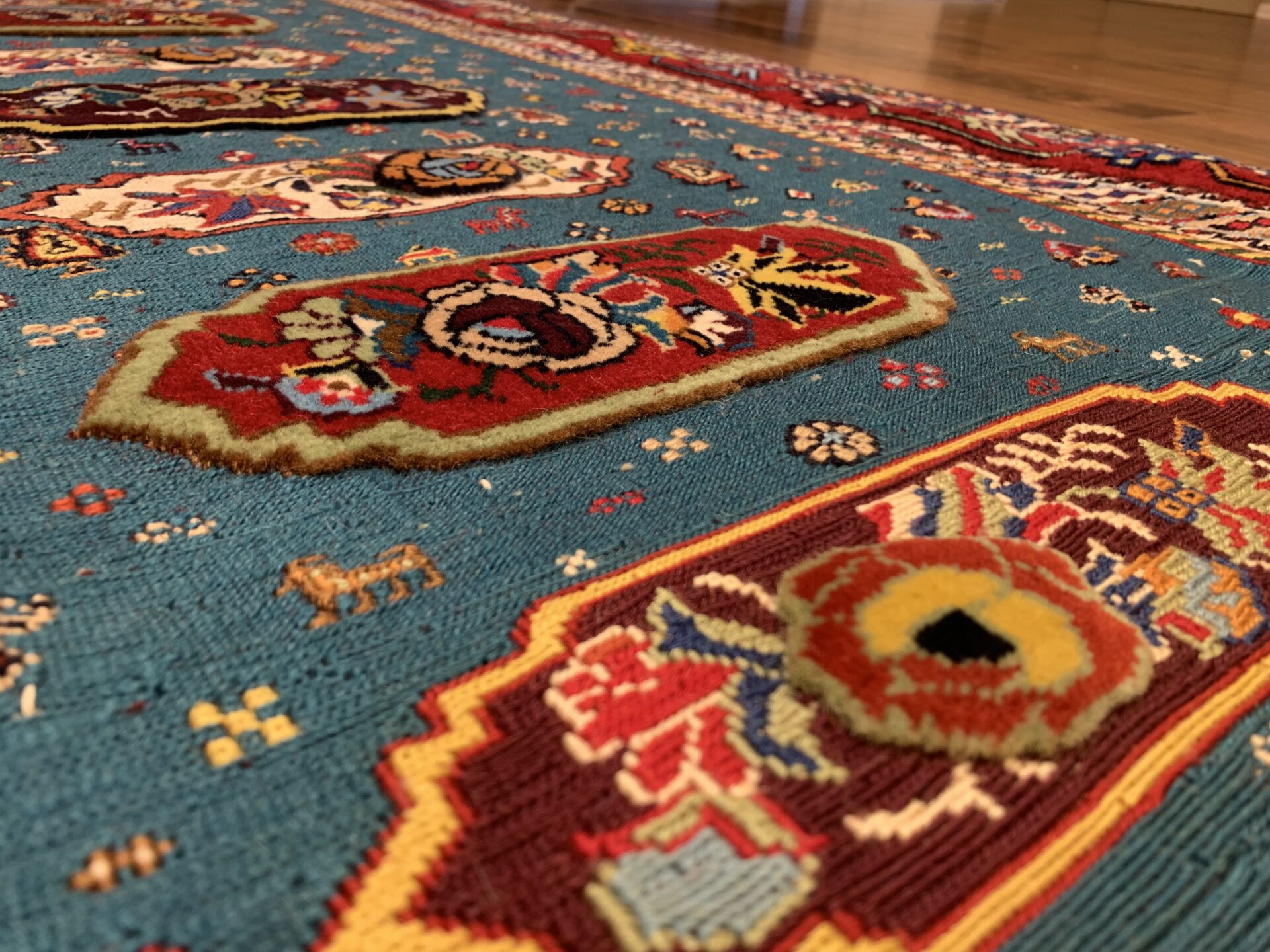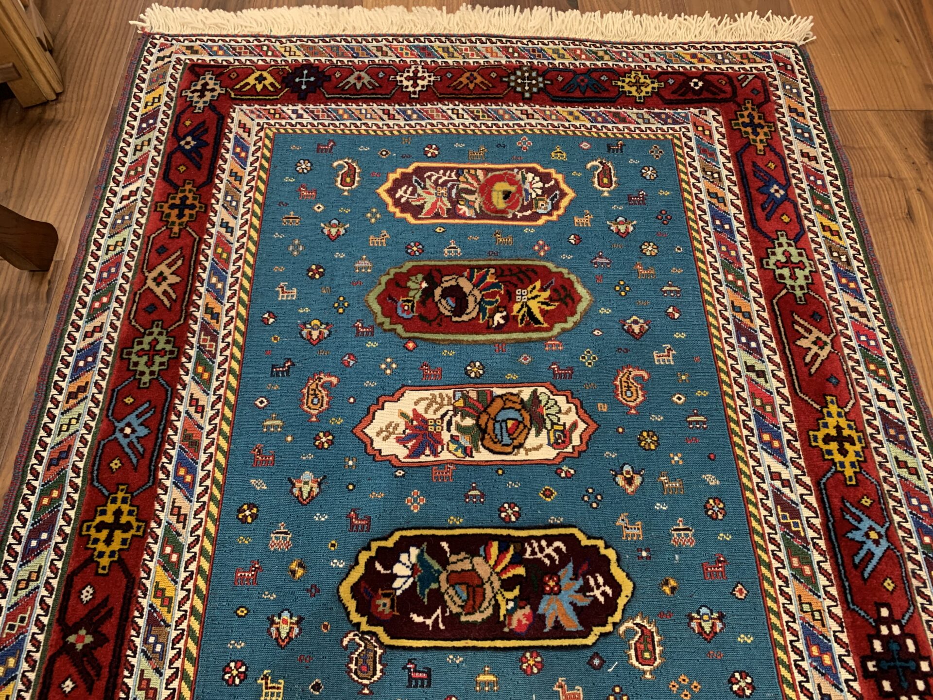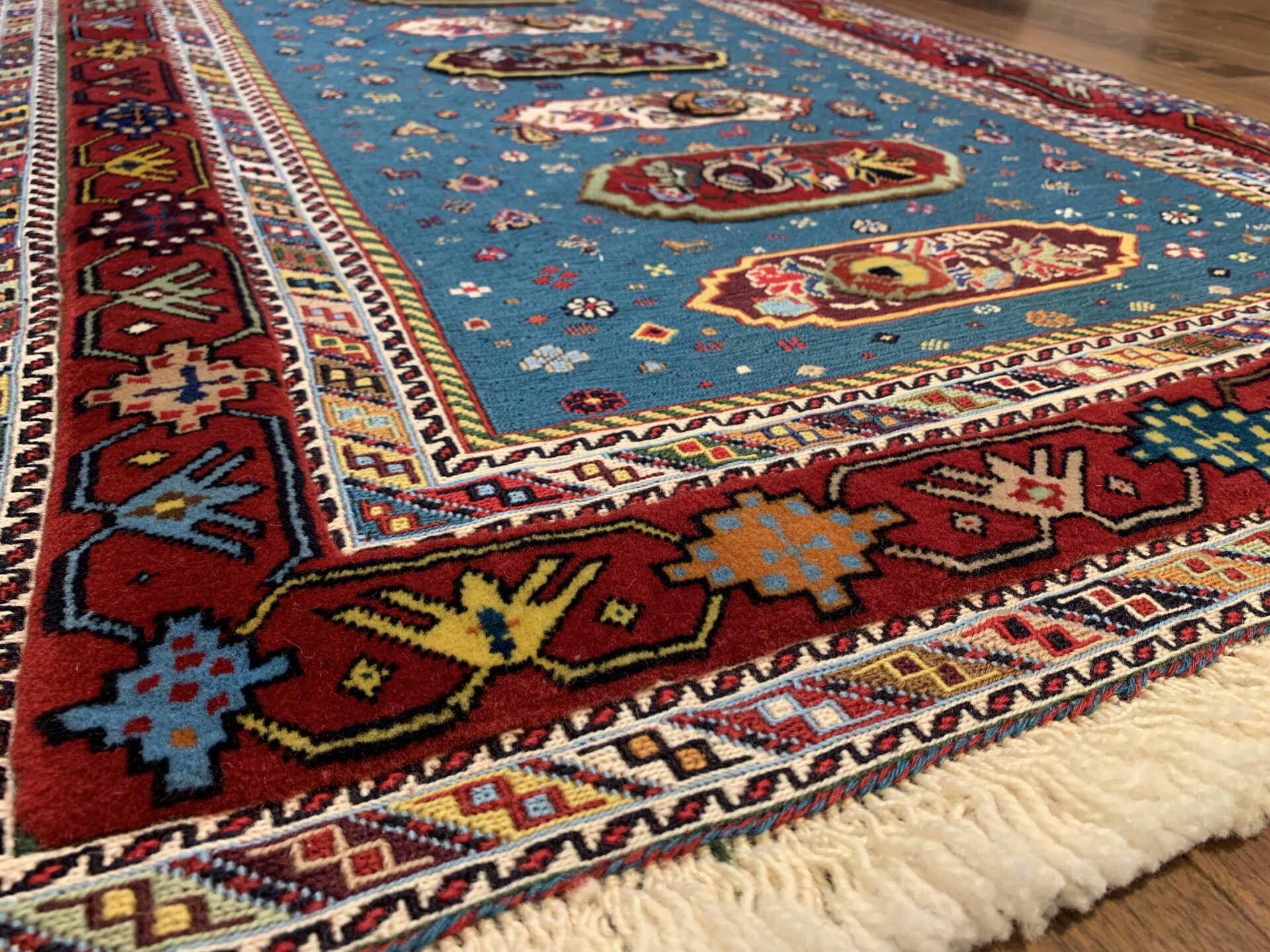 鮮やかなターコイズブルーを基調に、中央には生命や繁栄を意味するシンボルが織り込まれています。周囲の赤いボーダーには、幾何学模様や植物紋様が散りばめられ、空間に豊かな表情を添えてくれます。