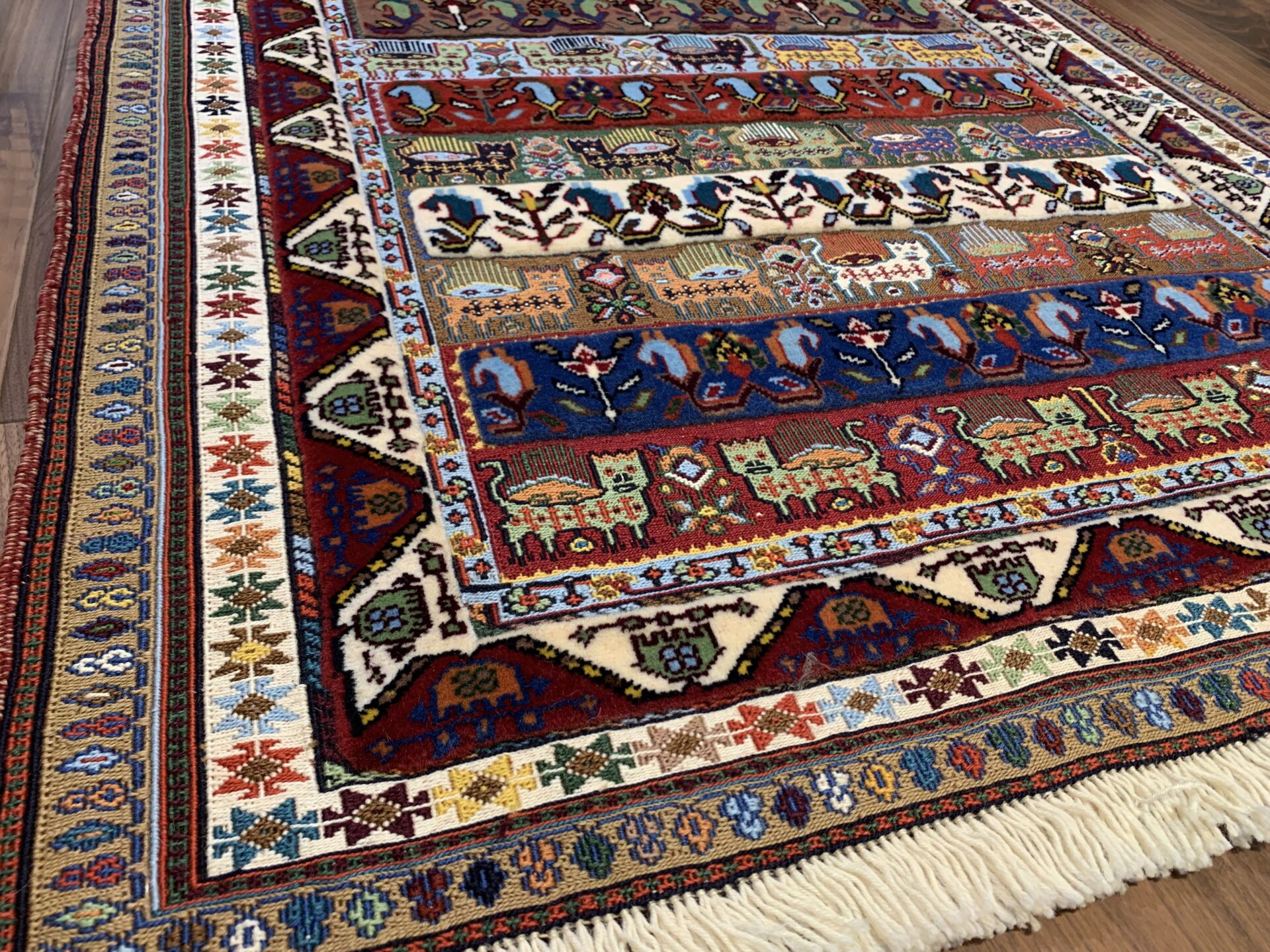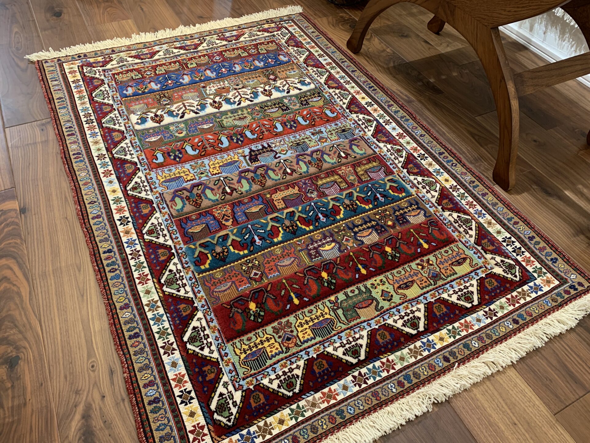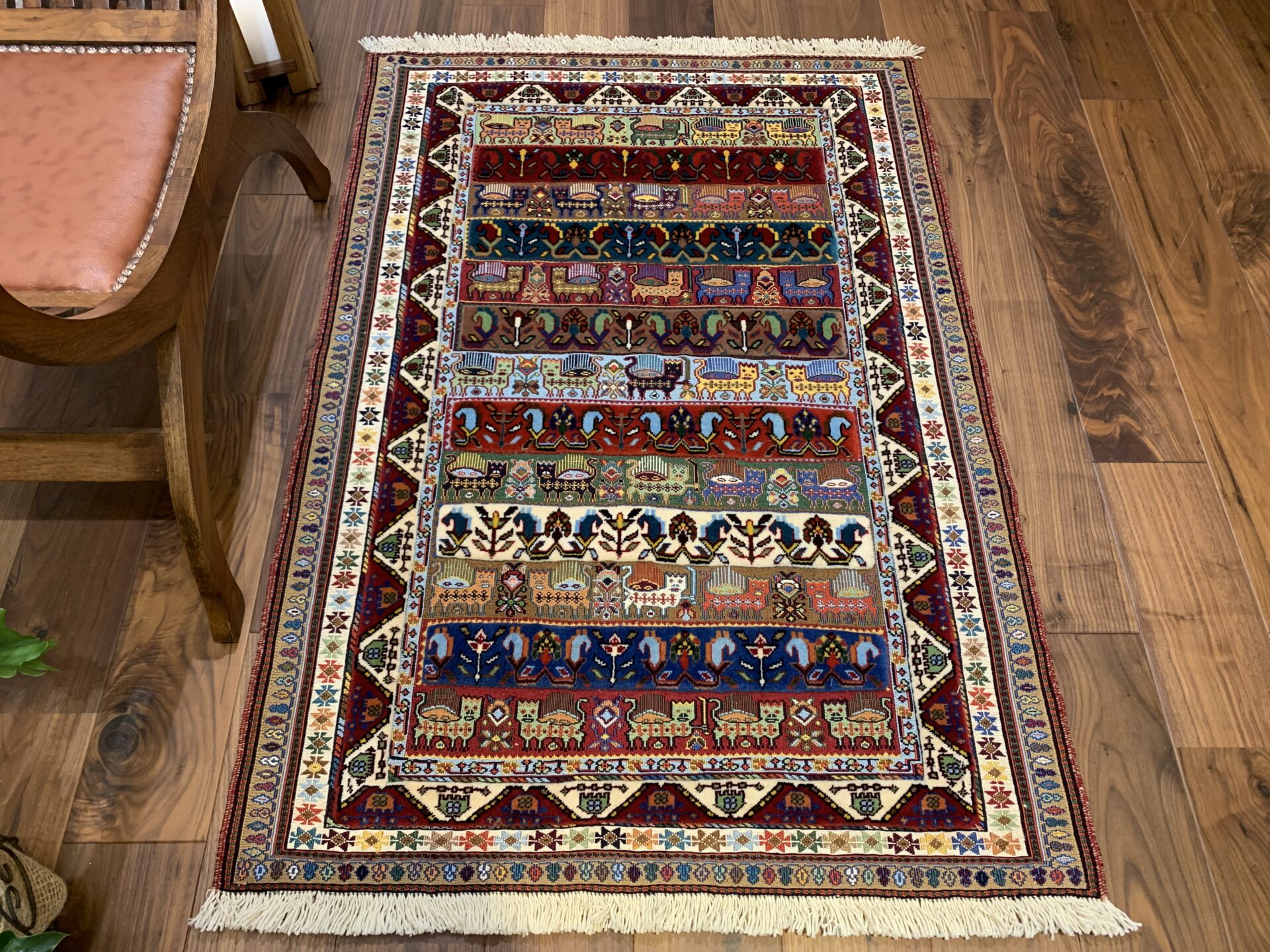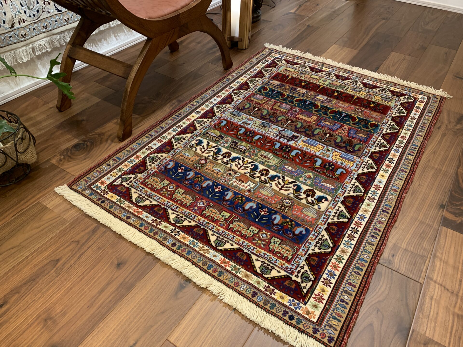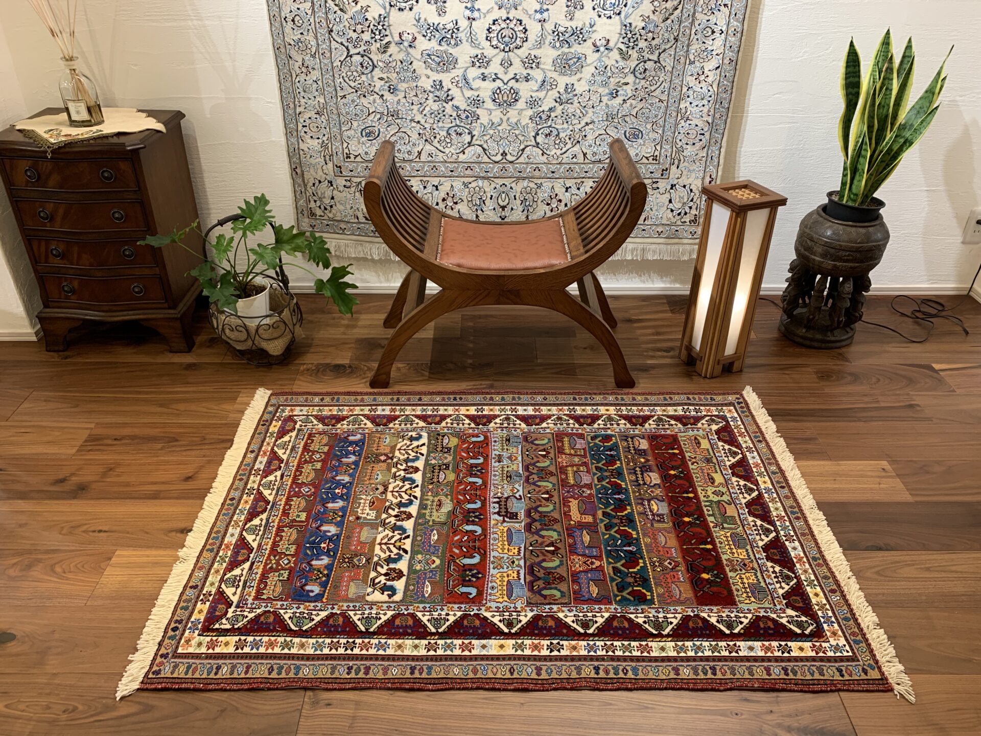 敷物としてはもちろん、壁に飾ればまるで絵画のようにお楽しみいただけます。遊牧民の自由な感性と伝統の高い織り技が融合した、世界に二つとないアートピースです。