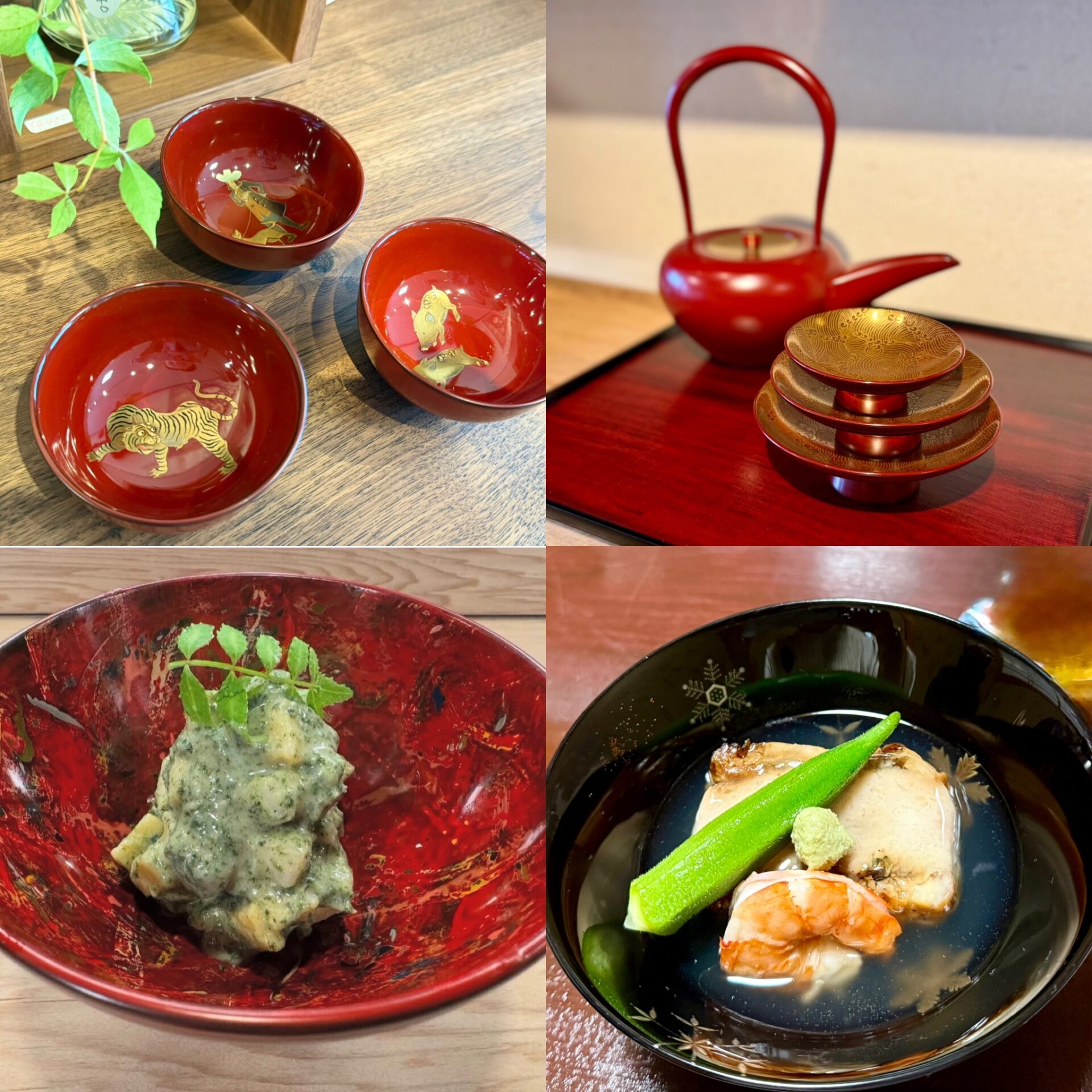 以前、お買い上げいただいたお料理屋さんが、それぞれお料理を盛り付けた写真です。 左下の小鉢は、近年先生が作られているたくさんの漆色を重ねて作られたもので、白い和え物と、とてもよく合っています