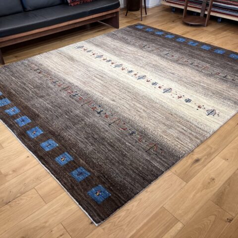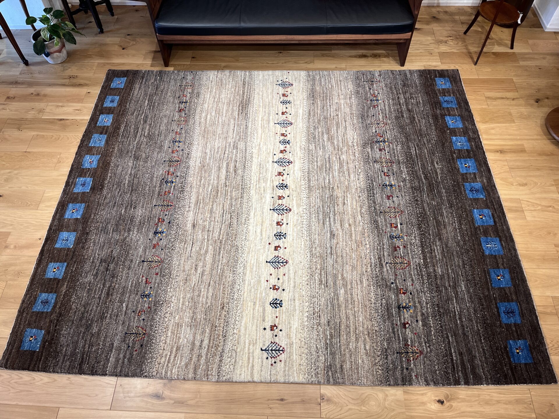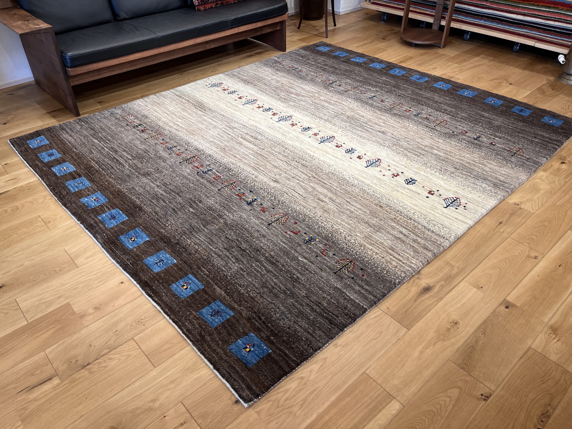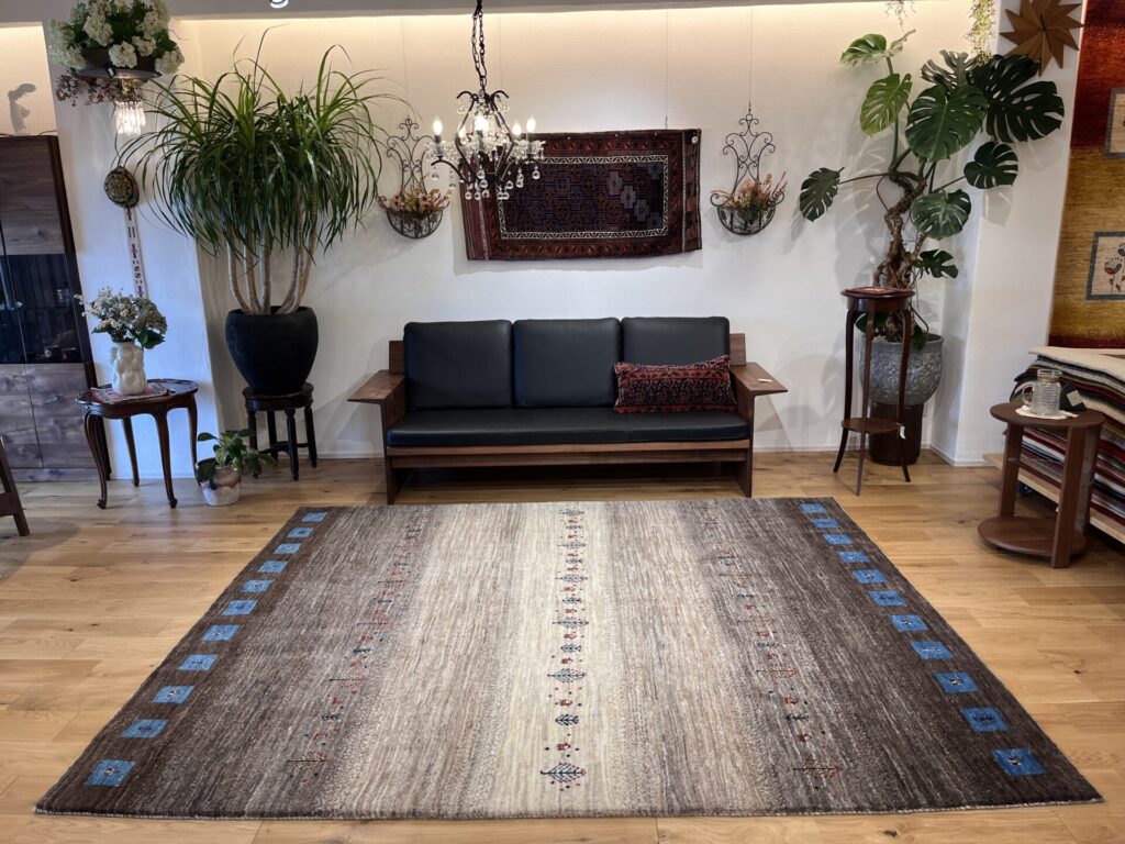 アクセントとして配された 鮮やかなブルーのスクエア紋様は、イラン遊牧民の伝統における「幸せを呼び込む窓」を象徴します。ナチュラルなトーンの中にリズムを与え、都会的なモダン空間にも映えるデザインとなっています。