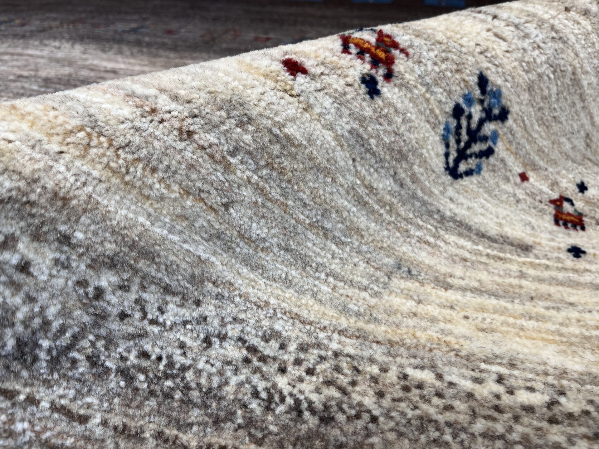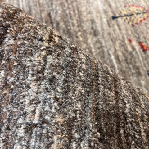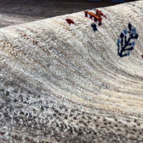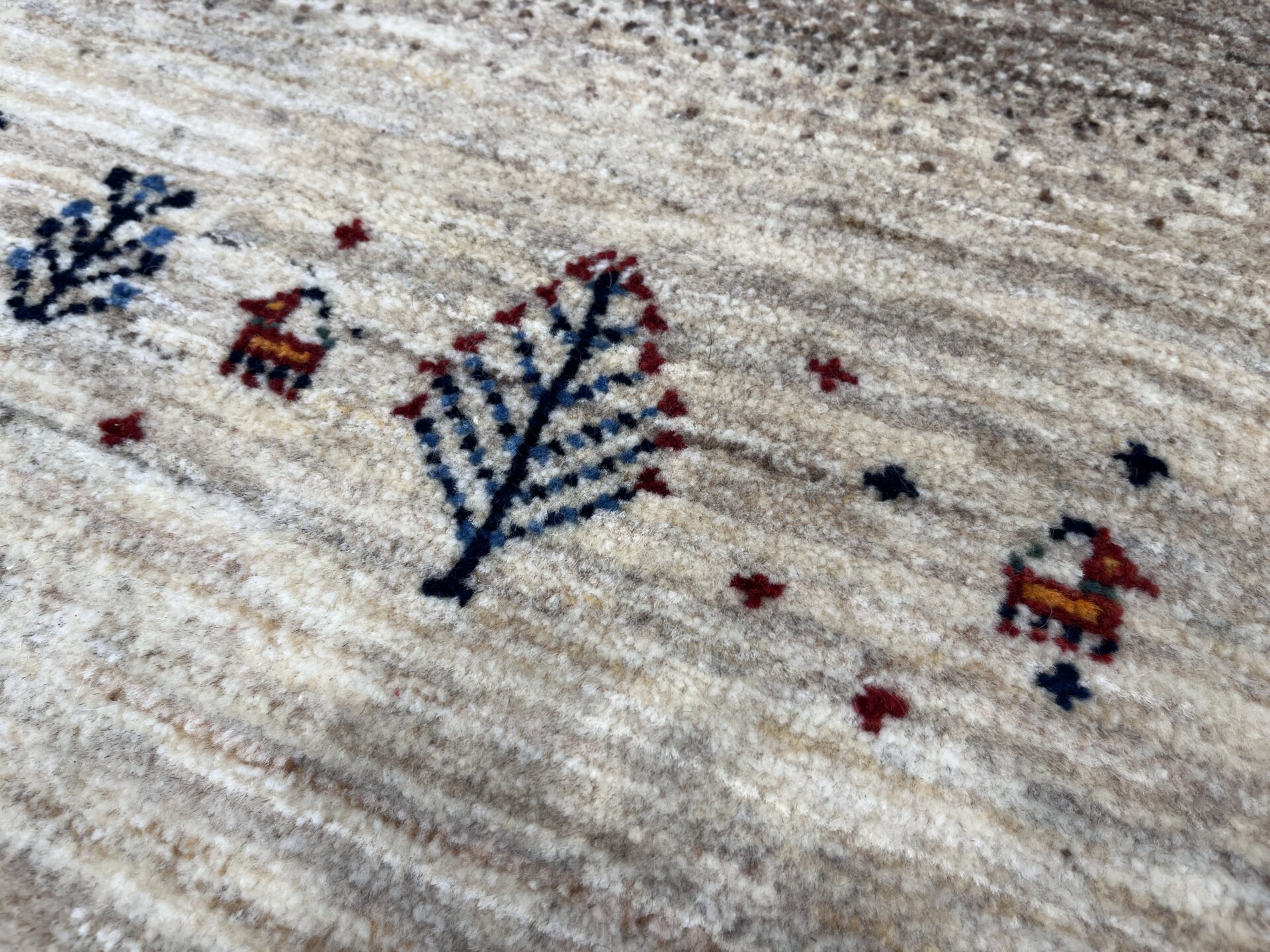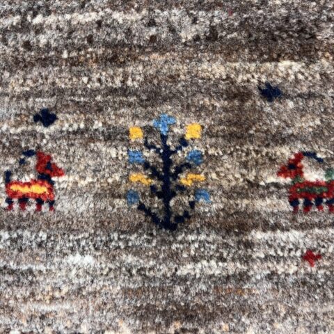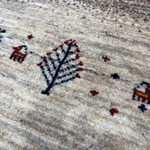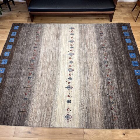 アクセントとして配された 鮮やかなブルーのスクエア紋様は、イラン遊牧民の伝統における「幸せを呼び込む窓」を象徴します。ナチュラルなトーンの中にリズムを与え、都会的なモダン空間にも映えるデザインとなっています。