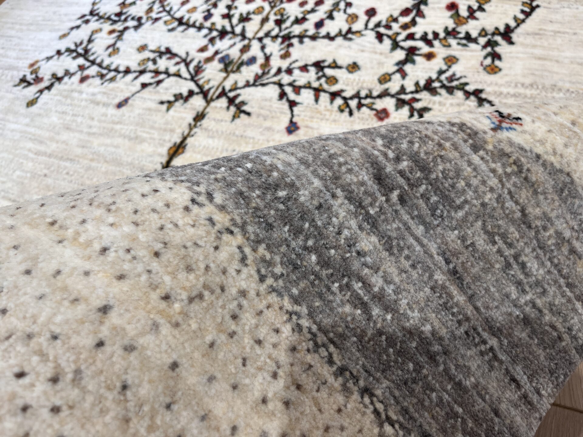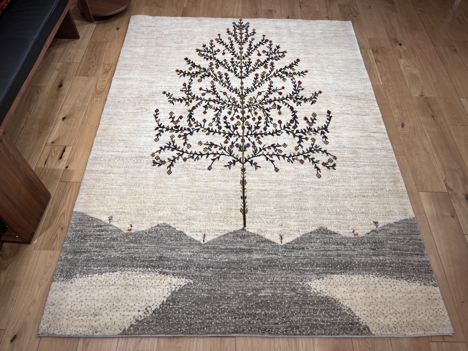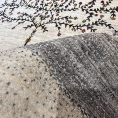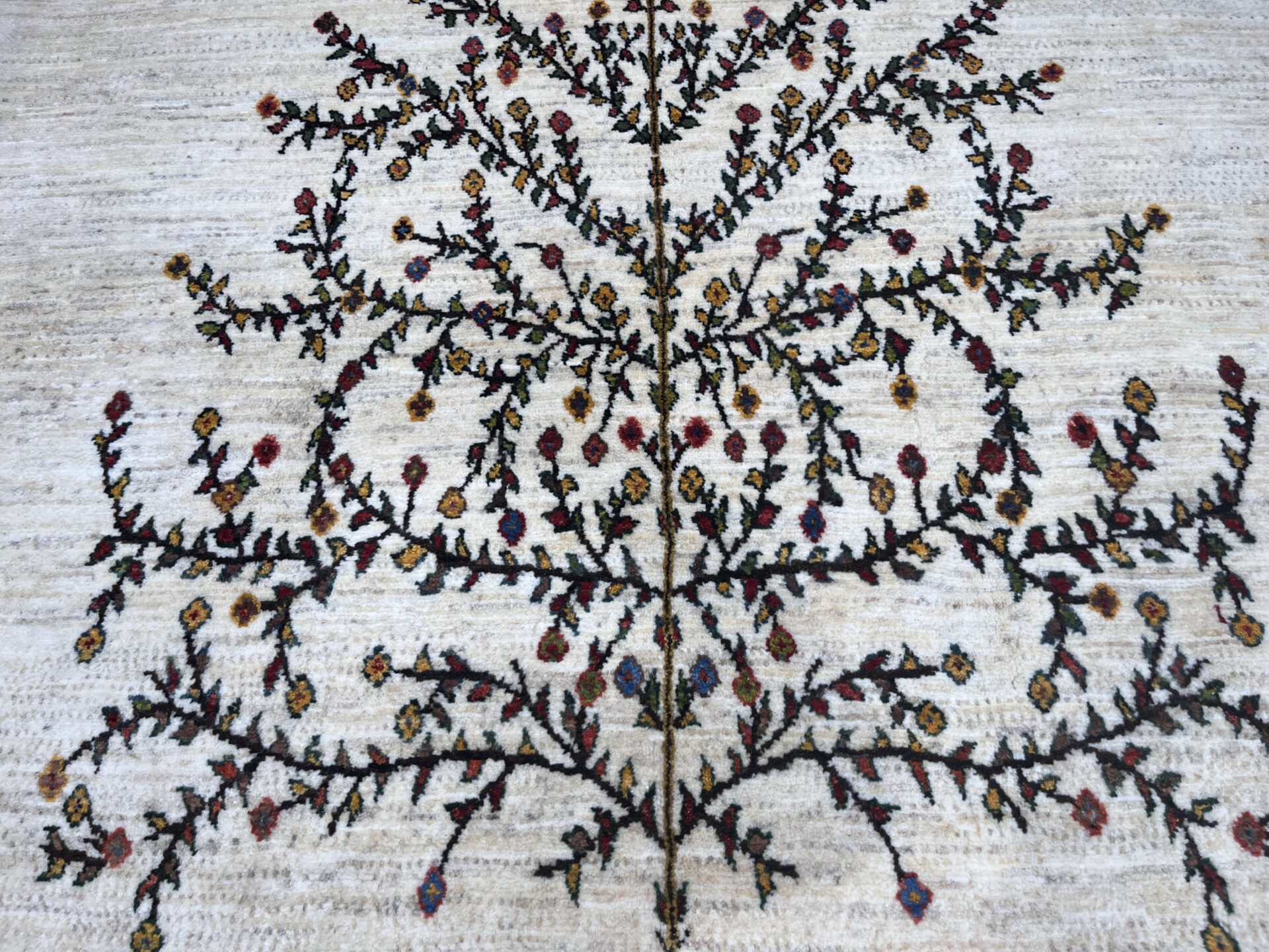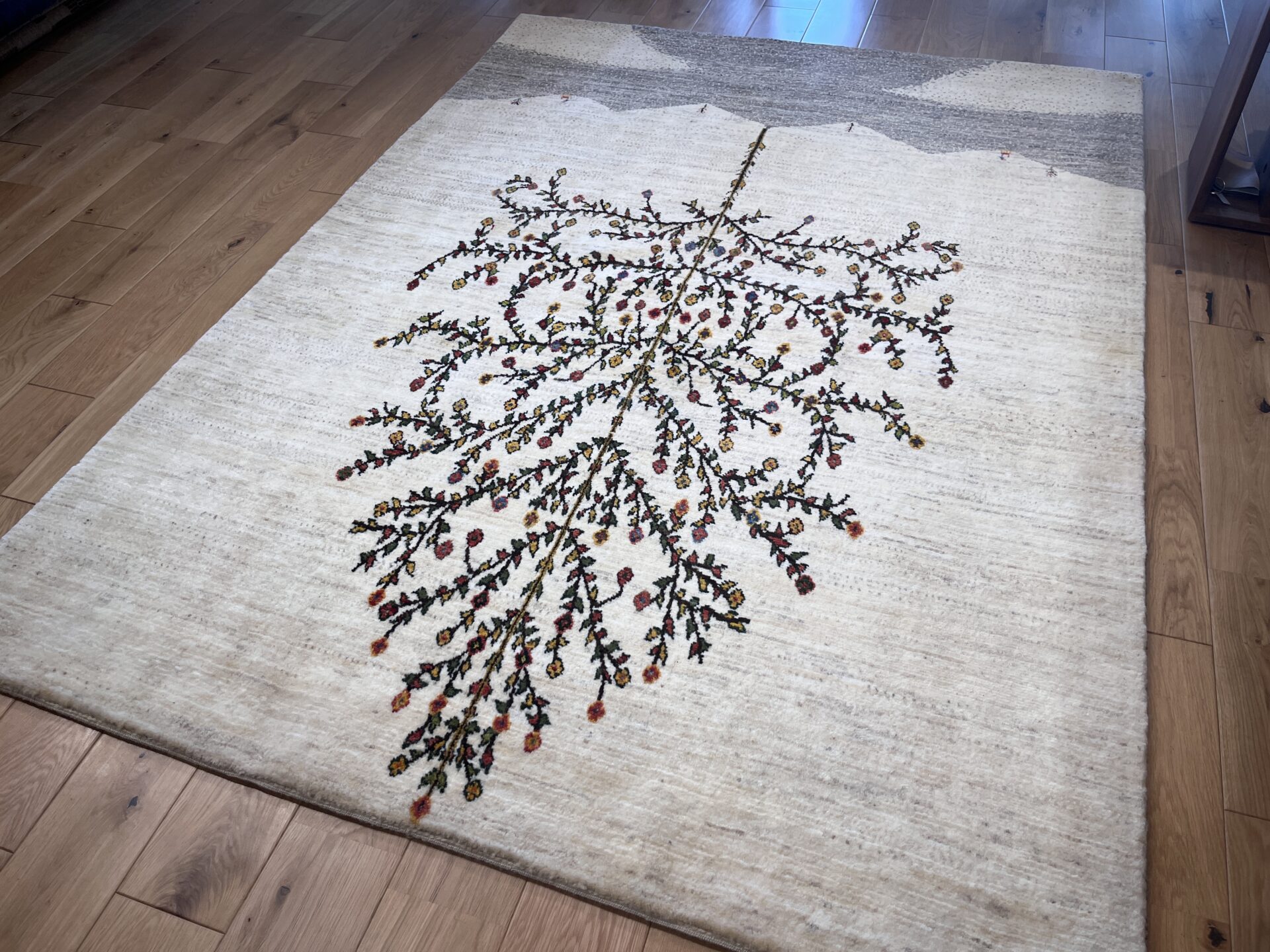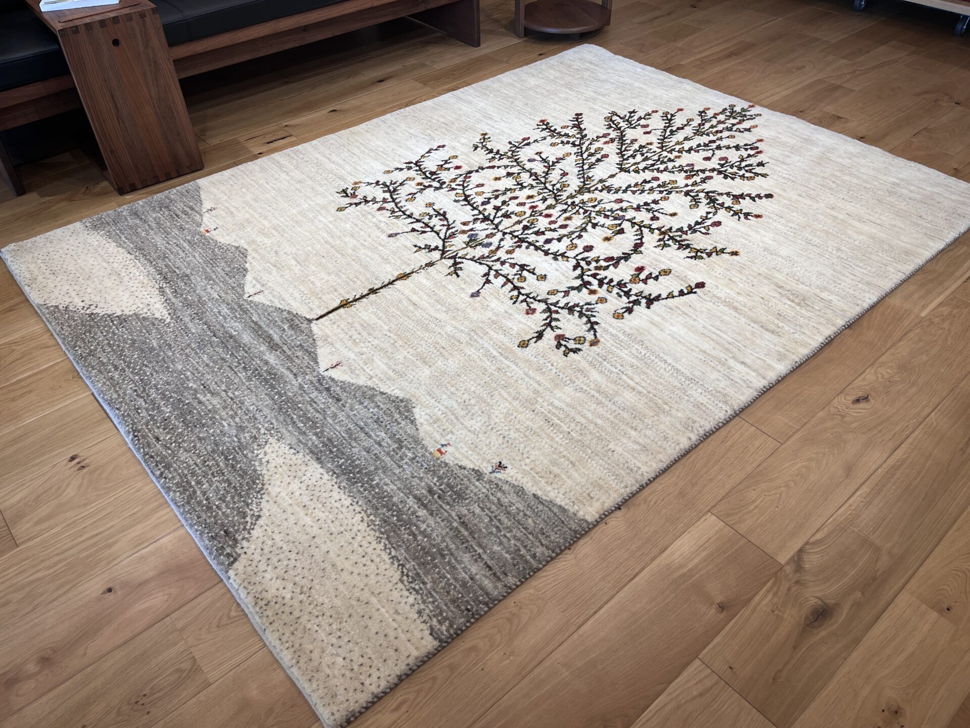 生成りの原毛を基調としたフィールドに、大きく枝を広げる「生命の木」が描かれたギャッベ。