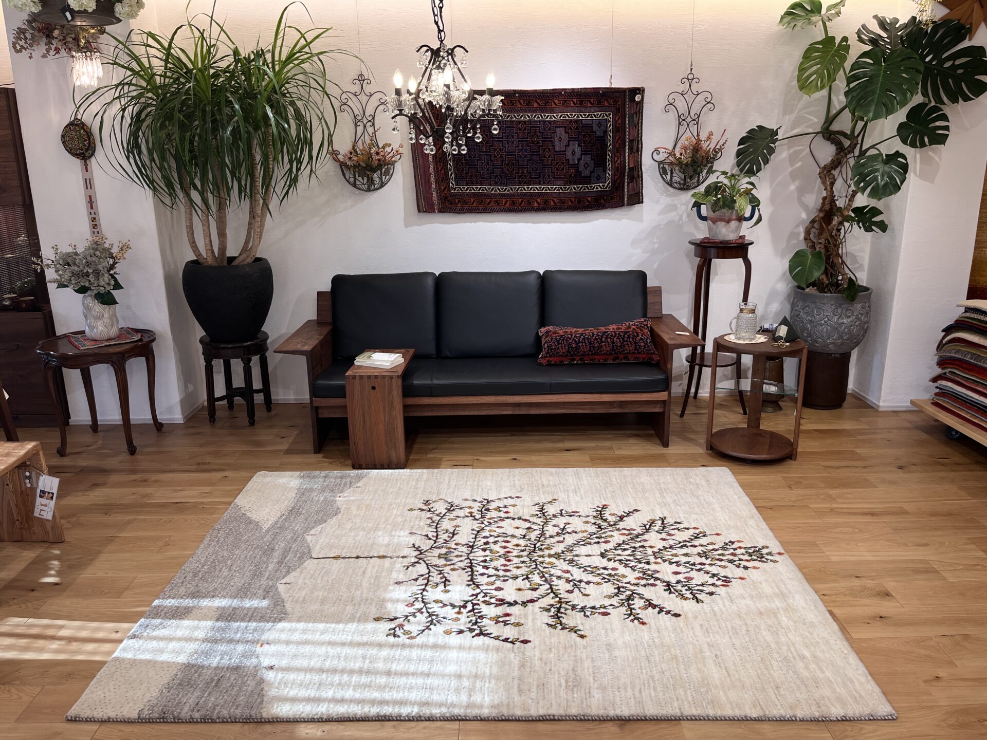 「生命の木」は天と地、人と自然をつなぐモチーフとされ、末永い繁栄や家族の幸せを願う紋様。大きな木の構図はまさに空間の主役となり、リビングや玄関ホールに敷けば、訪れる人を温かく迎える存在感を放ちます。