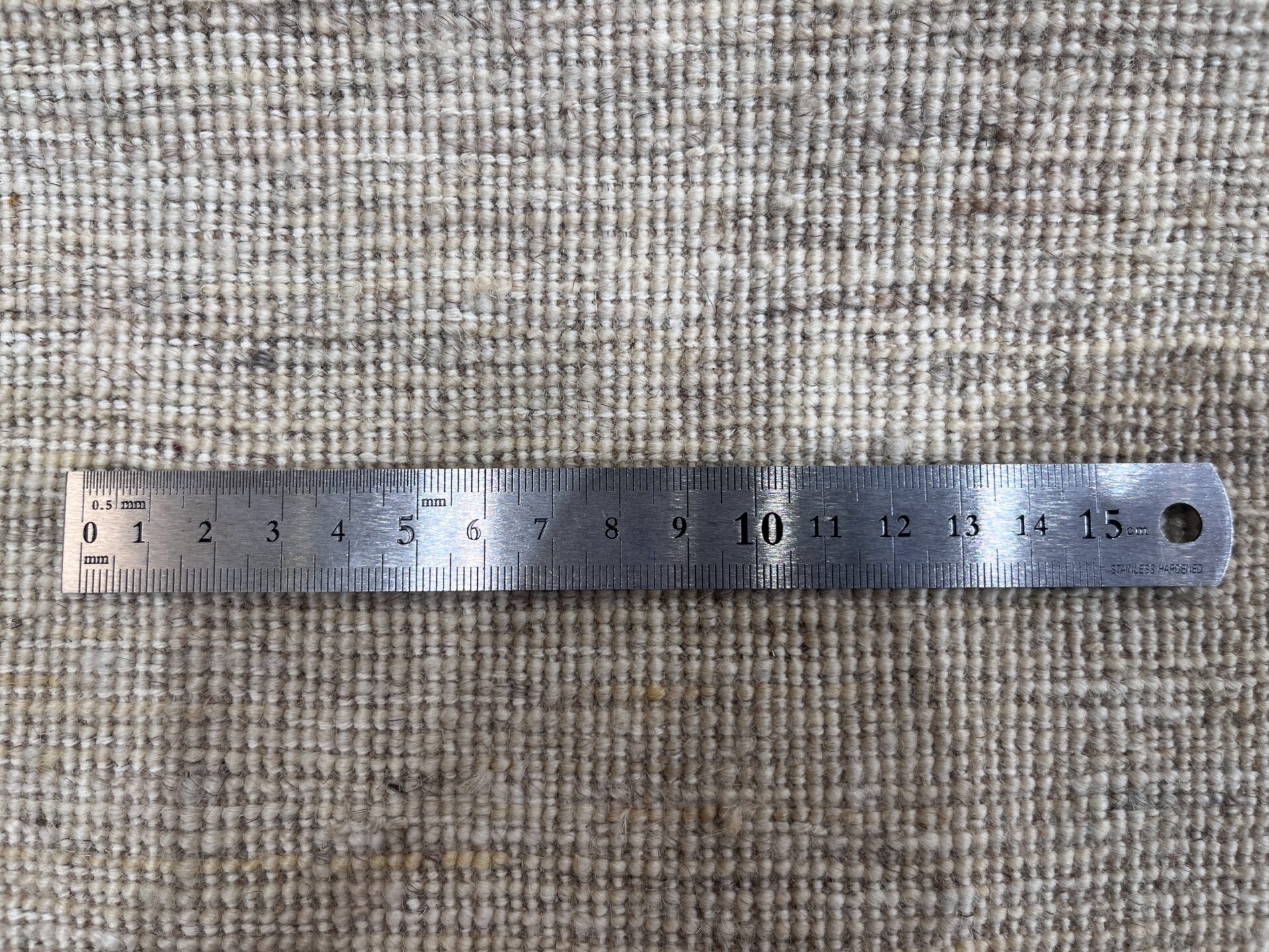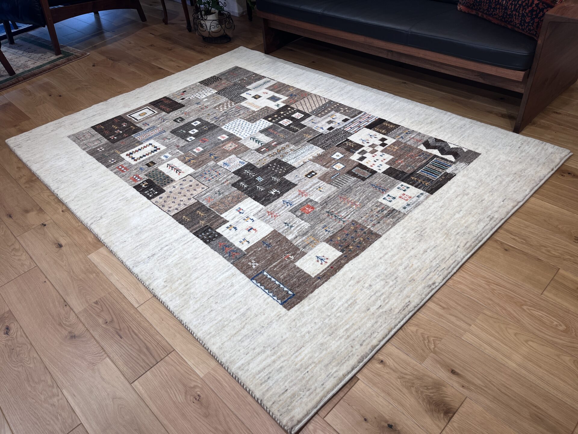 全体の色調は、原毛を生かしたグレーやブラウンを基調とした落ち着いたトーン。そこに差し色として赤や青が控えめに入り、穏やかでありながら奥行きのある表情を生み出しています。シックな配色はモダンなインテリアにも調和し、空間をスタイリッシュに演出します。