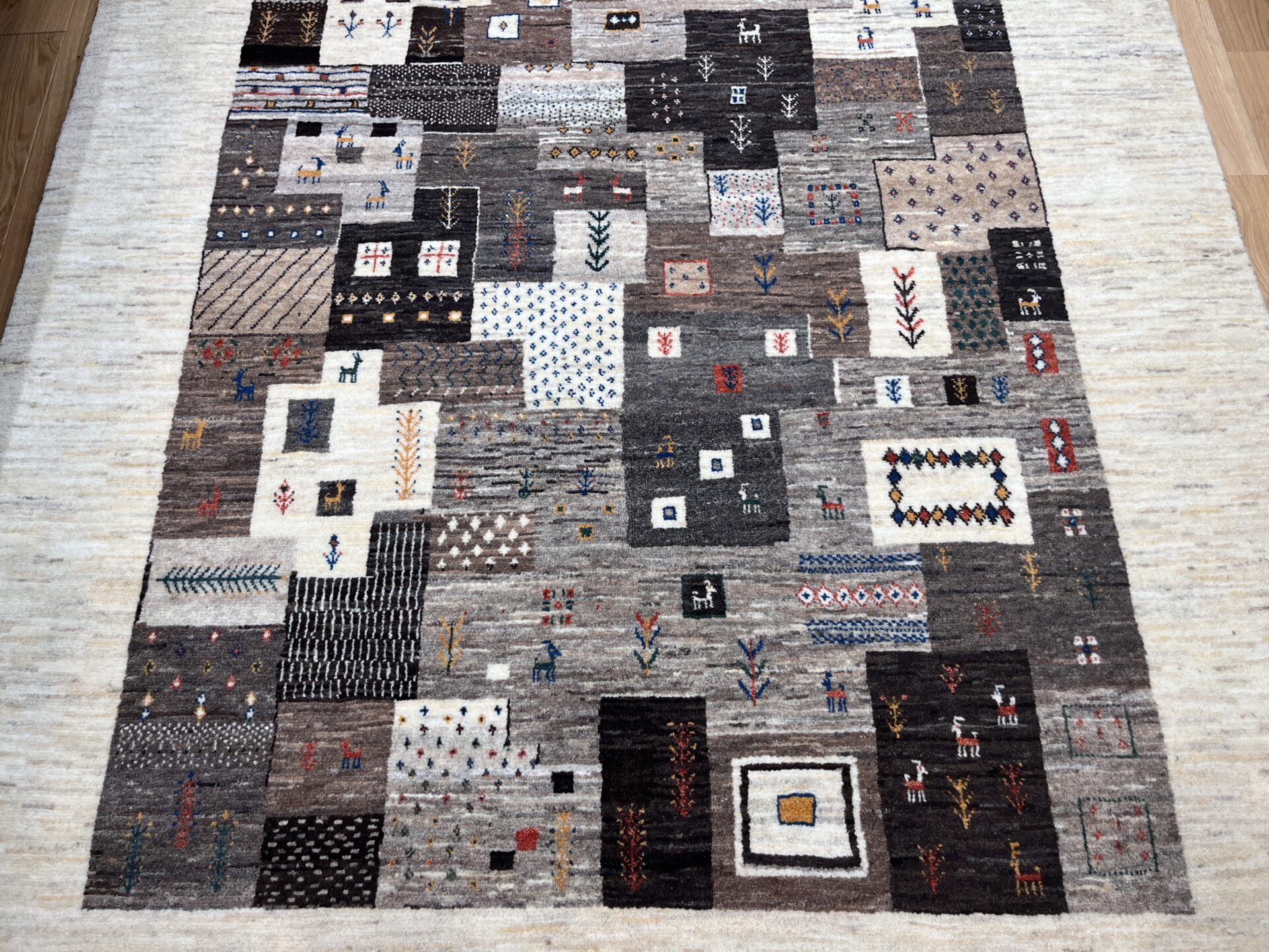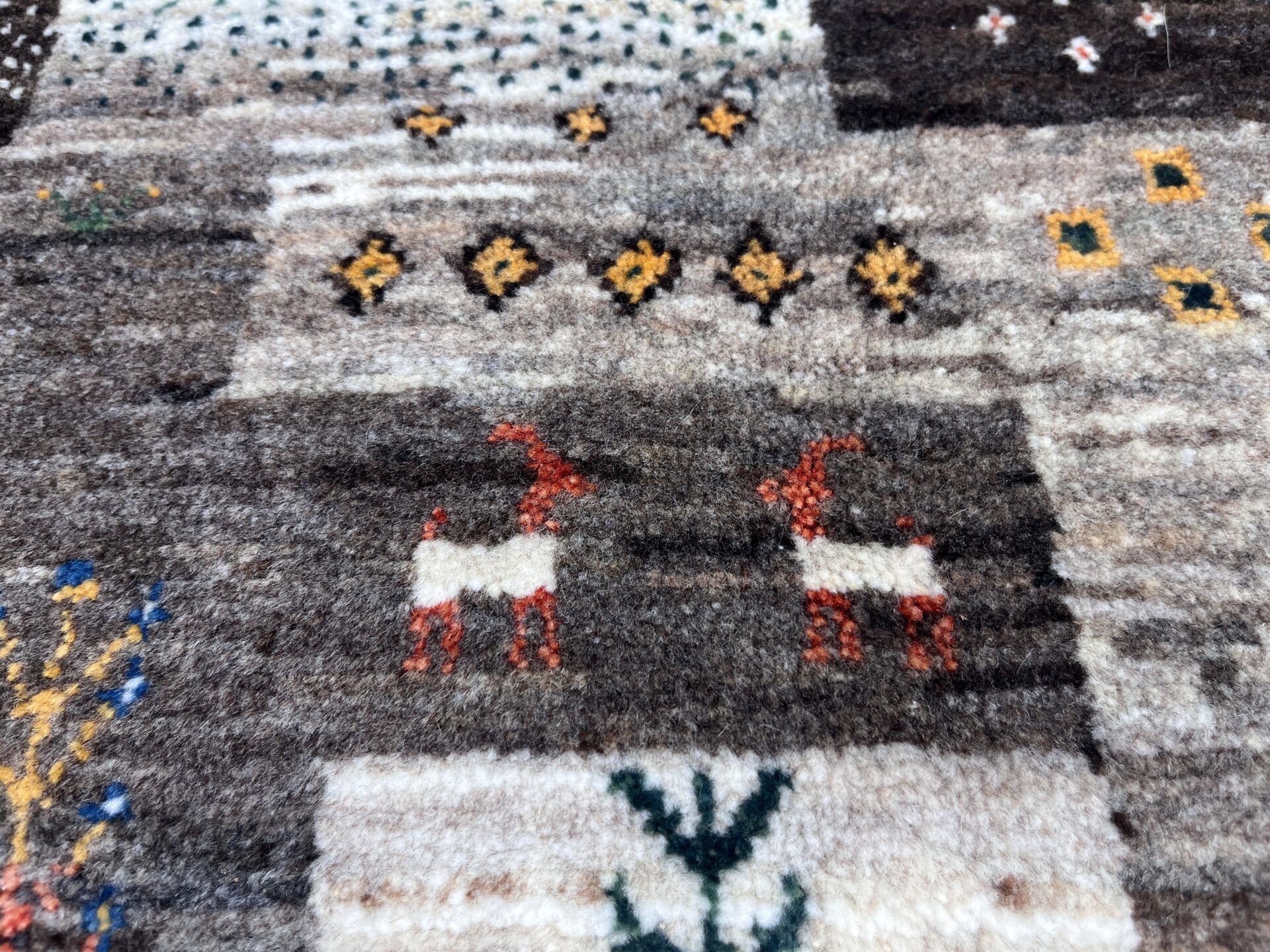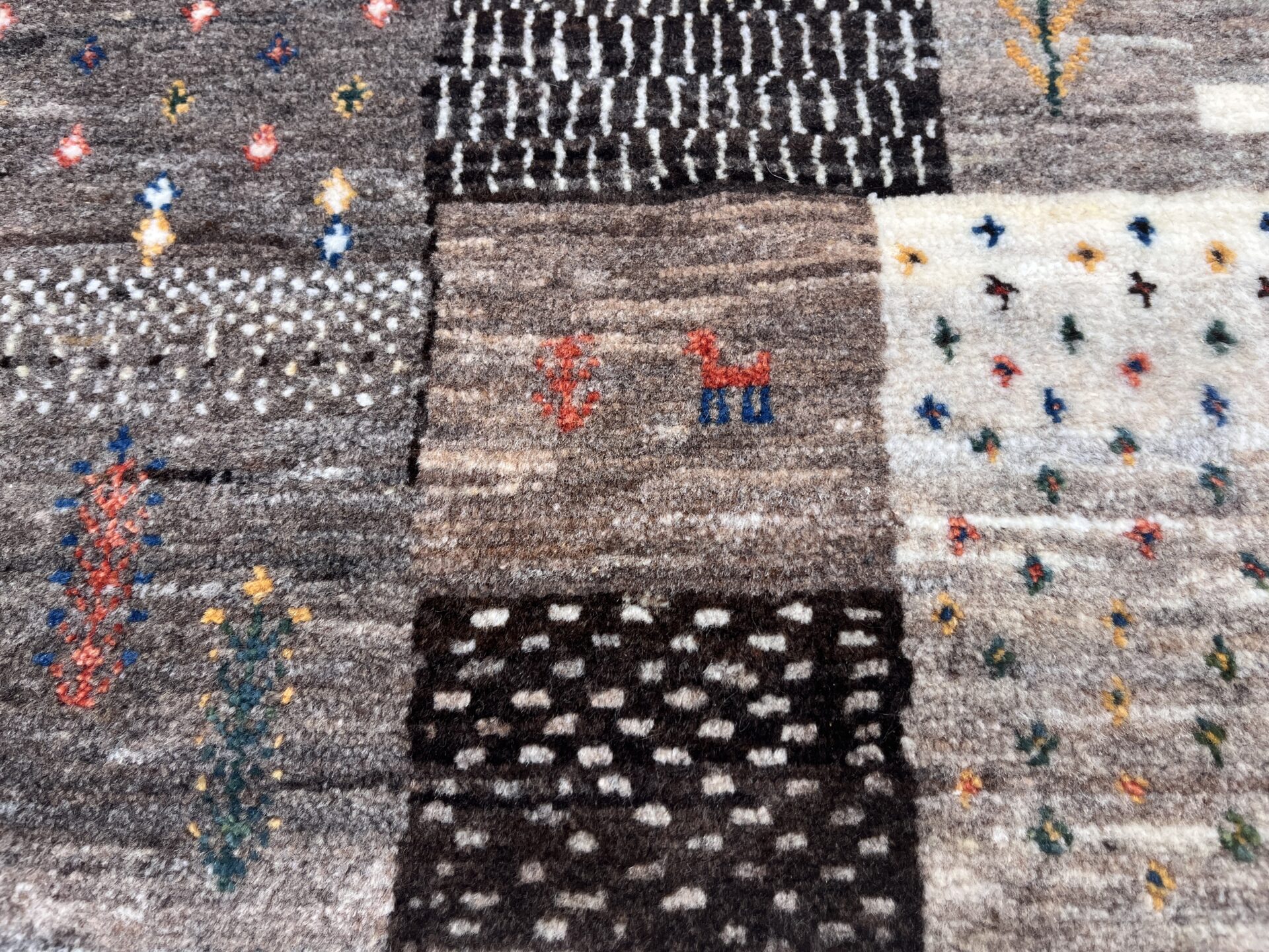 それぞれのマスには「羊」「生命の木」「幾何学模様」「花」など、遊牧民の伝統的なシンボルが細やかに織り込まれています。