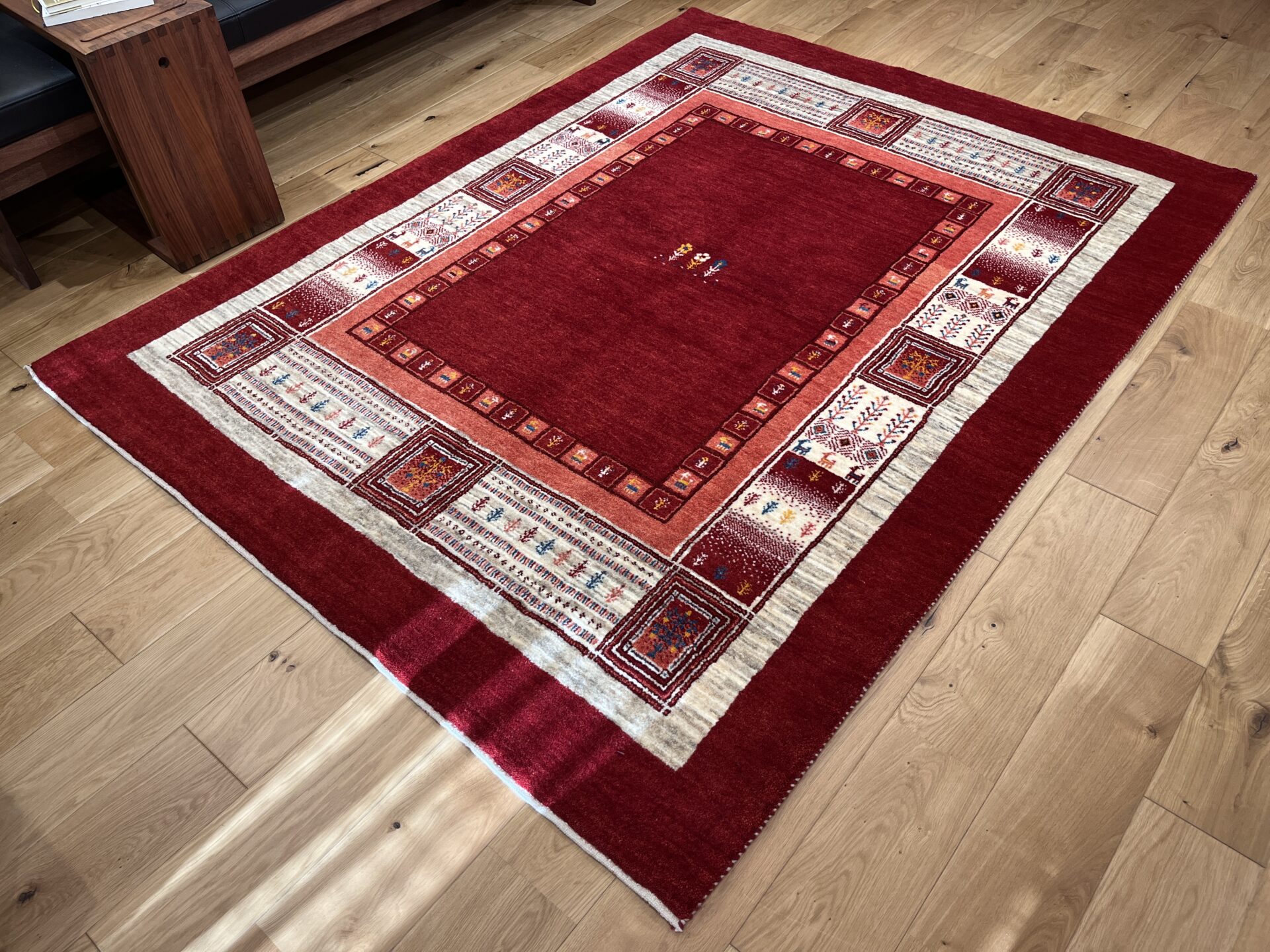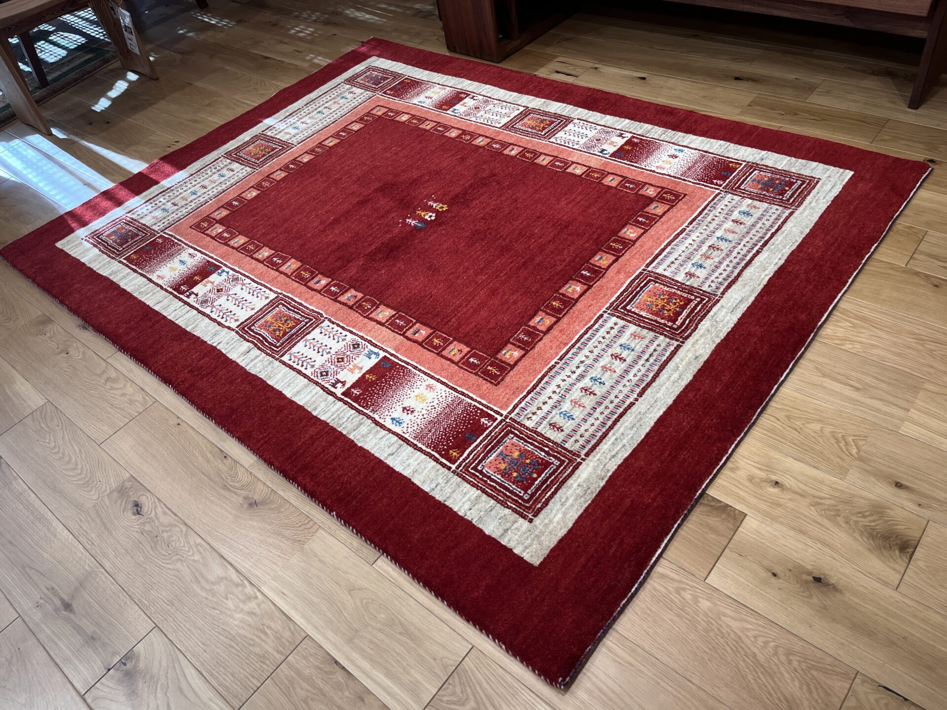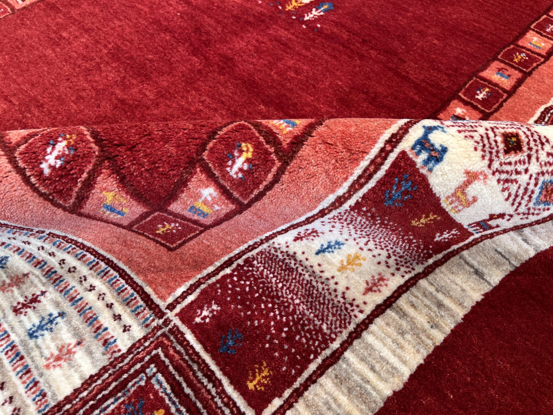 ギャッベにはしっかりした織りの「アマレ」、軽やかで繊細な「カシュクリ」、最高峰の緻密さを誇る「ルリバフ」のシリーズがあります。カシュクリ・ギャッベはアマレよりも細かな糸を使い、より緻密で滑らかな織りが特徴です。草木染めの色が美しく映え、模様の表現力も豊か。品質と軽やかさのバランスに優れ、使い心地と見た目の両方にこだわりたい方に最適な「カシュクリ ギャッベ」です。