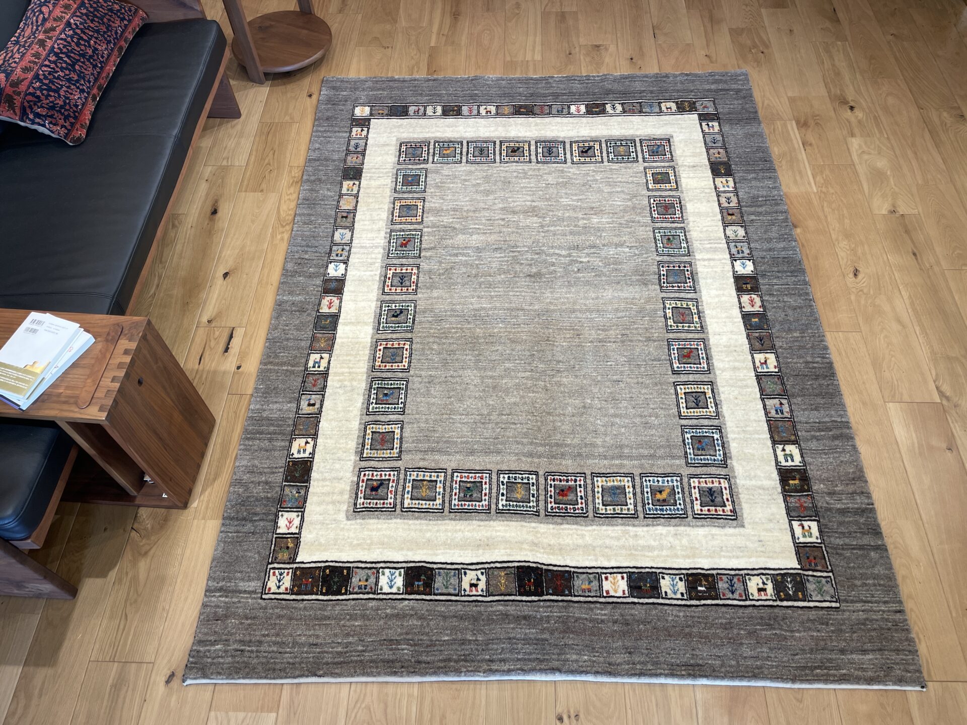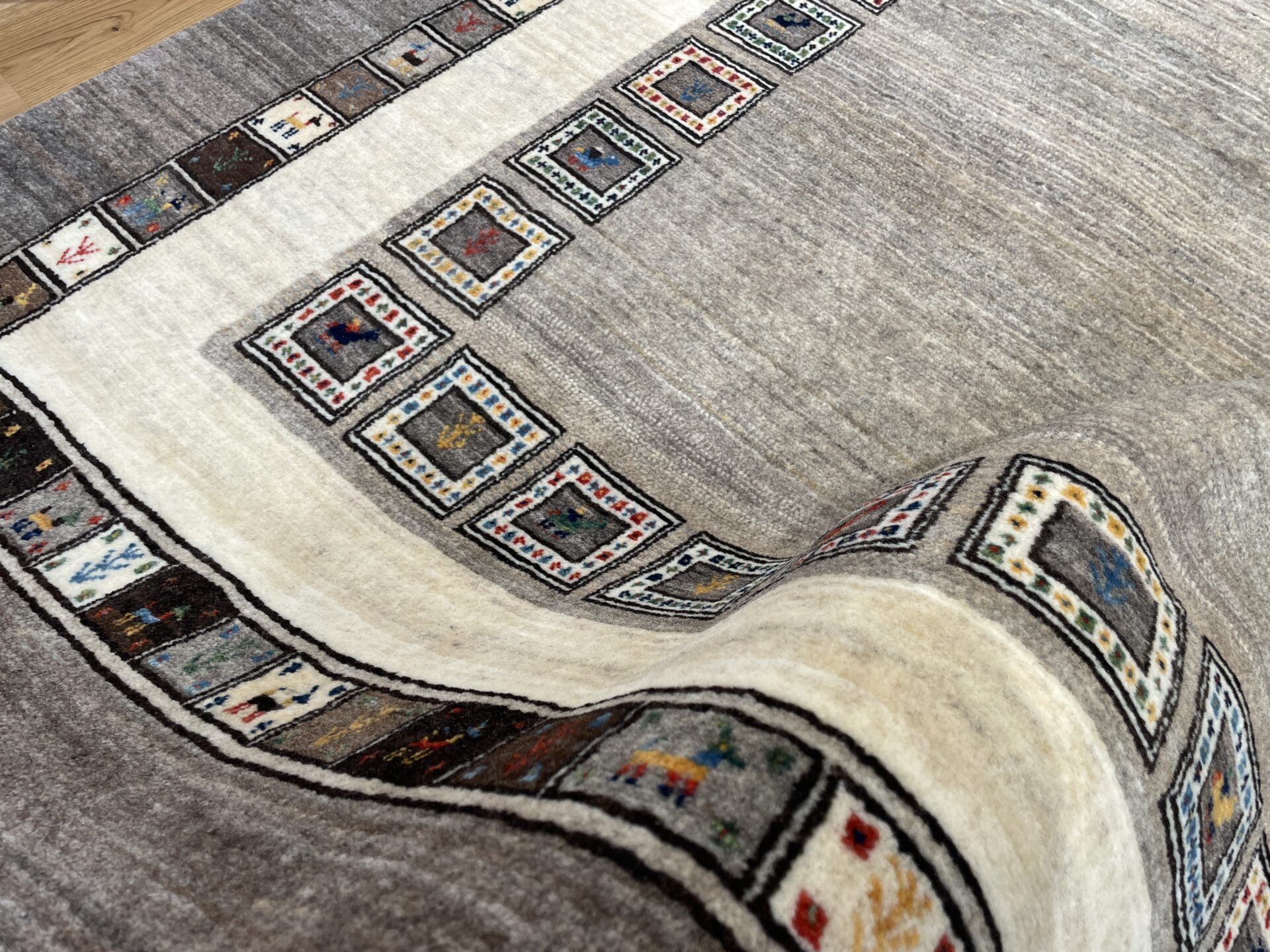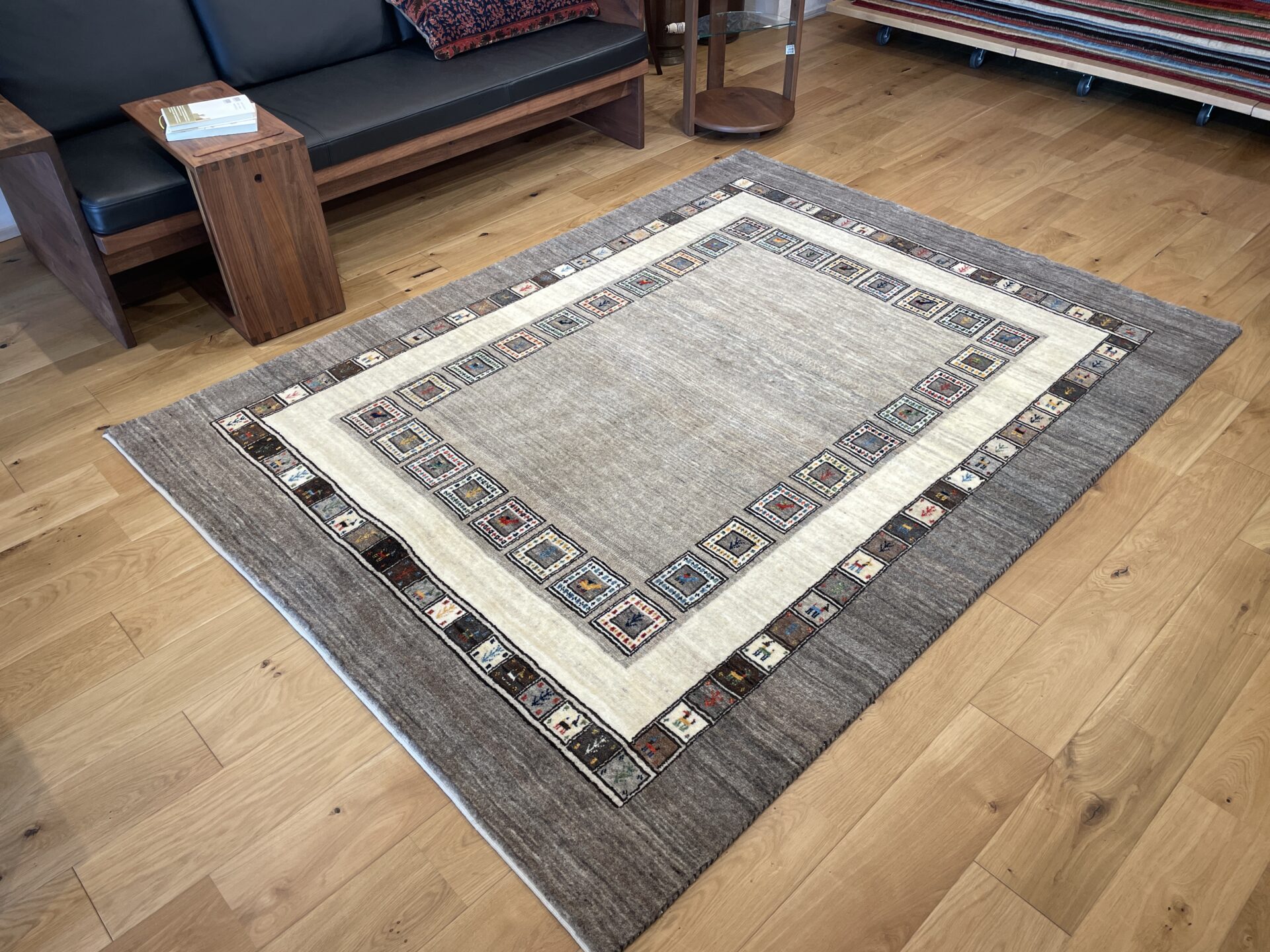 ギャッベにはしっかりした織りの「アマレ」、軽やかで繊細な「カシュクリ」、最高峰の緻密さを誇る「ルリバフ」のシリーズがあります。カシュクリ・ギャッベはアマレよりも細かな糸を使い、より緻密で滑らかな織りが特徴です。草木染めの色が美しく映え、模様の表現力も豊か。品質と軽やかさのバランスに優れ、使い心地と見た目の両方にこだわりたい方に最適な「カシュクリ ギャッベ」です。