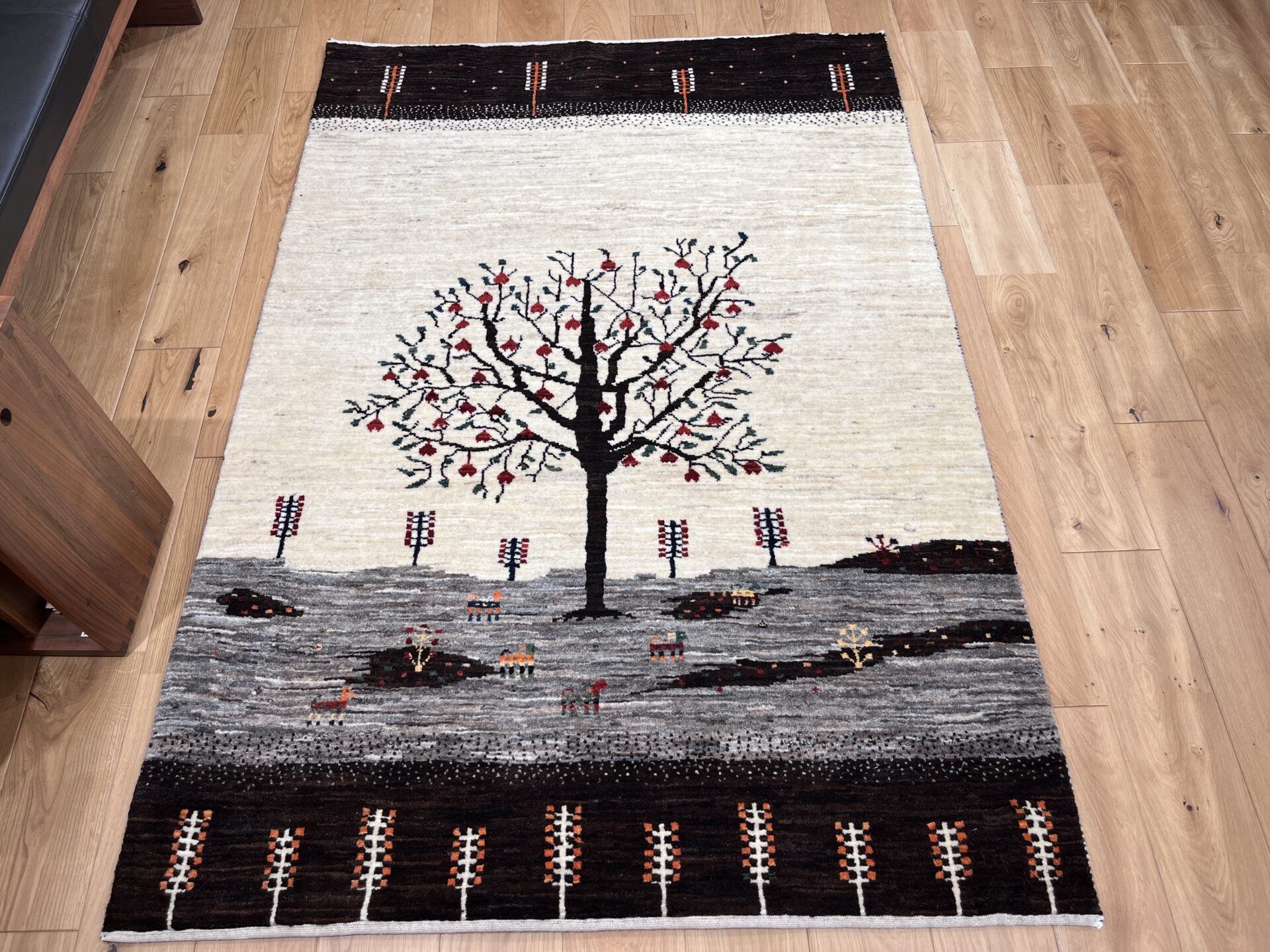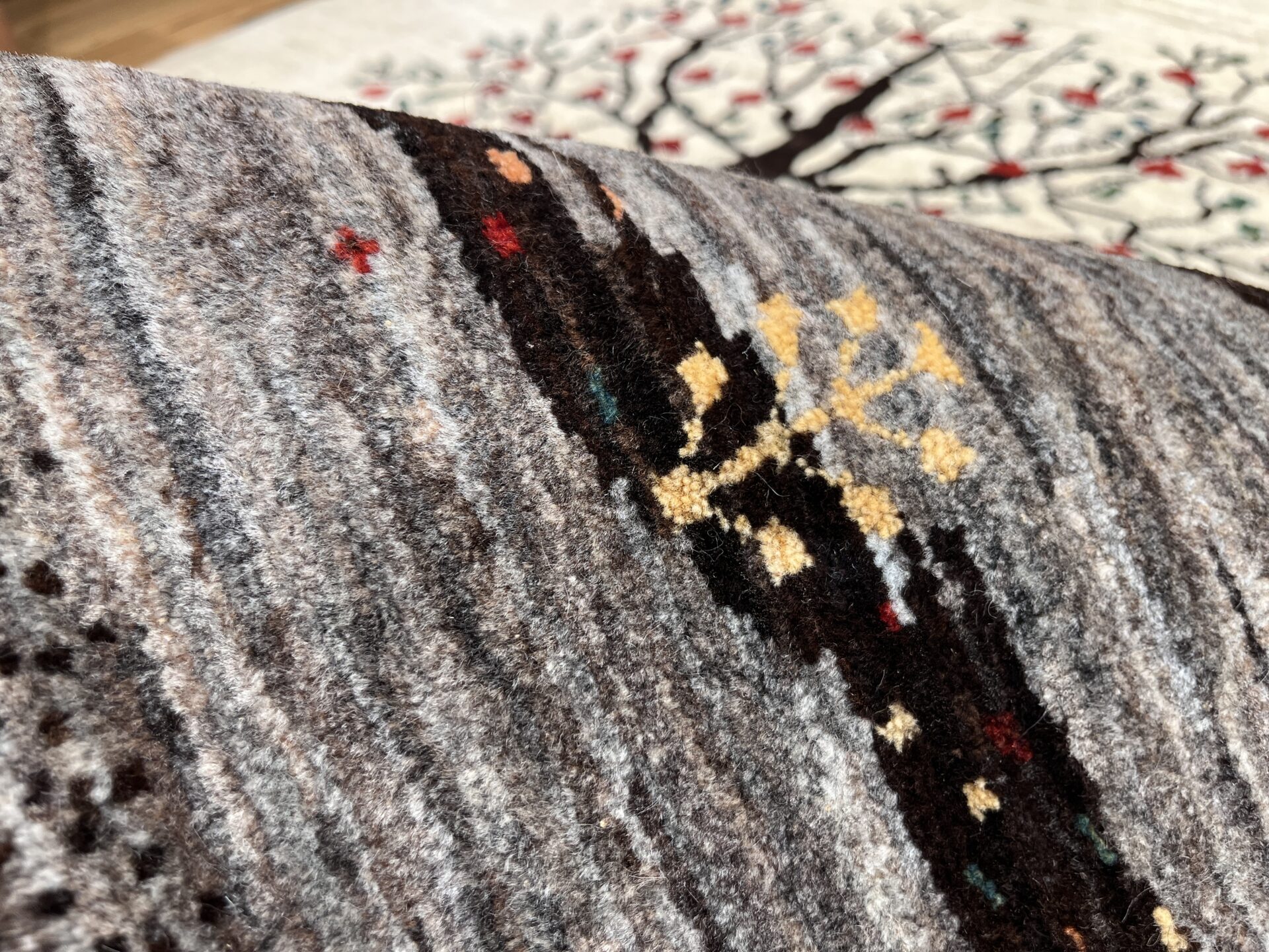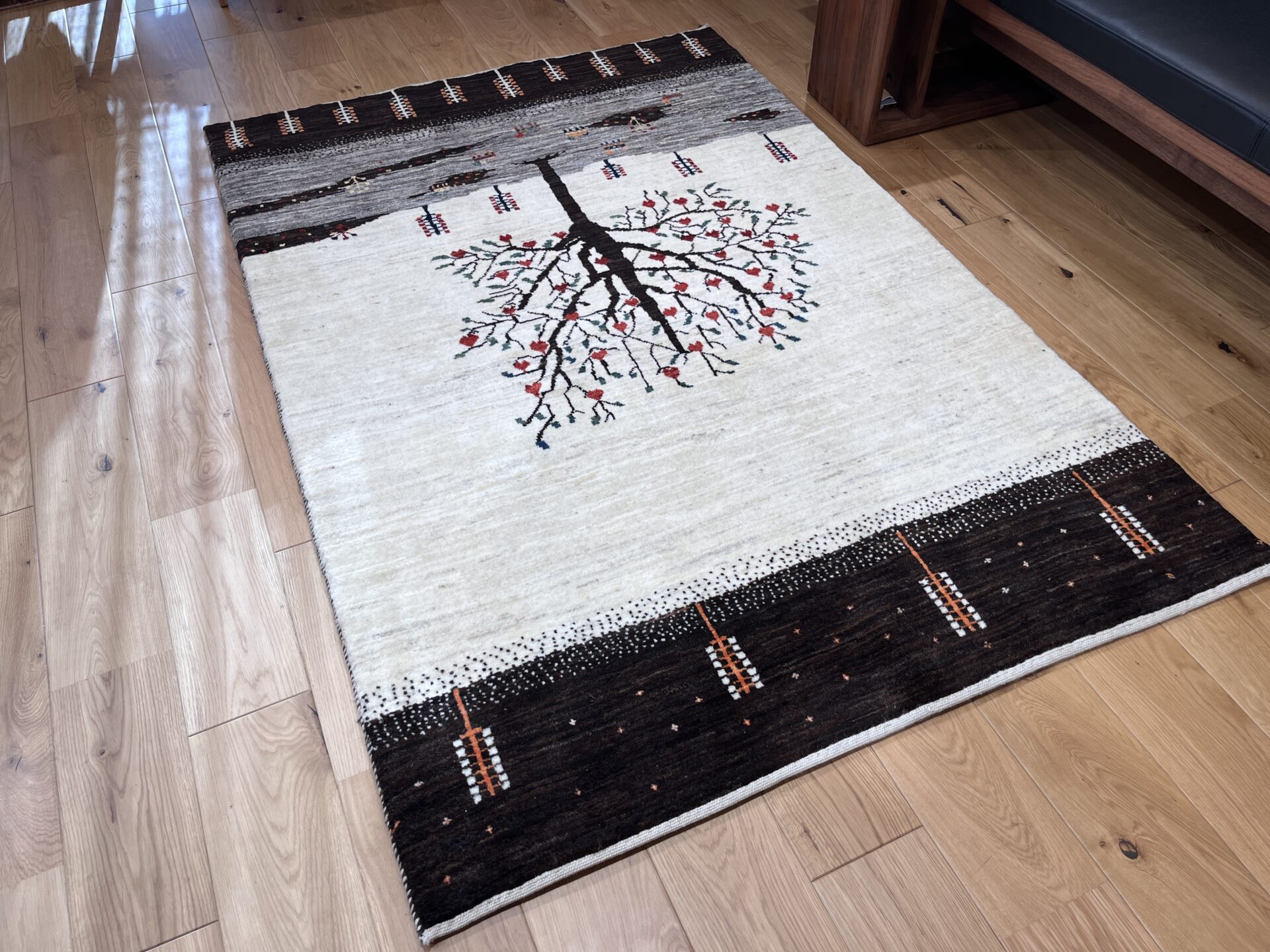 ギャッベにはしっかりした織りの「アマレ」、軽やかで繊細な「カシュクリ」、最高峰の緻密さを誇る「ルリバフ」のシリーズがあります。カシュクリ・ギャッベはアマレよりも細かな糸を使い、より緻密で滑らかな織りが特徴です。草木染めの色が美しく映え、模様の表現力も豊か。品質と軽やかさのバランスに優れ、使い心地と見た目の両方にこだわりたい方に最適な「カシュクリ ギャッベ」です。