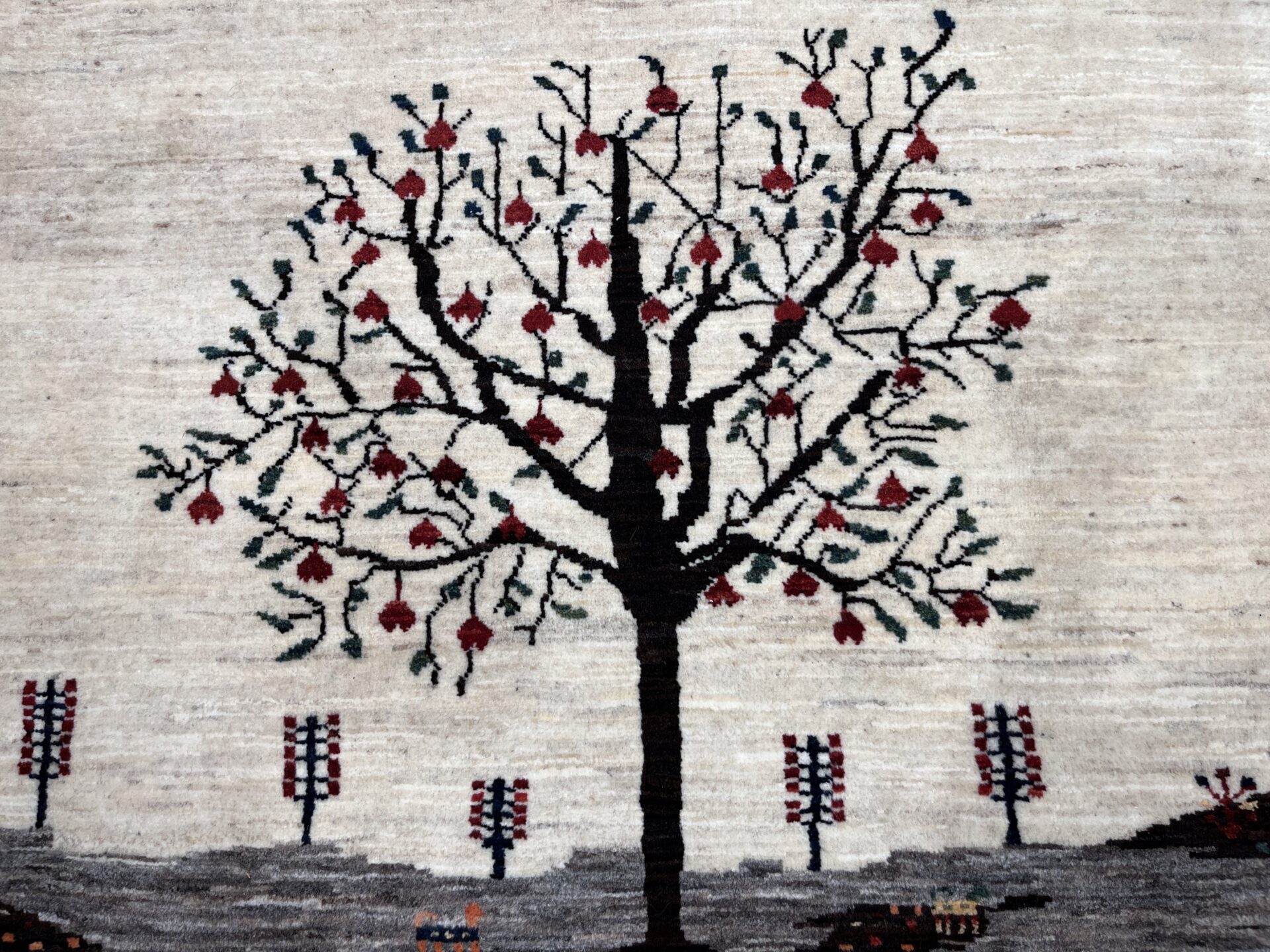 ナチュラルな原毛をそのまま活かしたフィールドに、大きく力強く描かれた「ザクロの木」。