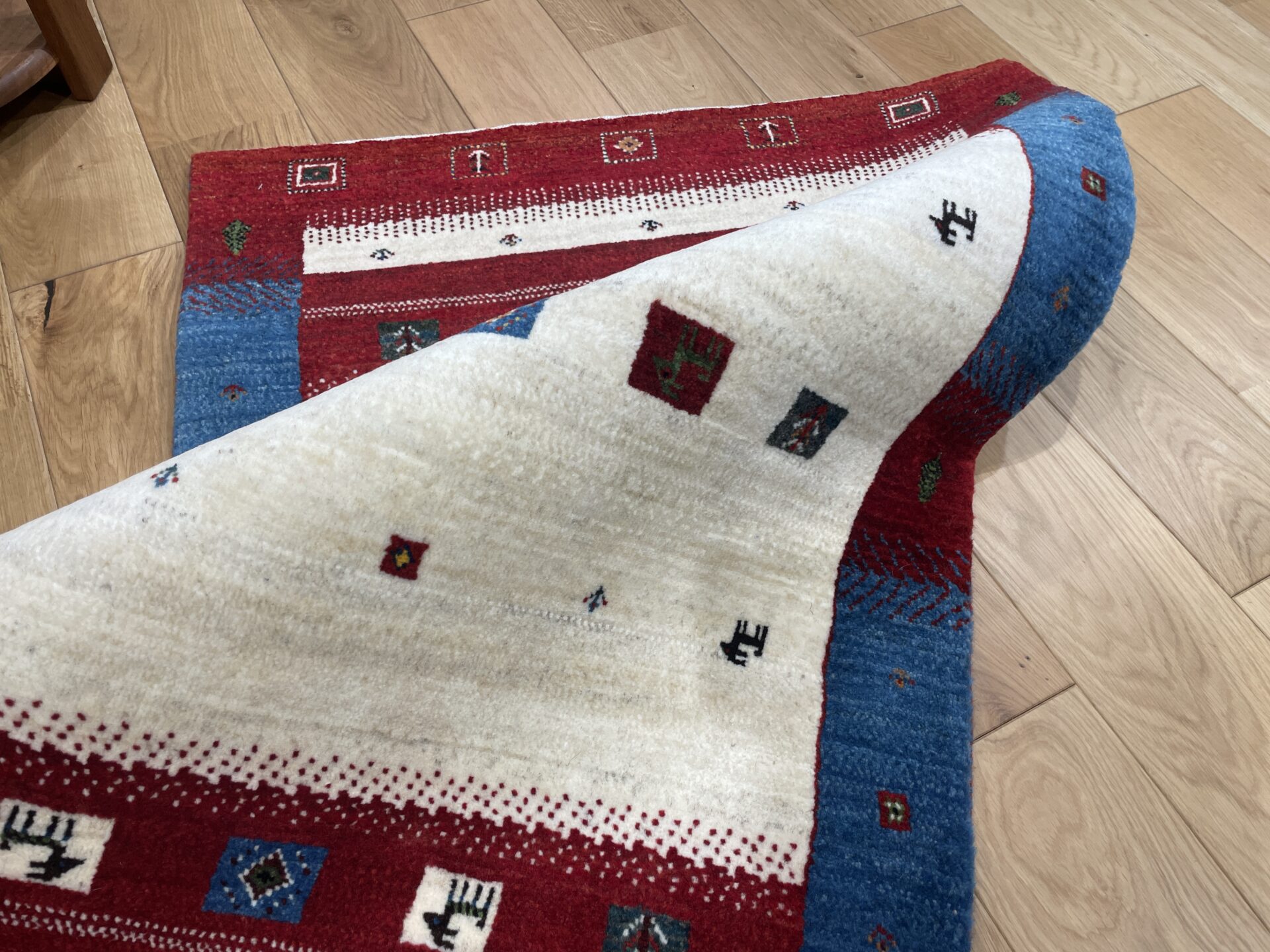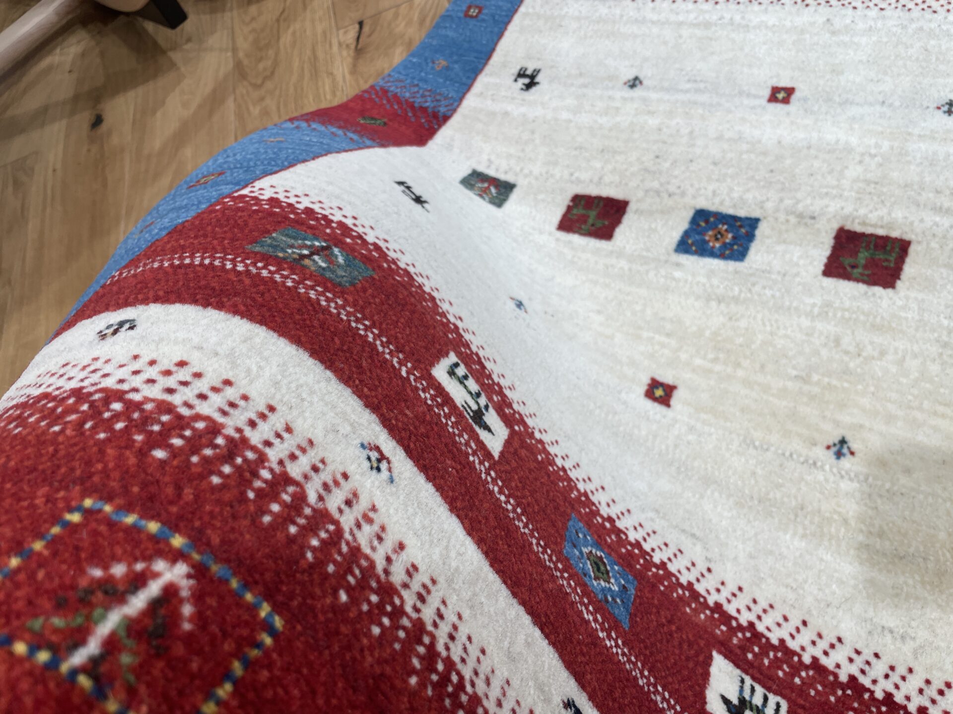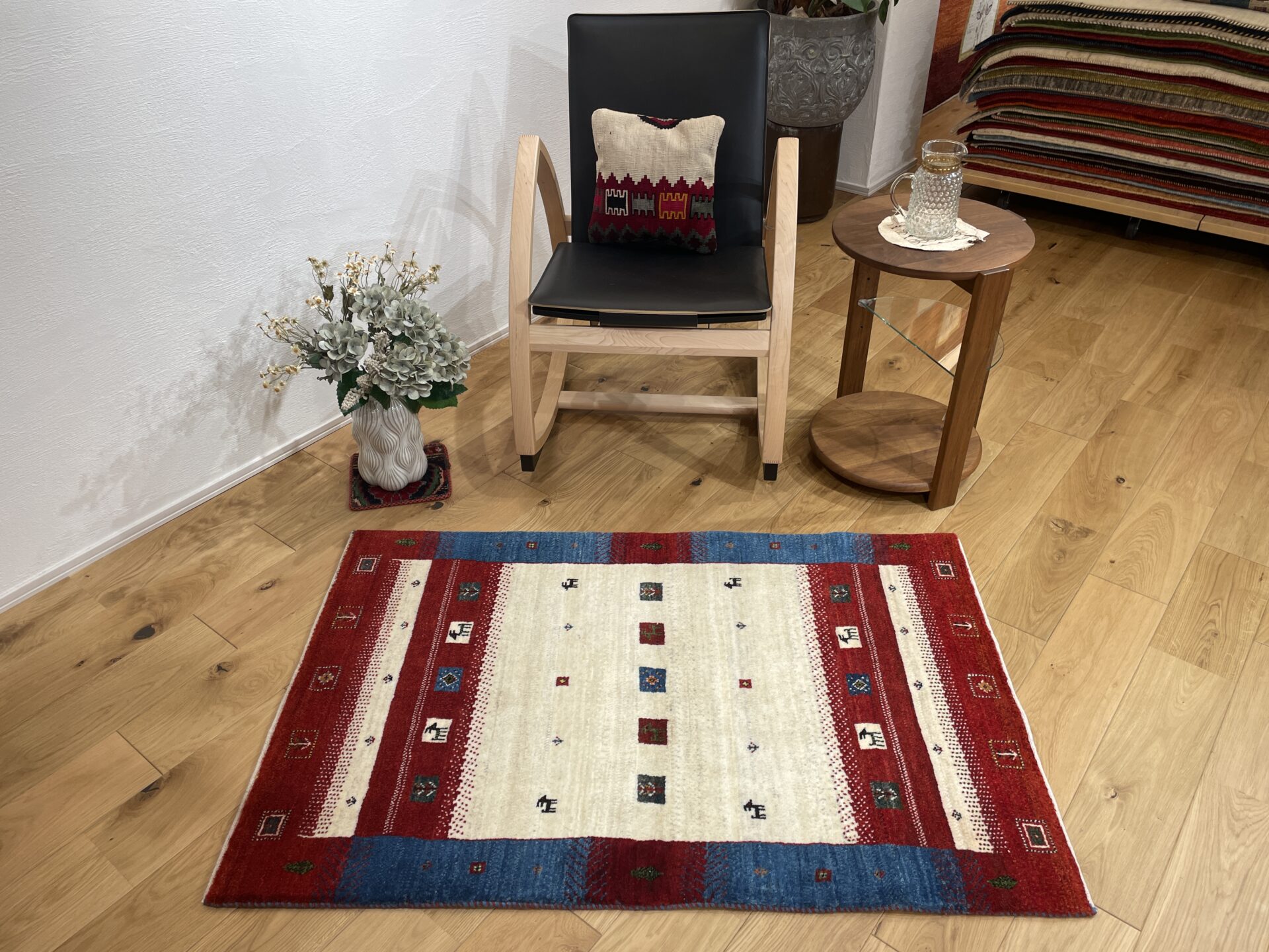 ギャッベにはしっかりした織りの「アマレ」、軽やかで繊細な「カシュクリ」、最高峰の緻密さを誇る「ルリバフ」のシリーズがあります。カシュクリ・ギャッベはアマレよりも細かな糸を使い、より緻密で滑らかな織りが特徴です。草木染めの色が美しく映え、模様の表現力も豊か。品質と軽やかさのバランスに優れ、使い心地と見た目の両方にこだわりたい方に最適な「カシュクリ ギャッベ」です。