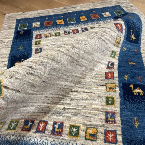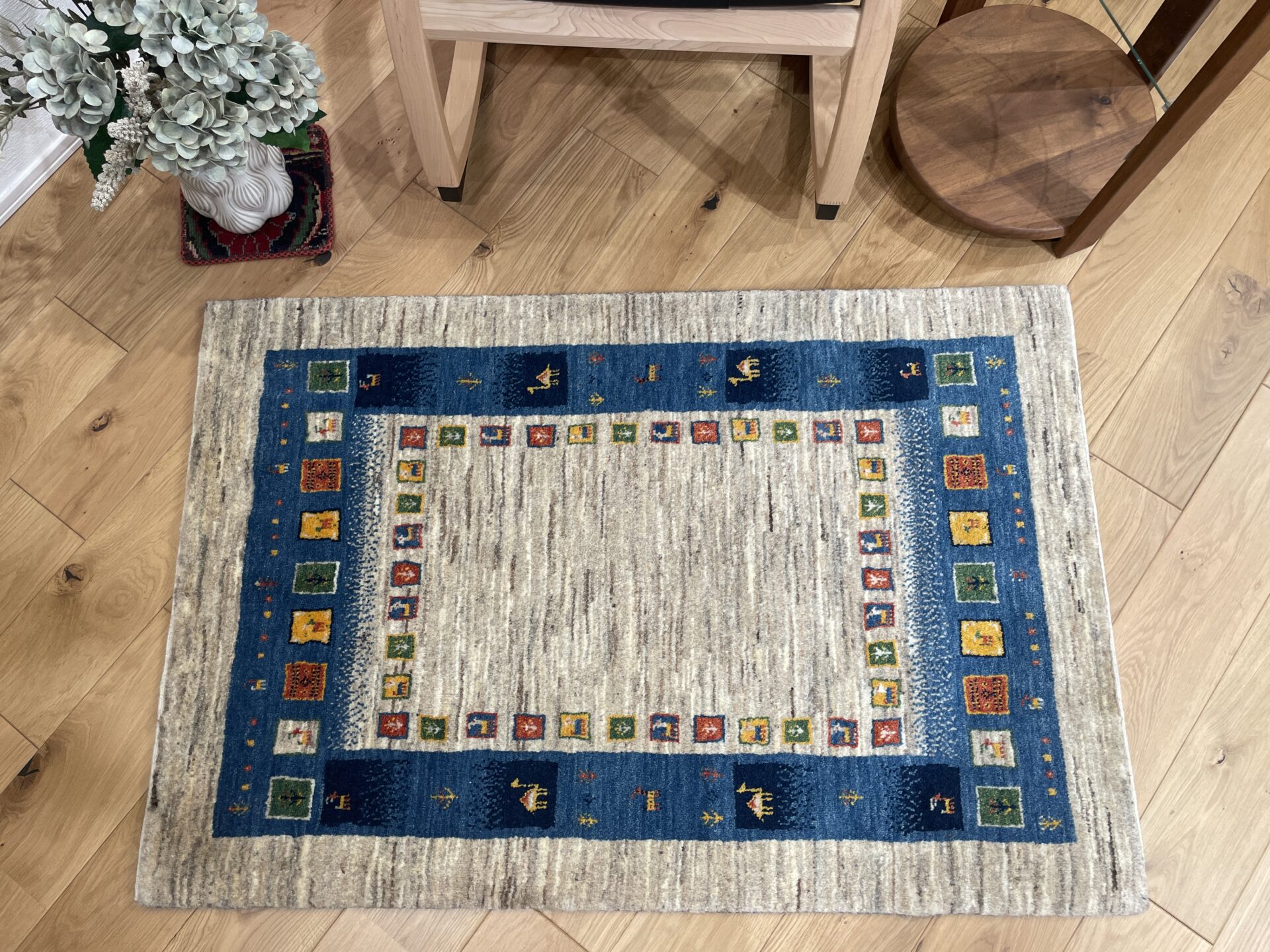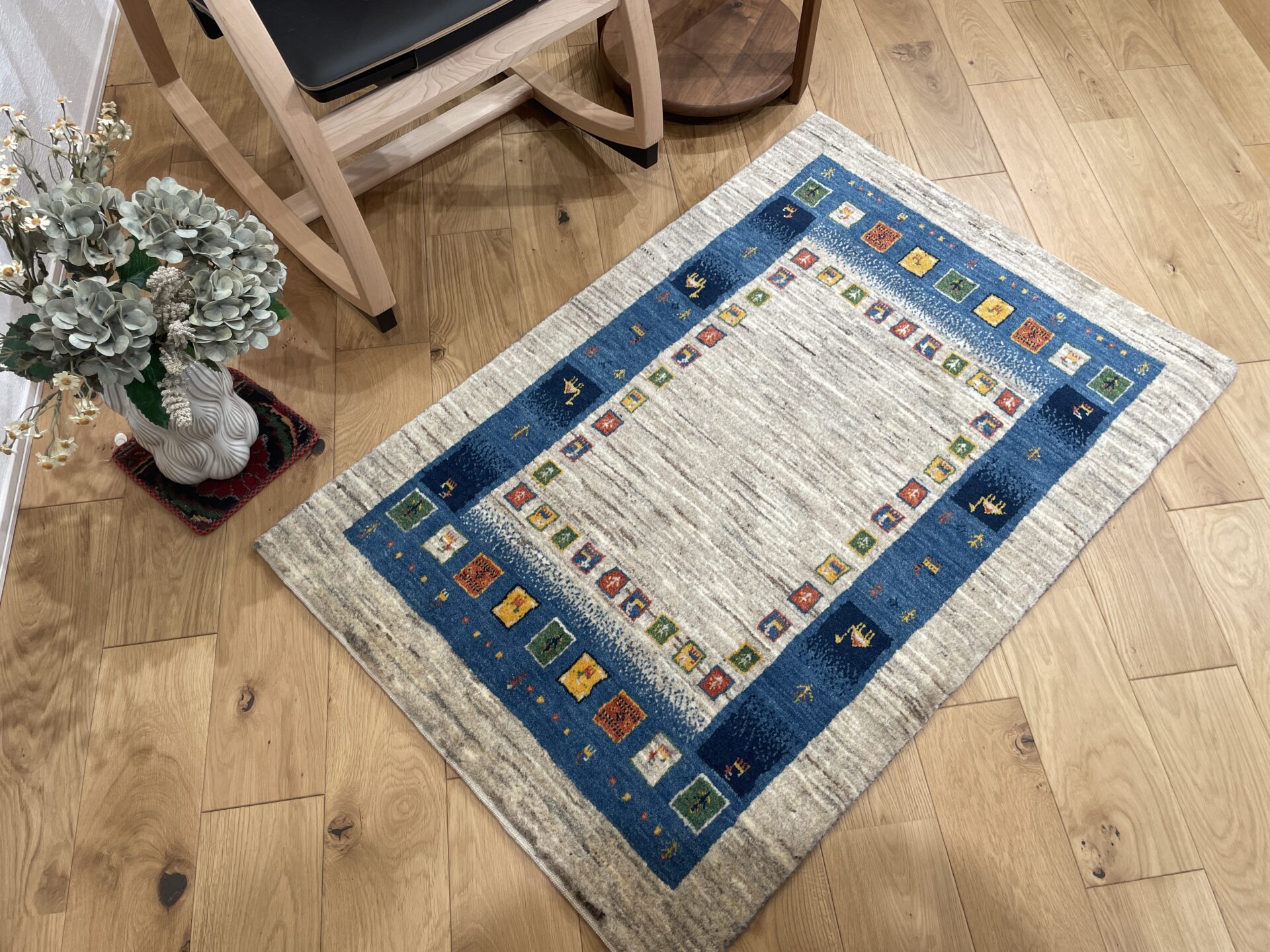 原毛をフィールドに周囲の深いブルーの枠取りがアクセントを添え、上質な羊毛を丁寧に手結びしたカシュクリならではの、繊細で美しく、しなやかさと心地よさを堪能できます。