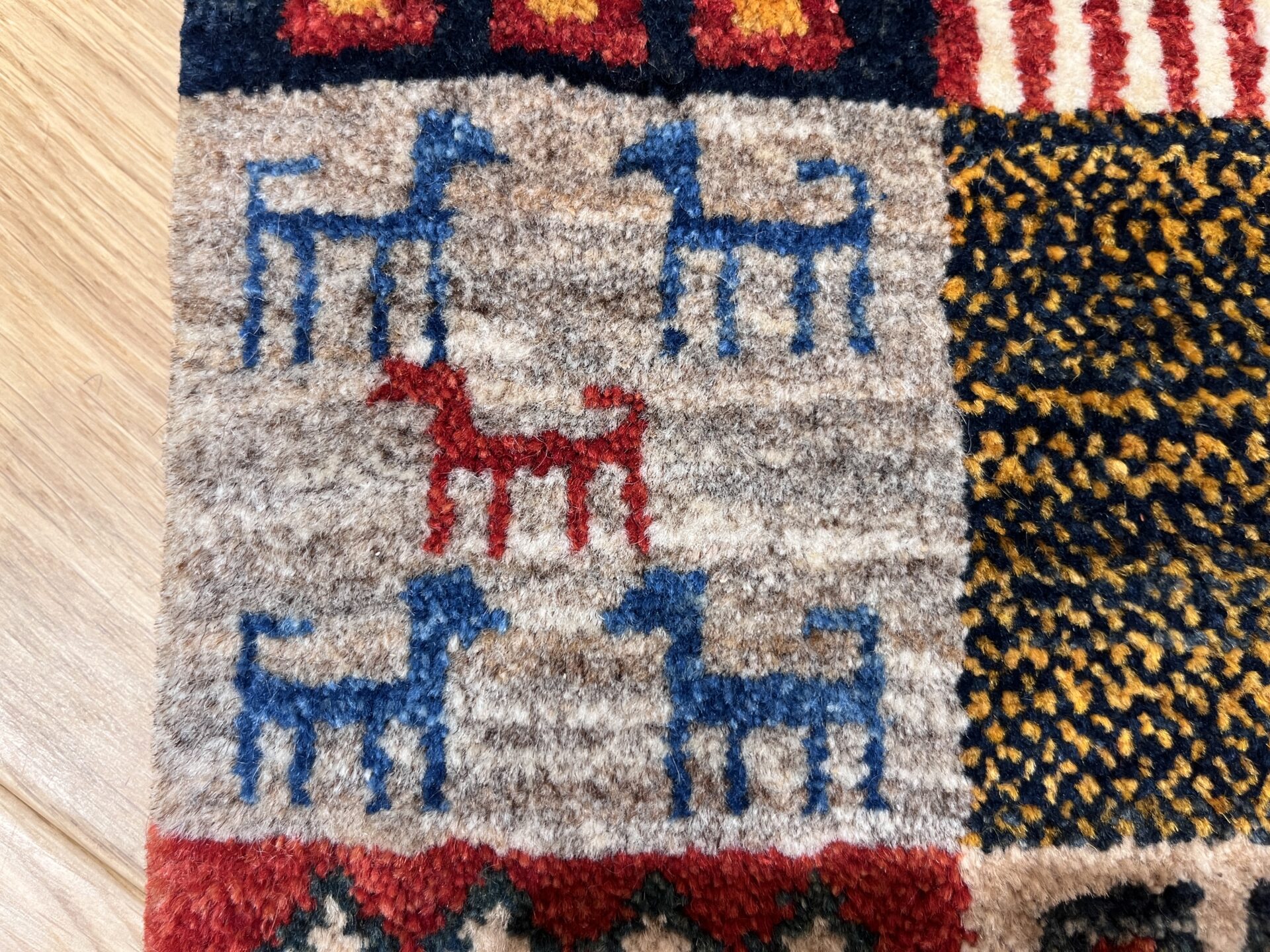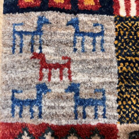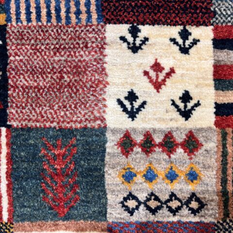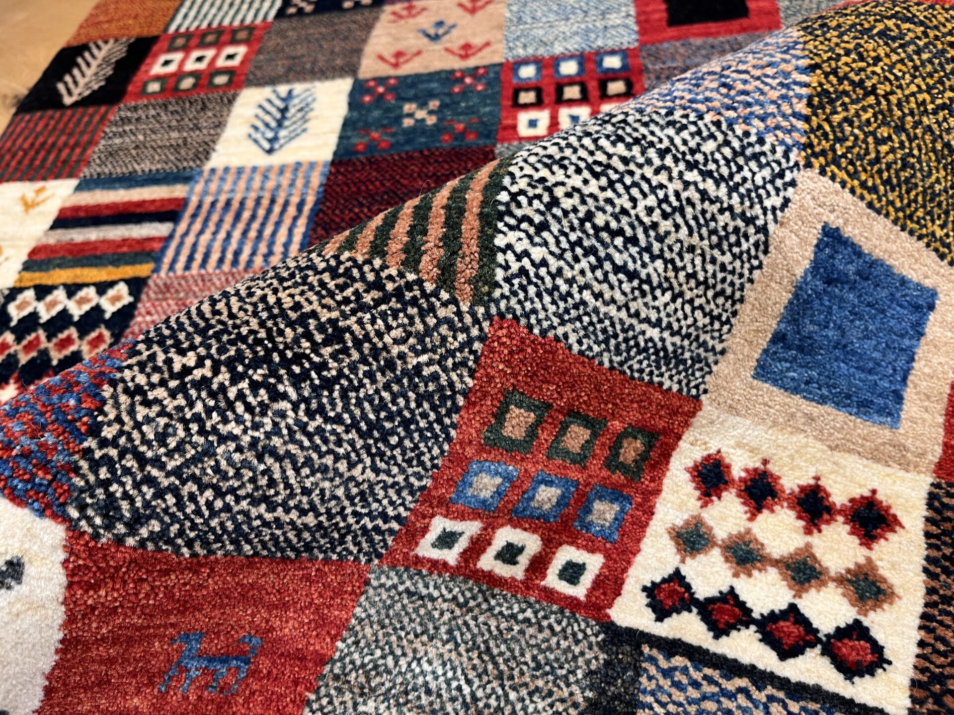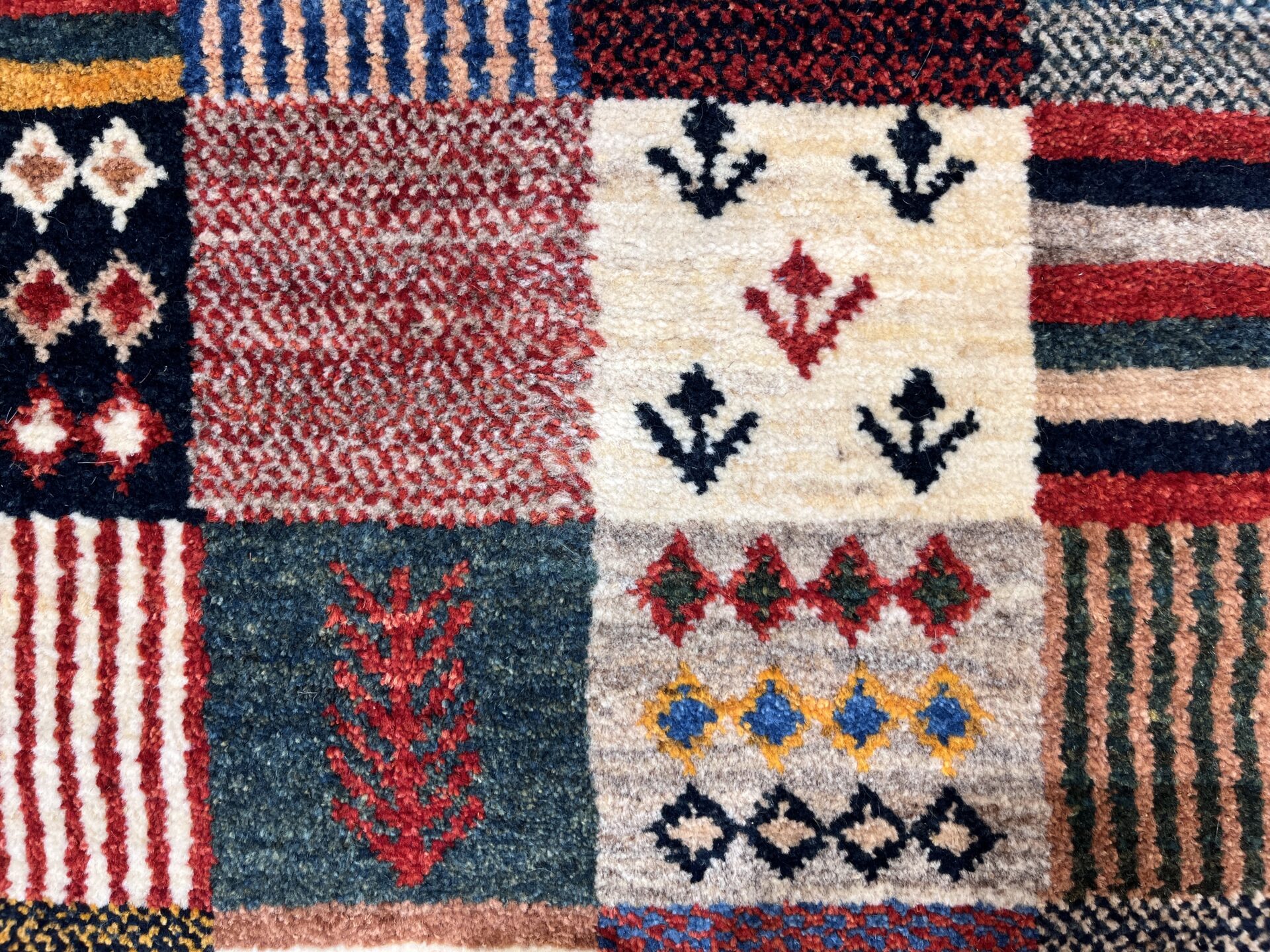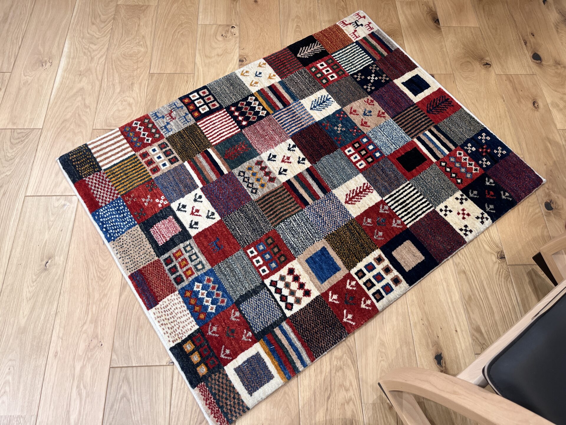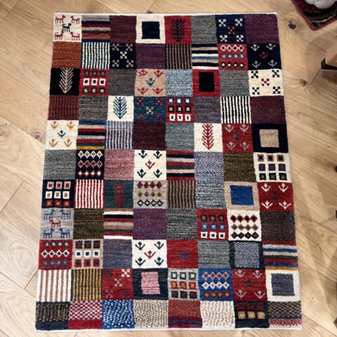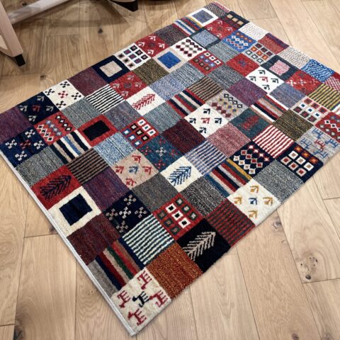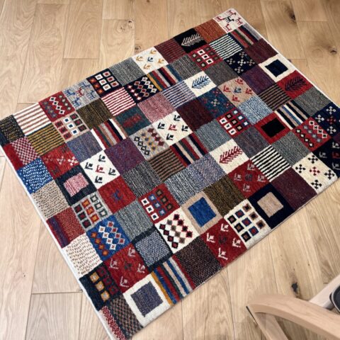 ギャッベ全体を埋め尽くすように織り込まれたパッチワーク模様。