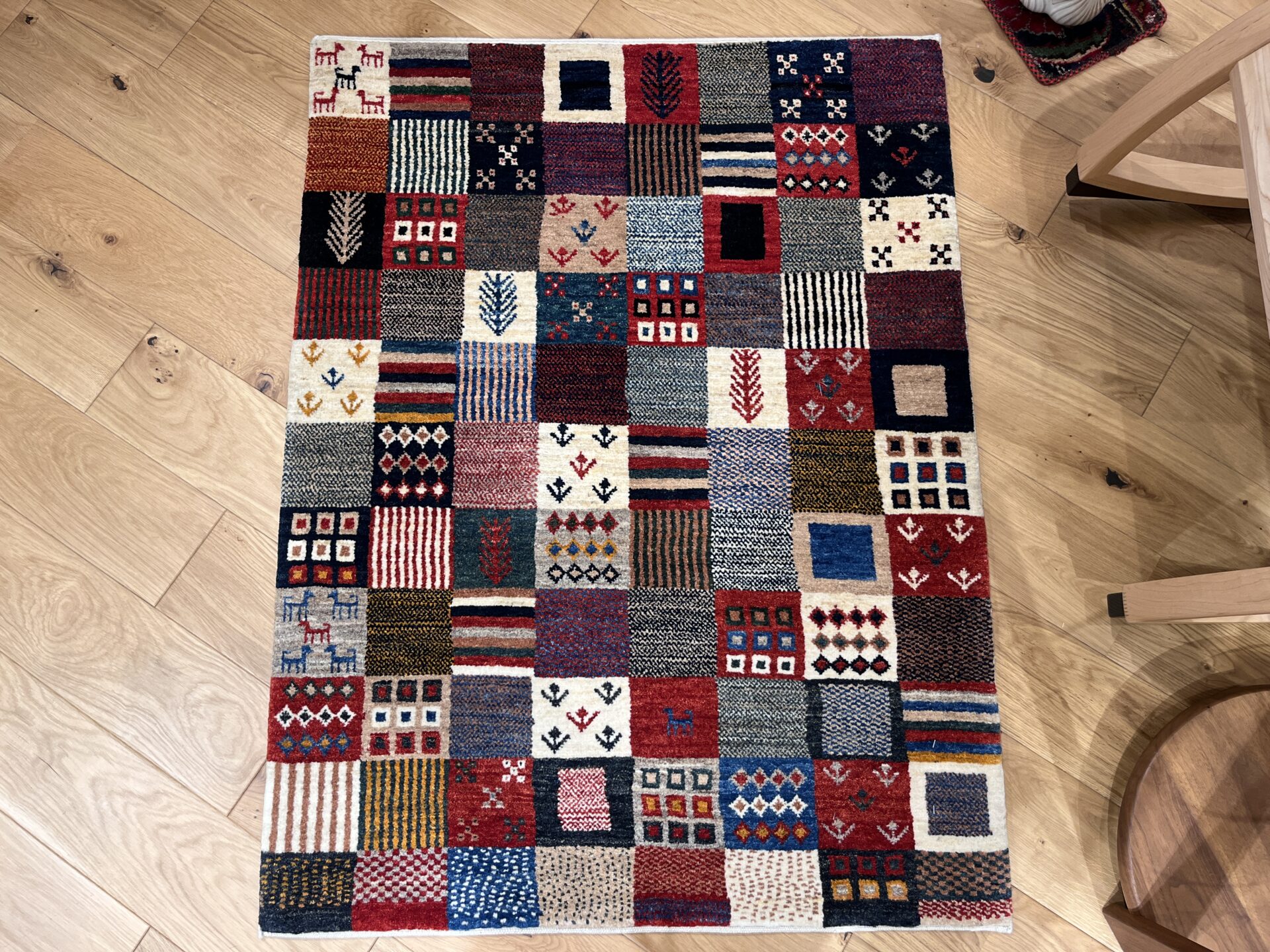四角ごとに異なる色や紋様がぎっしりと並び、まるで遊牧民の物語をひとつの絨毯に閉じ込めたような表情豊かな一枚です。