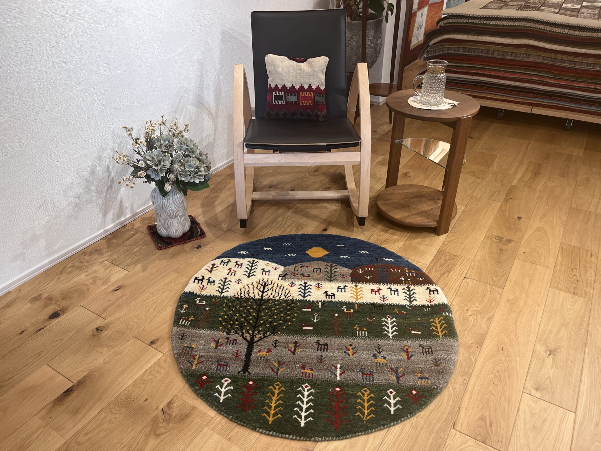 草木染めのやわらかな色彩と原毛のナチュラルな風合いが調和し、リビングや寝室に敷けば空間をやさしく包み込み、まるで自然の中にいるかのような心地よさを与えてくれる一枚です。