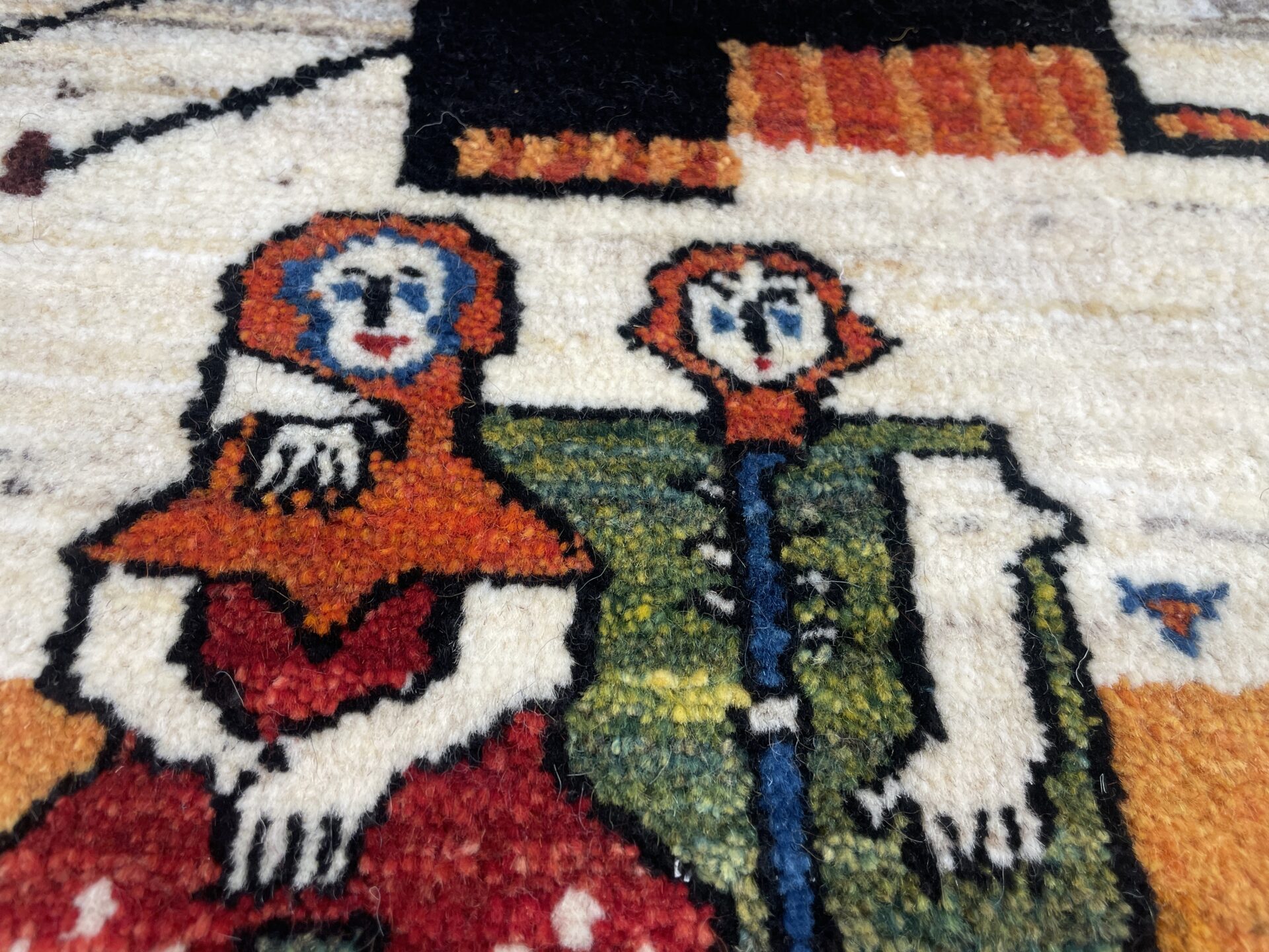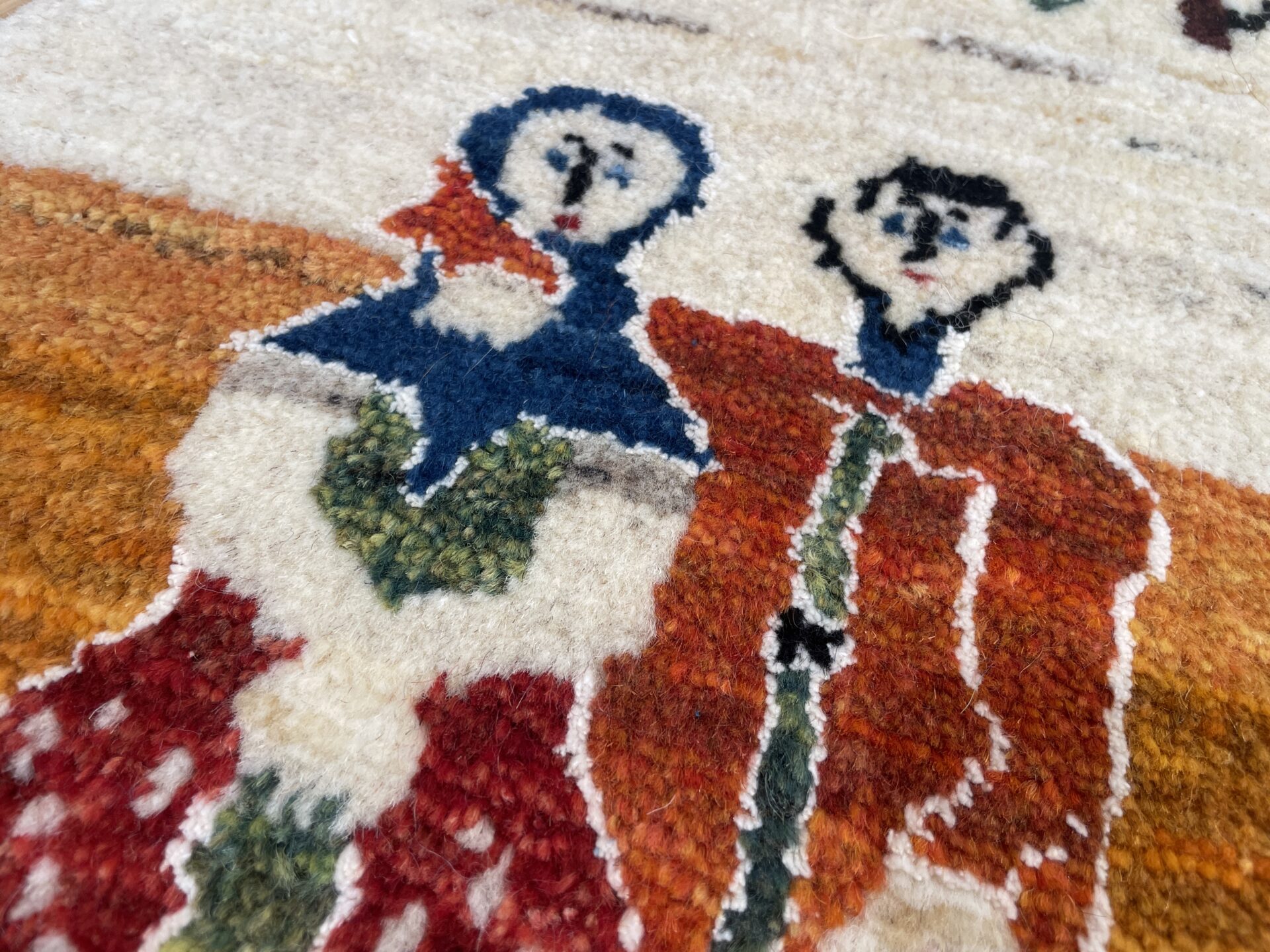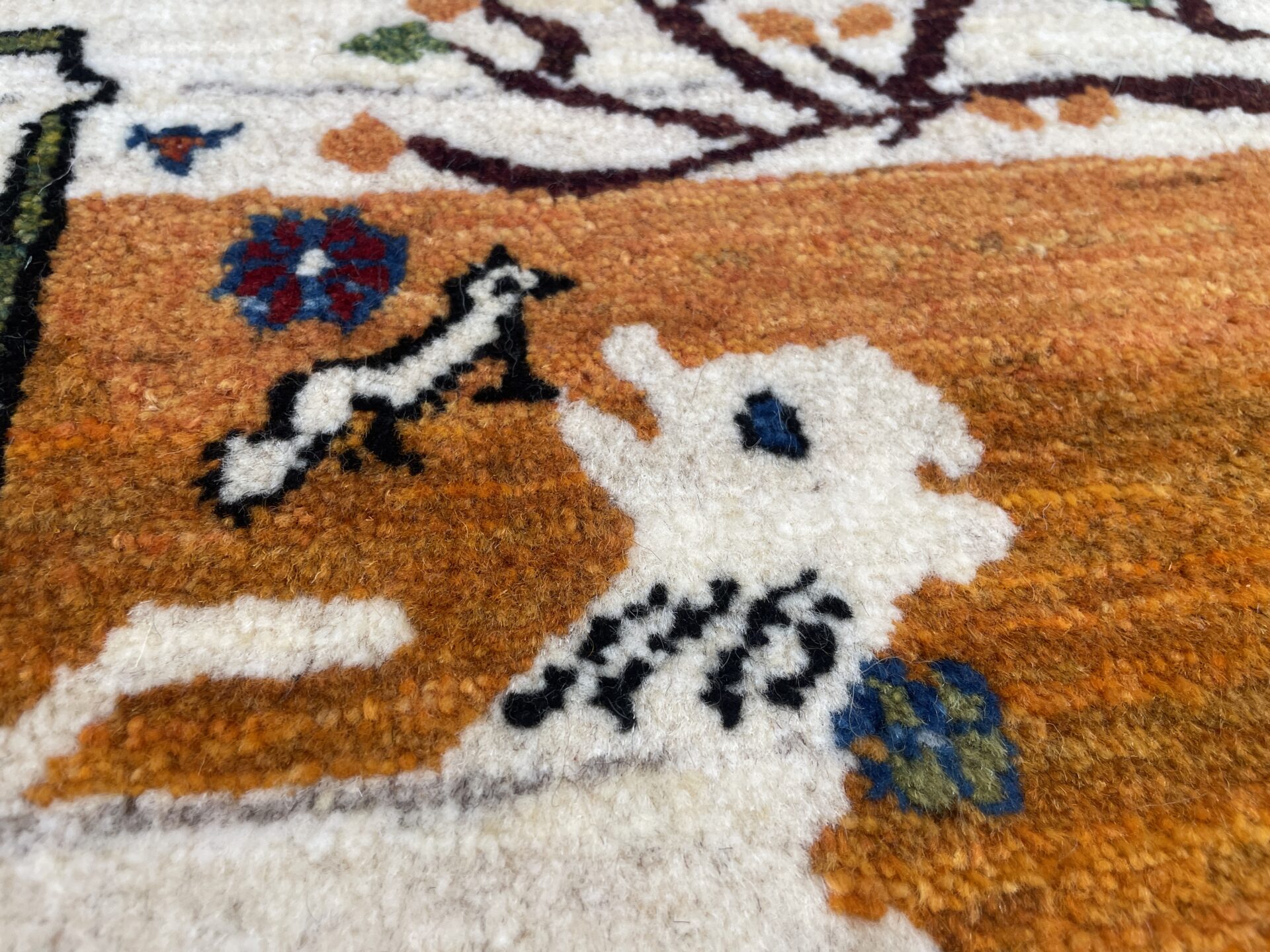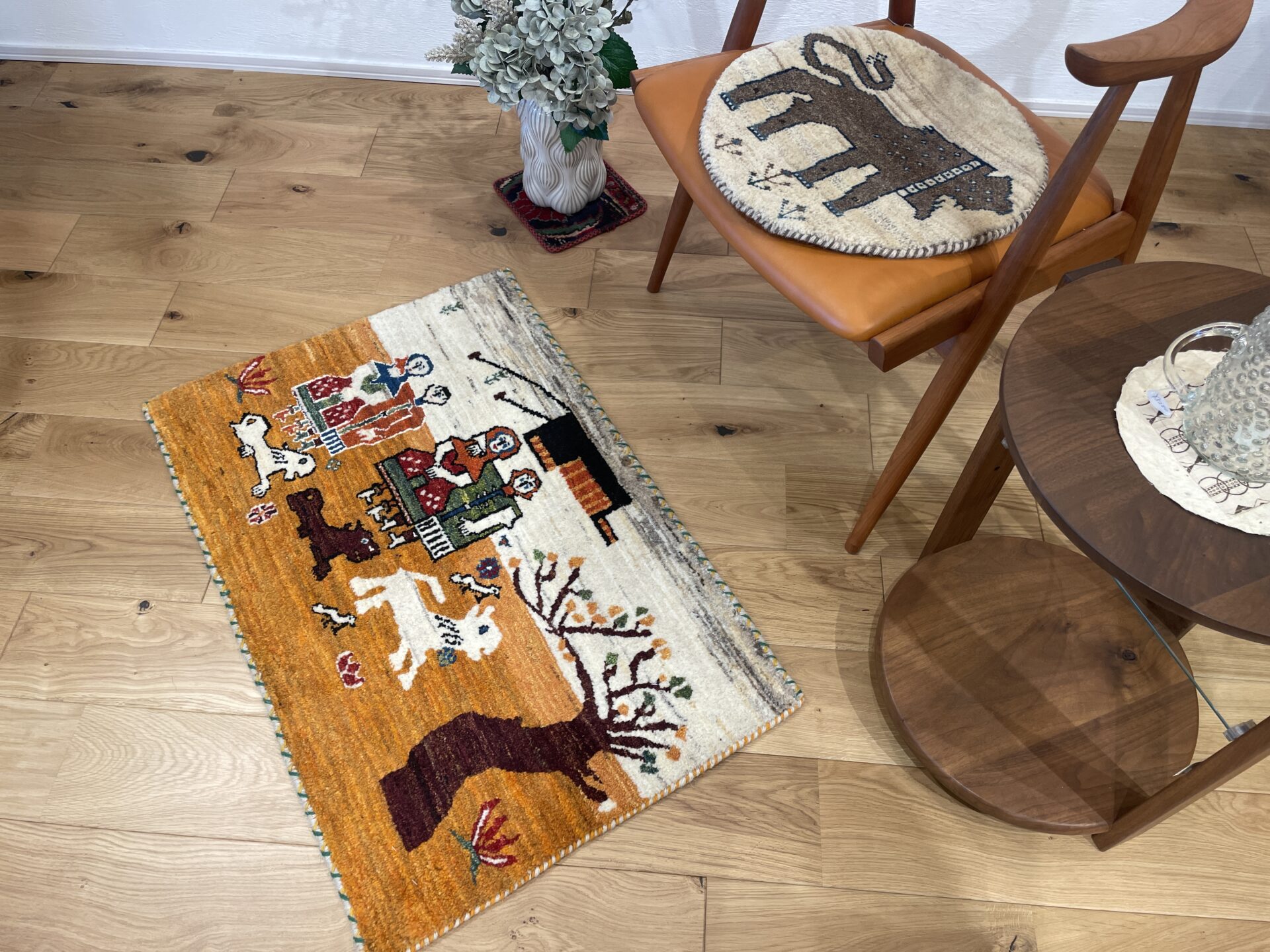 「生命の樹」に見守られた家族と羊たち、そしてテントが描かれ、遊牧民の生活が一枚の絨毯の上に広がった一枚。