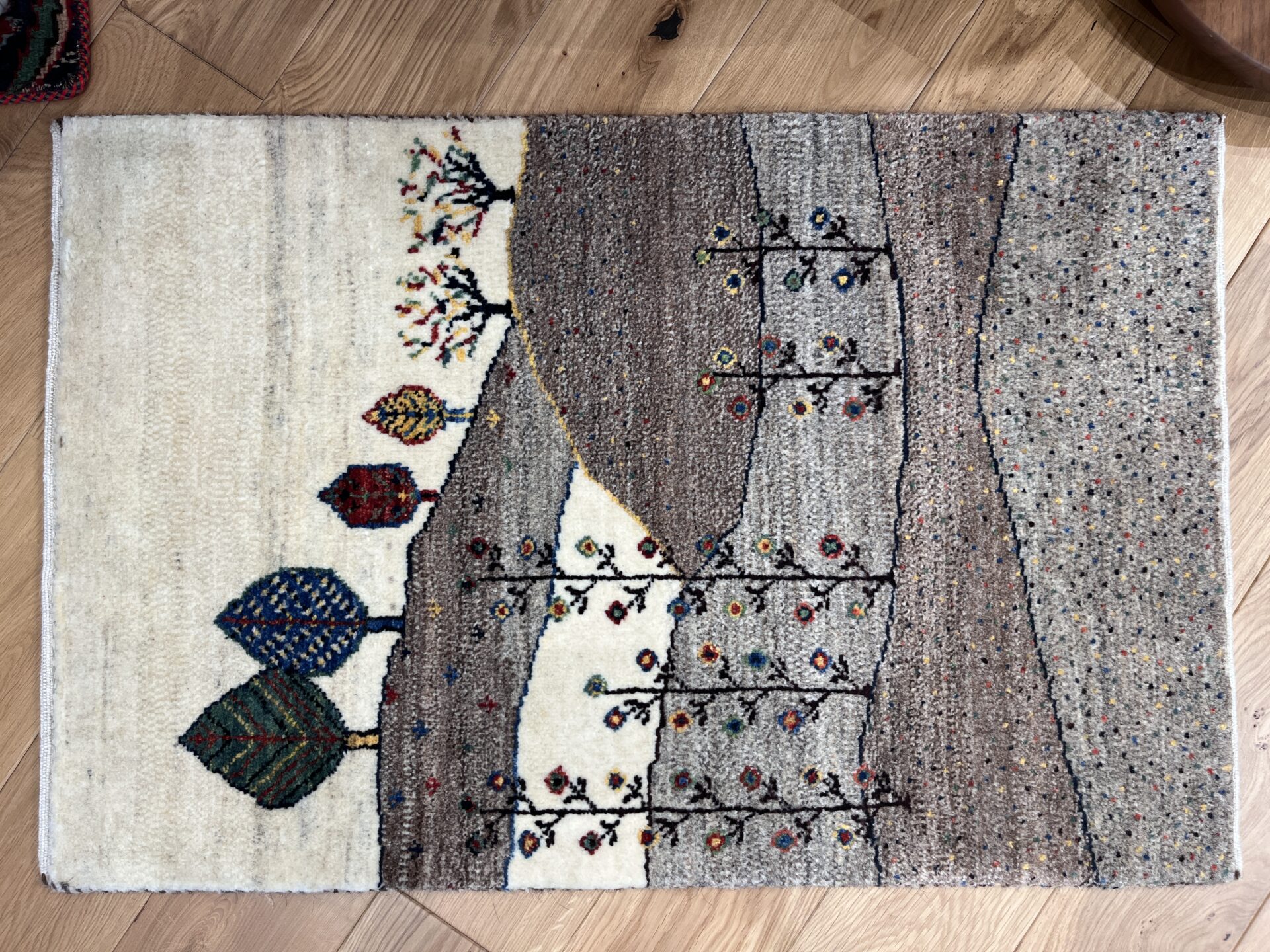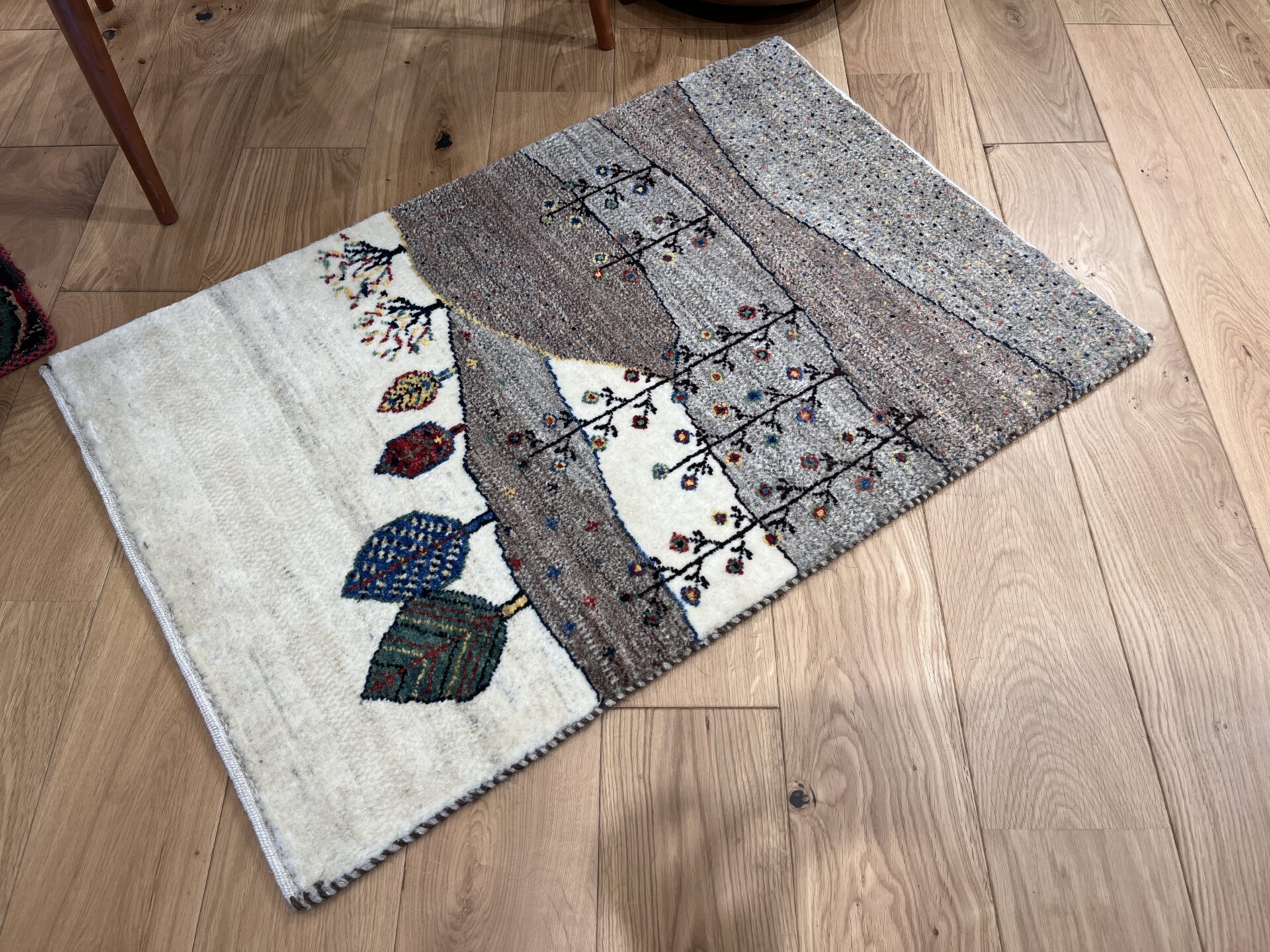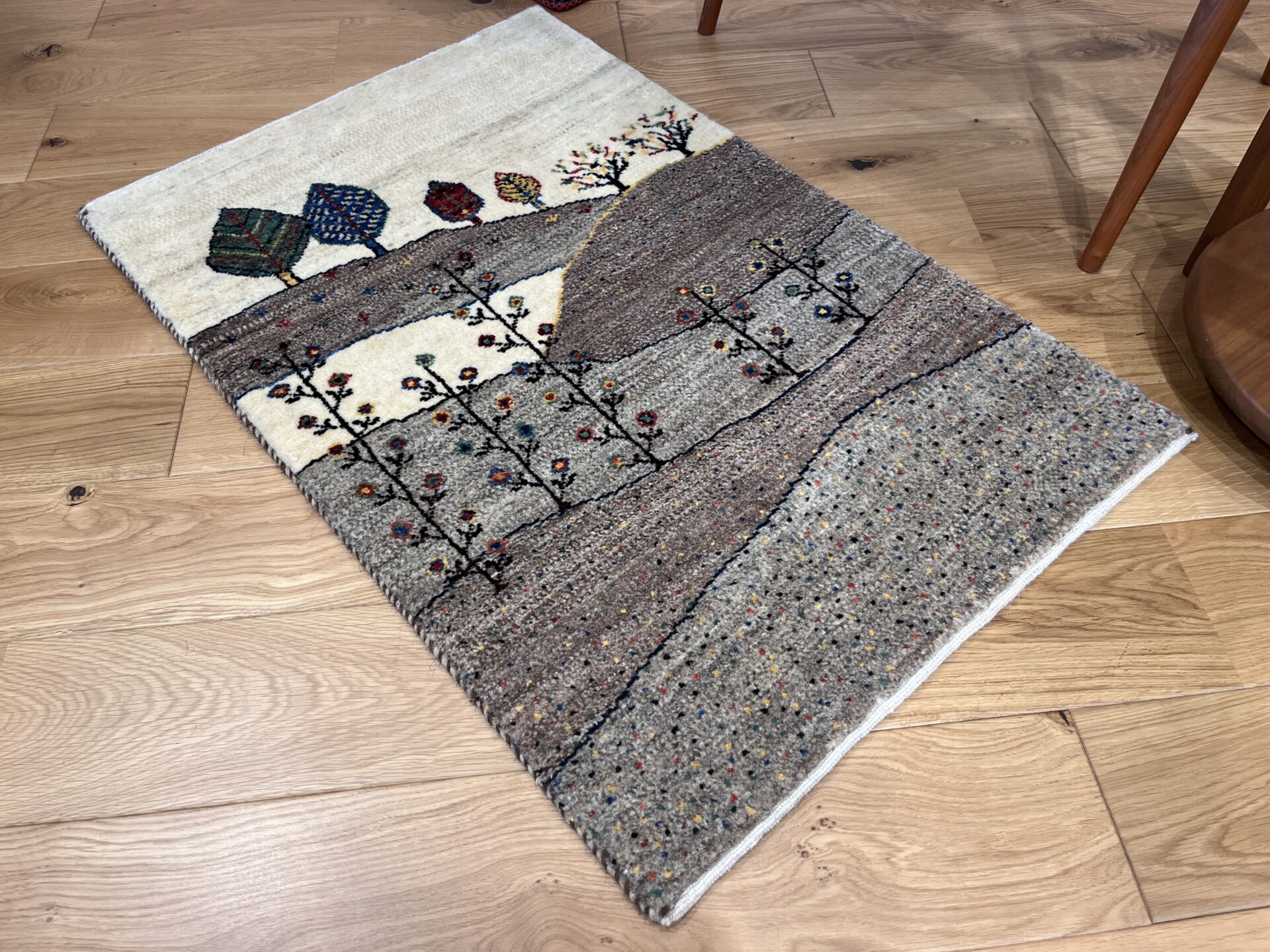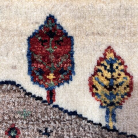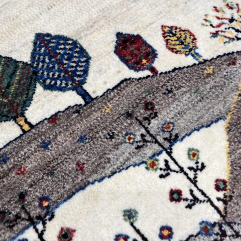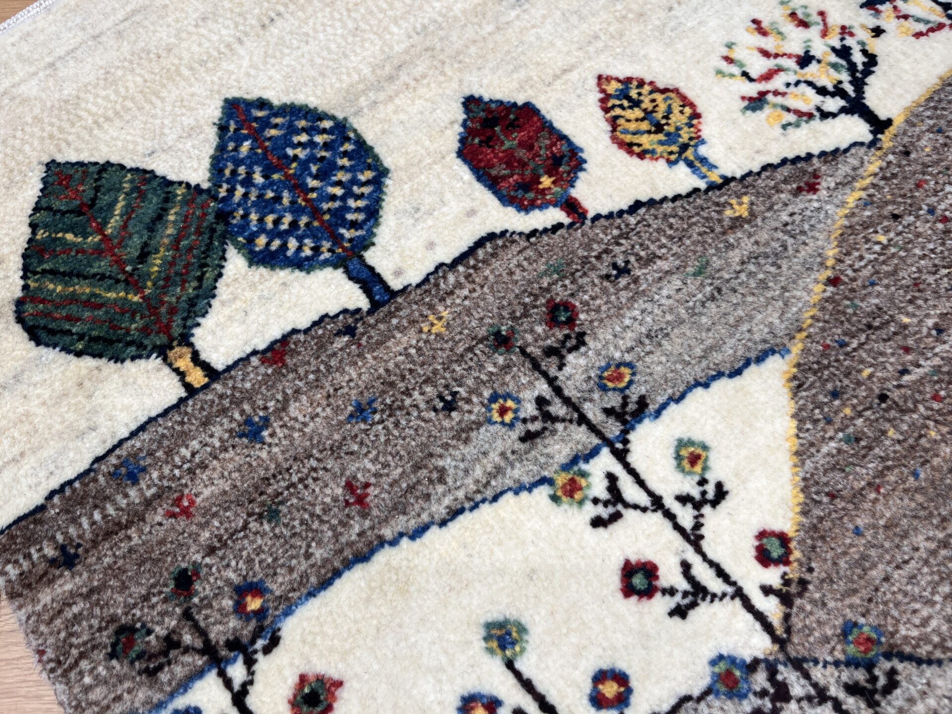 素朴な原毛のフィールドに、色鮮やかな木々やまっすぐに伸びる木に花が咲き誇るように織り込まれたギャッベ。