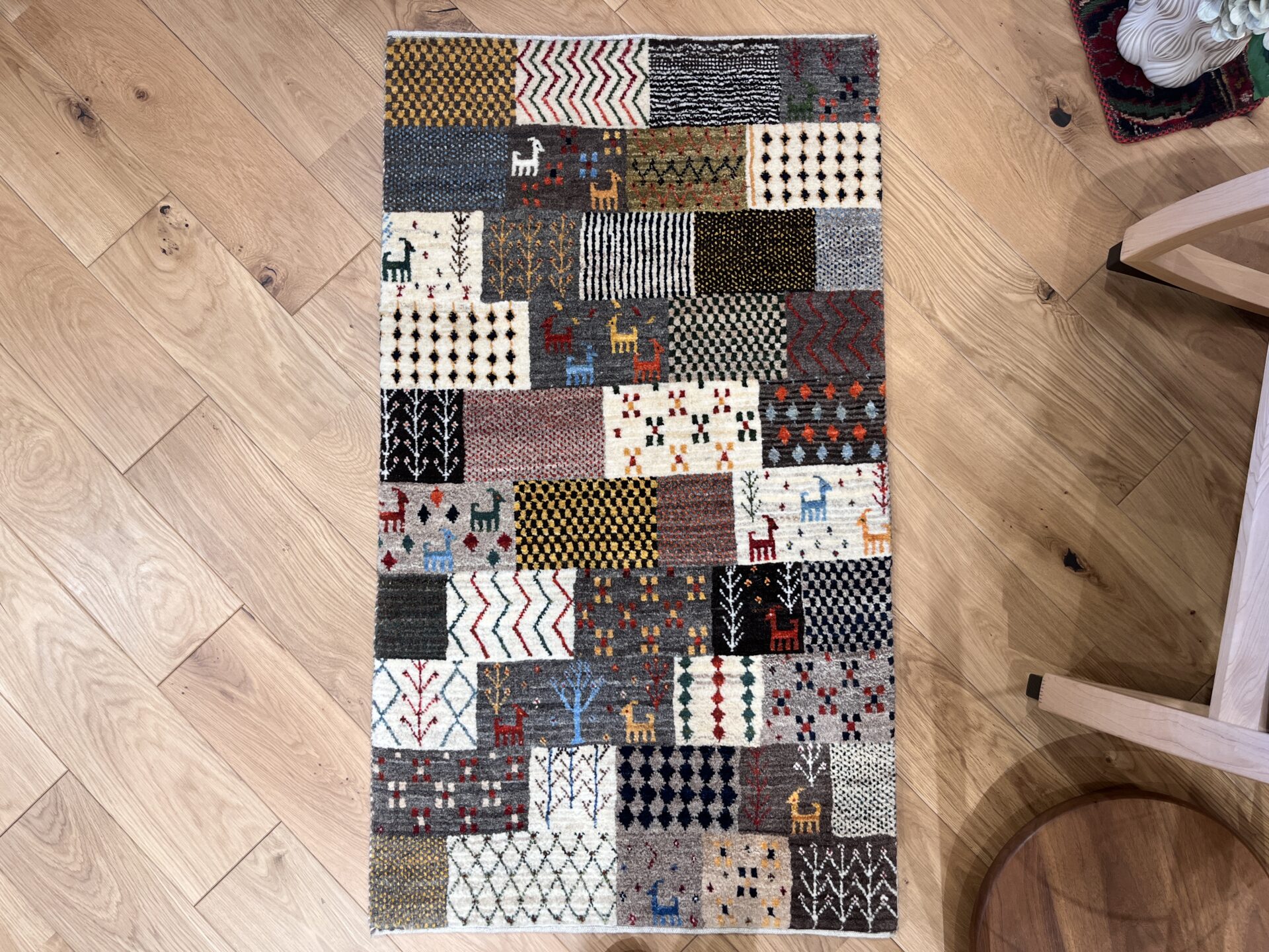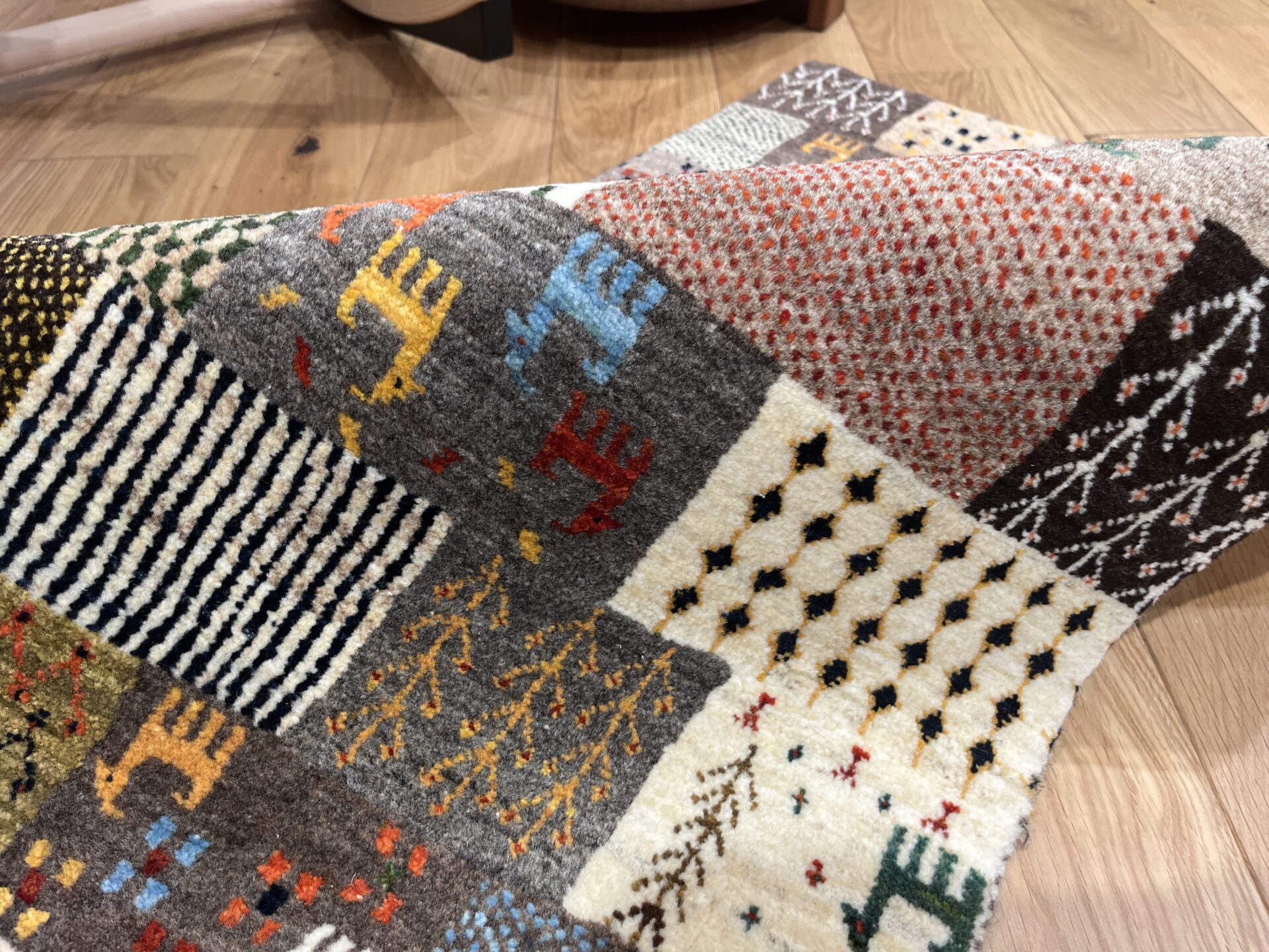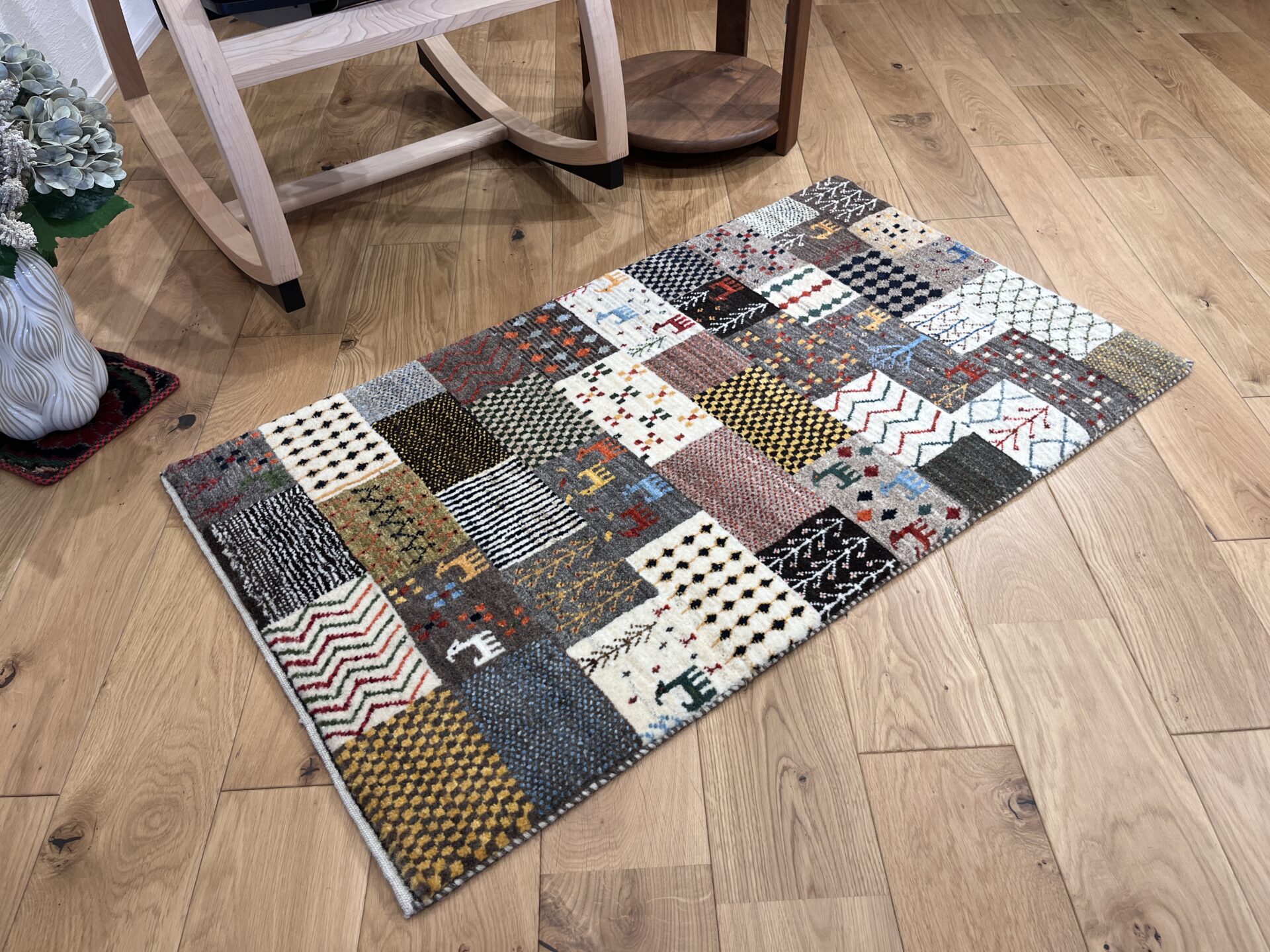ギャッベ全体を埋め尽くすように織り込まれたパッチワーク模様。