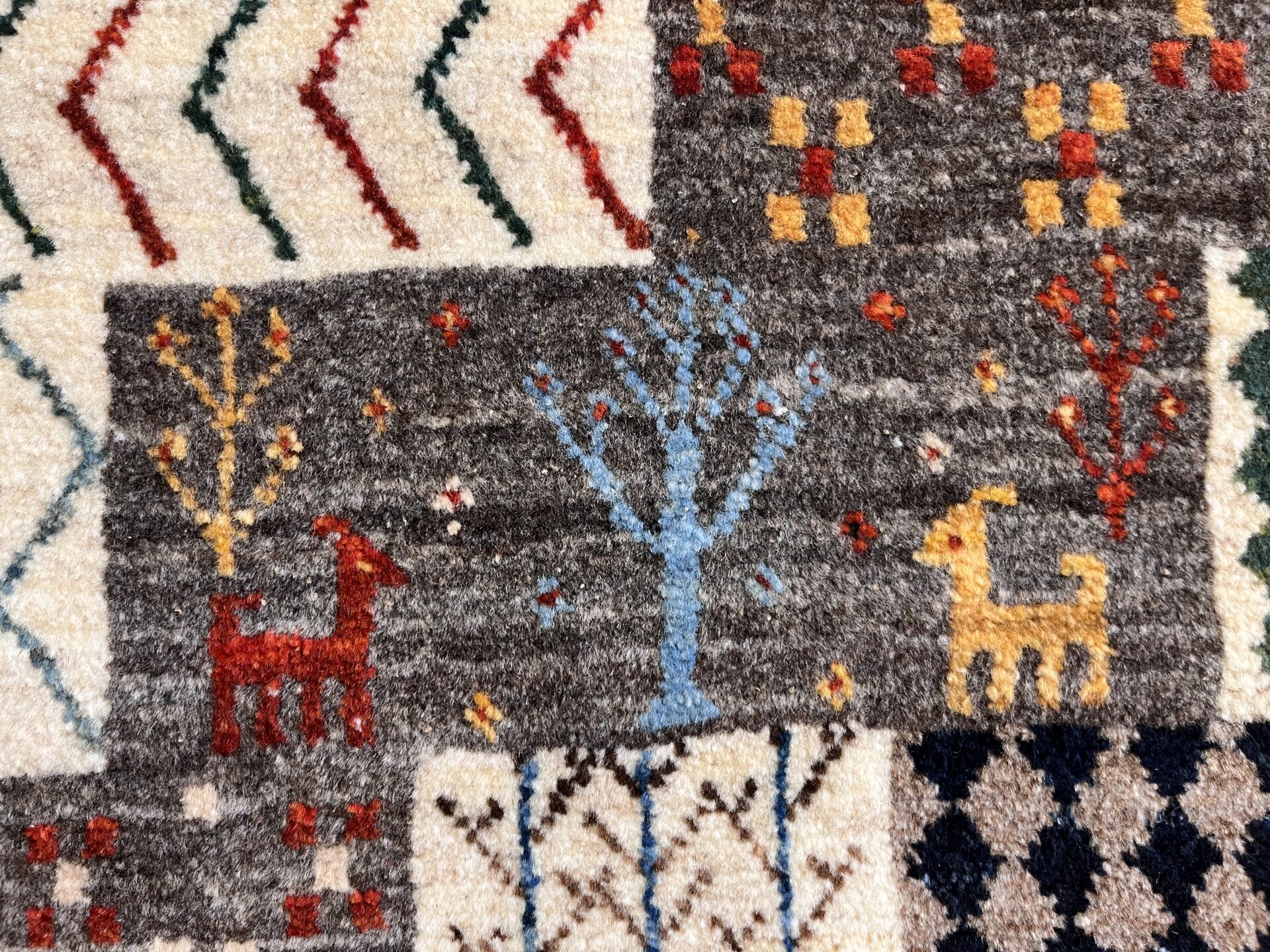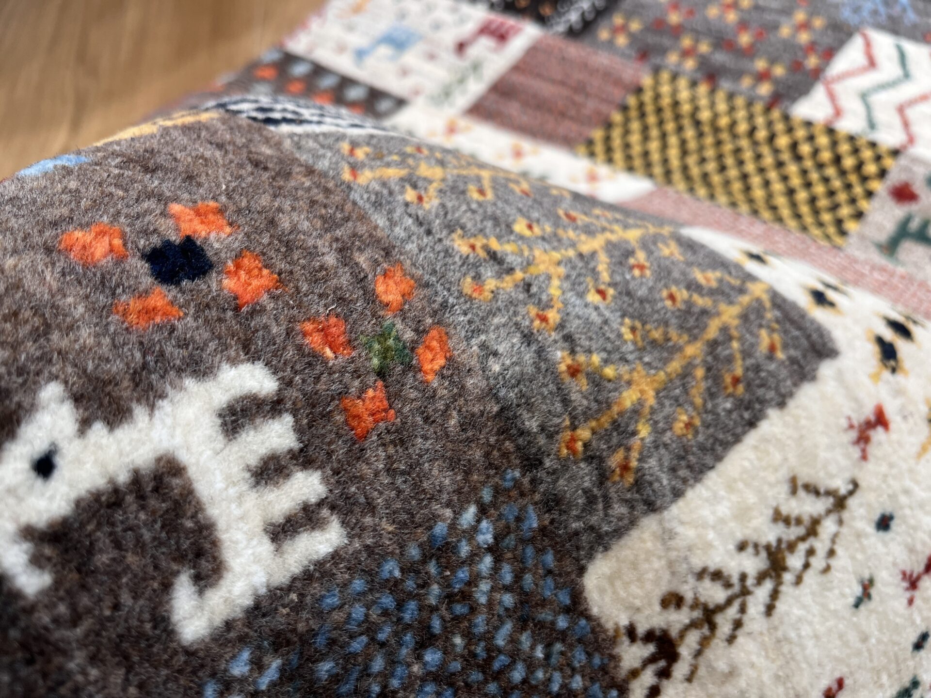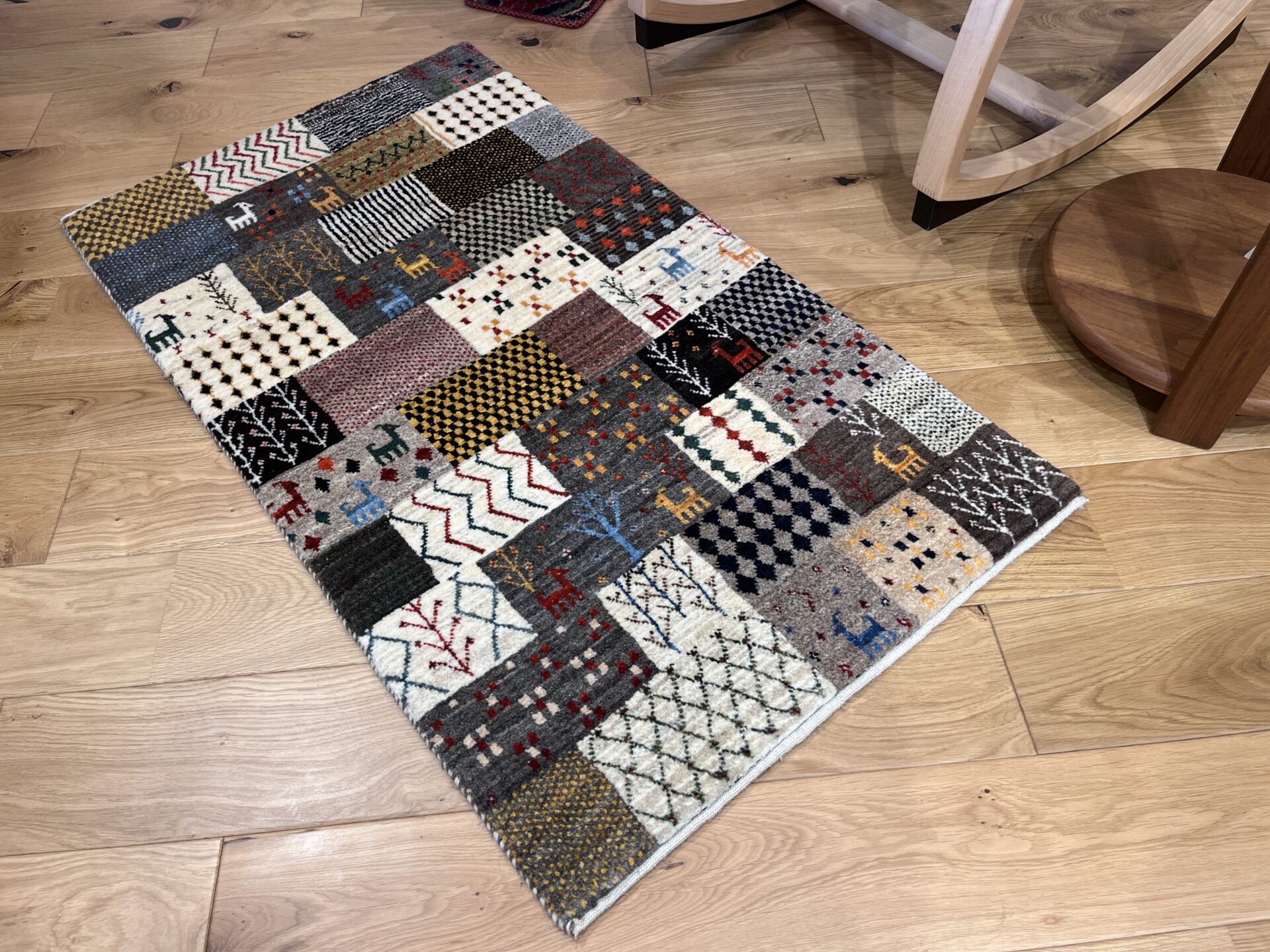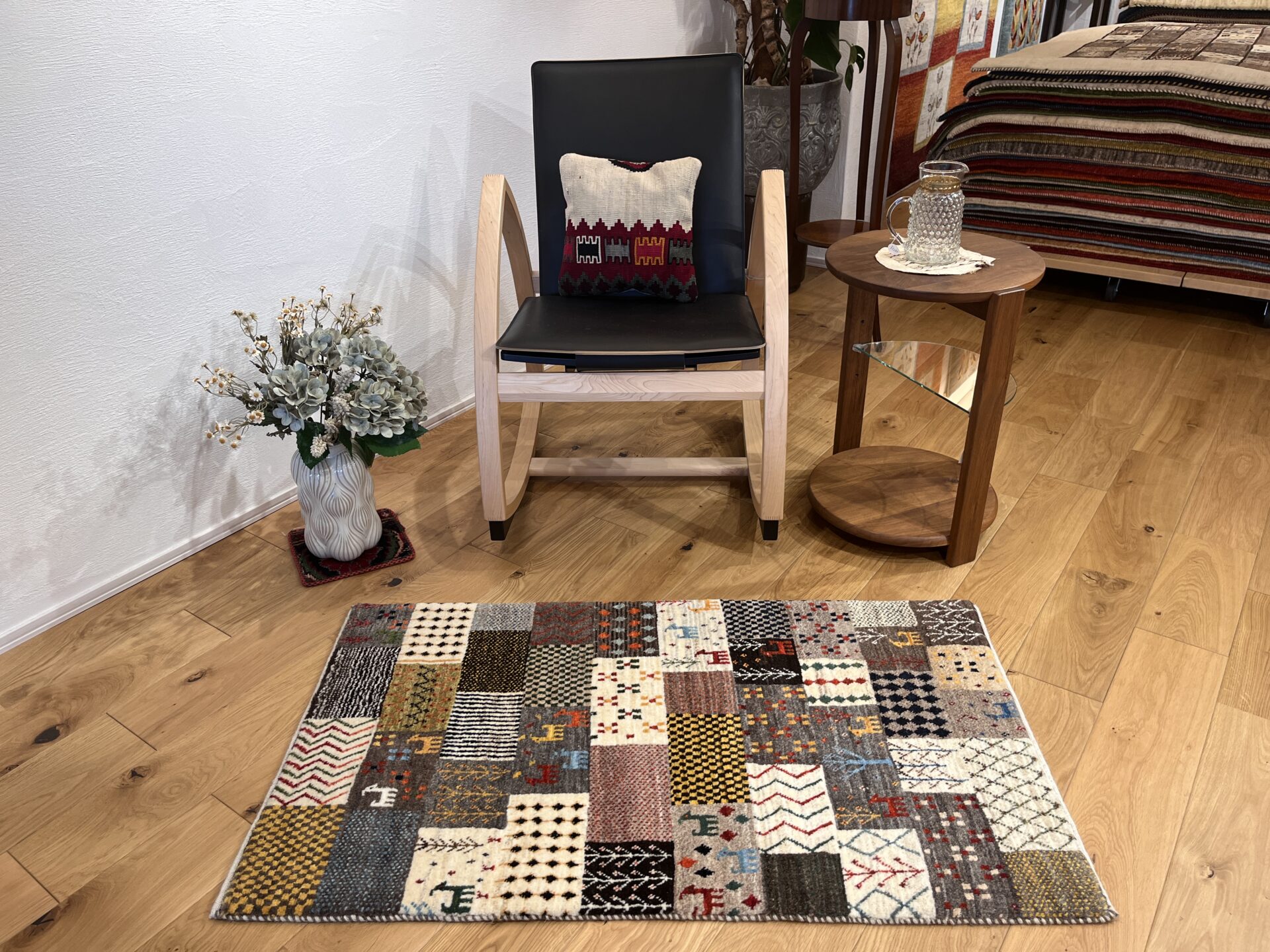 ギャッベ全体を埋め尽くすように織り込まれたパッチワーク模様。