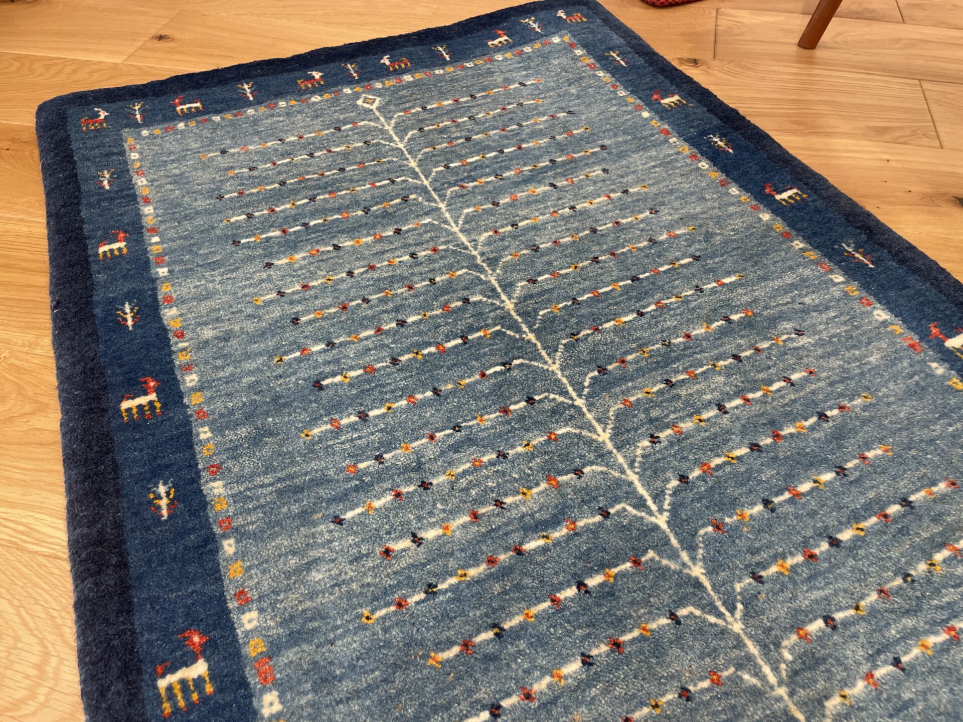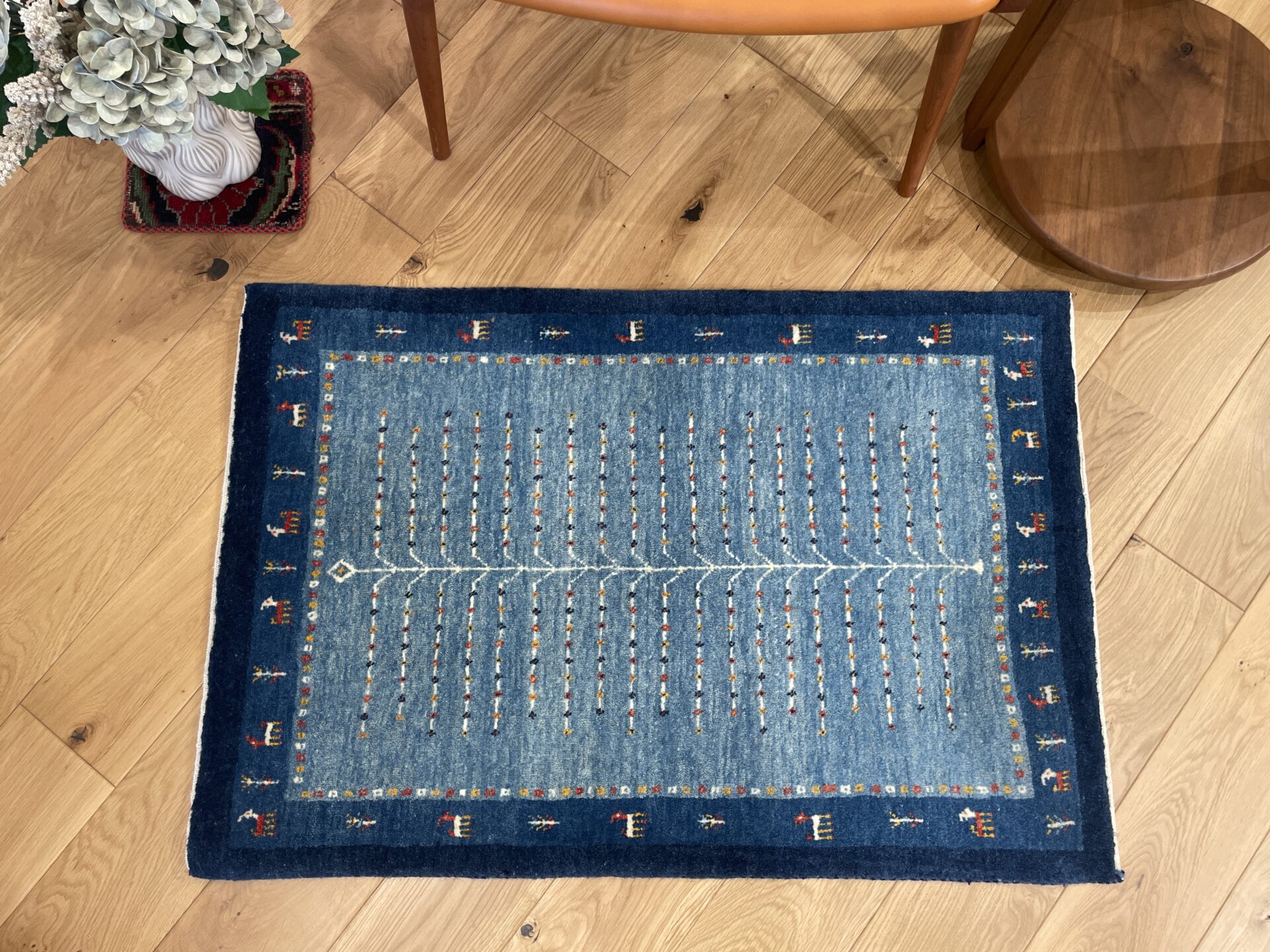深いインディゴの外枠を彩るボーダーの中には、羊と生命の樹が配され、遊牧民の女性たちが家族の健康・繁栄・幸せを願いながら織り込んでいます。