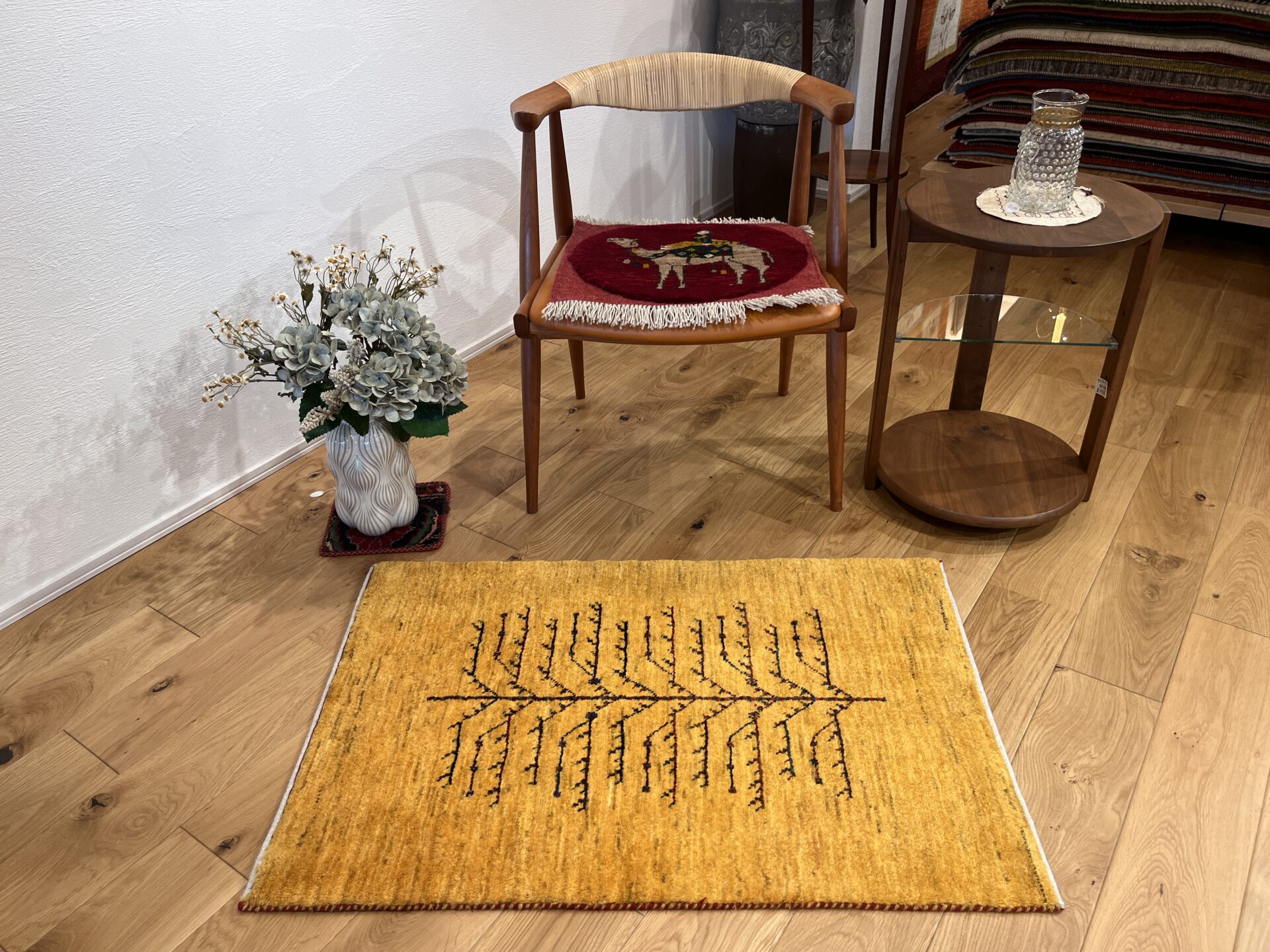 ギャッベには、しっかりした織りの「アマレ」、軽やかで繊細な「カシュクリ」、最高峰の緻密さを誇る「ルリバフ」のシリーズがあります。カシュクリ・ギャッベはアマレよりも細かな糸を使い、より緻密で滑らかな織りが特徴です。草木染めの色が美しく映え、模様の表現力も豊か。品質と軽やかさのバランスに優れ、使い心地と見た目の両方にこだわりたい方に最適な「カシュクリ ギャッベ」です。