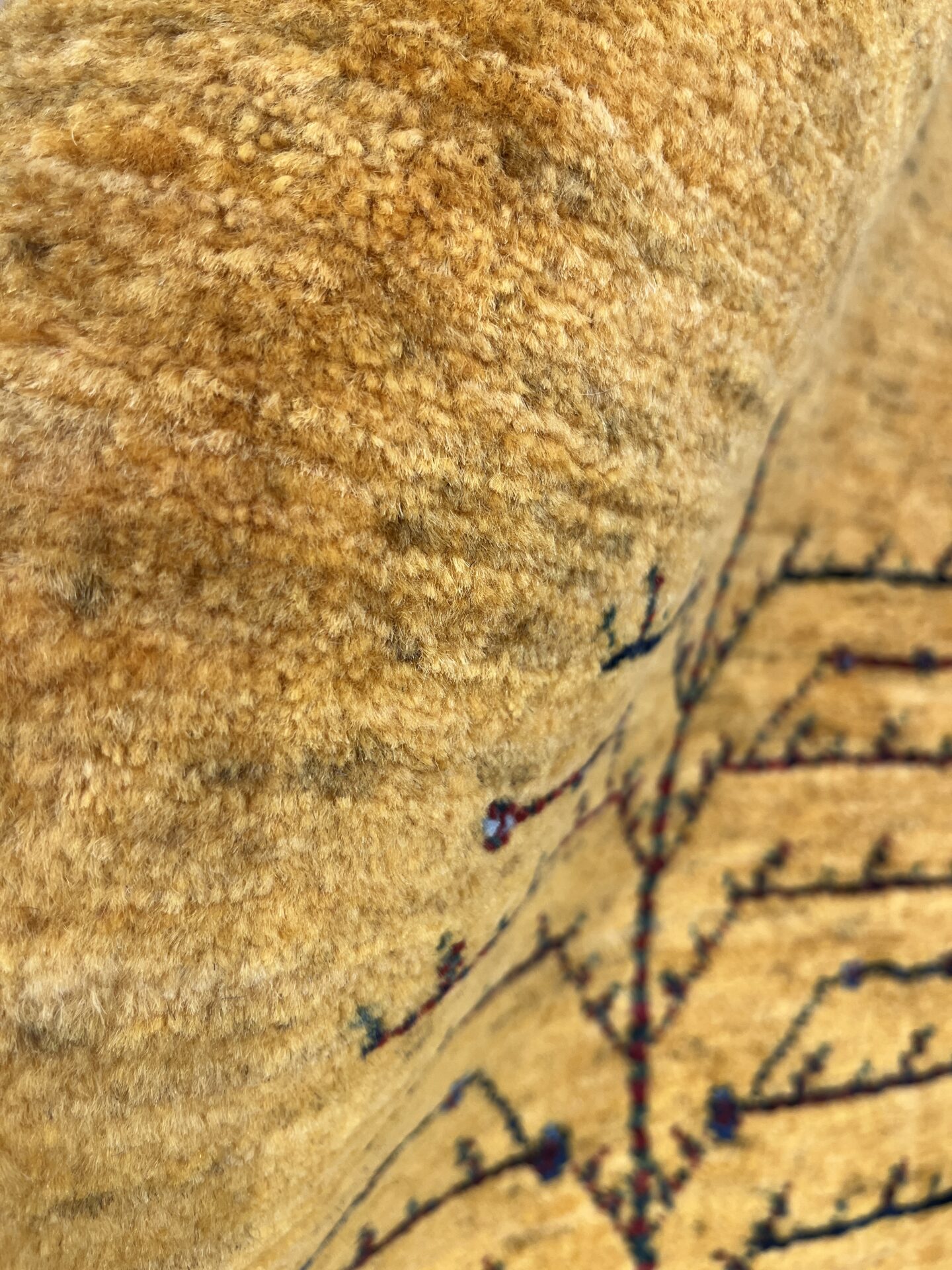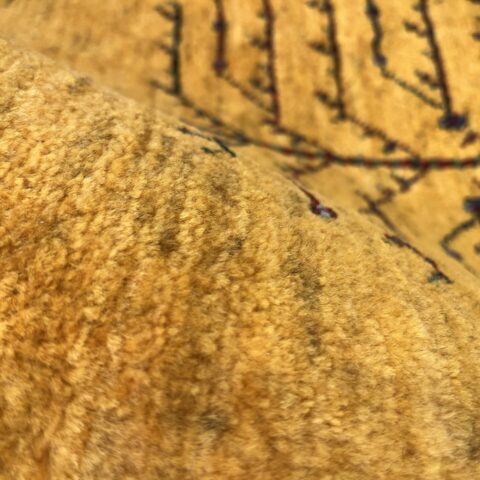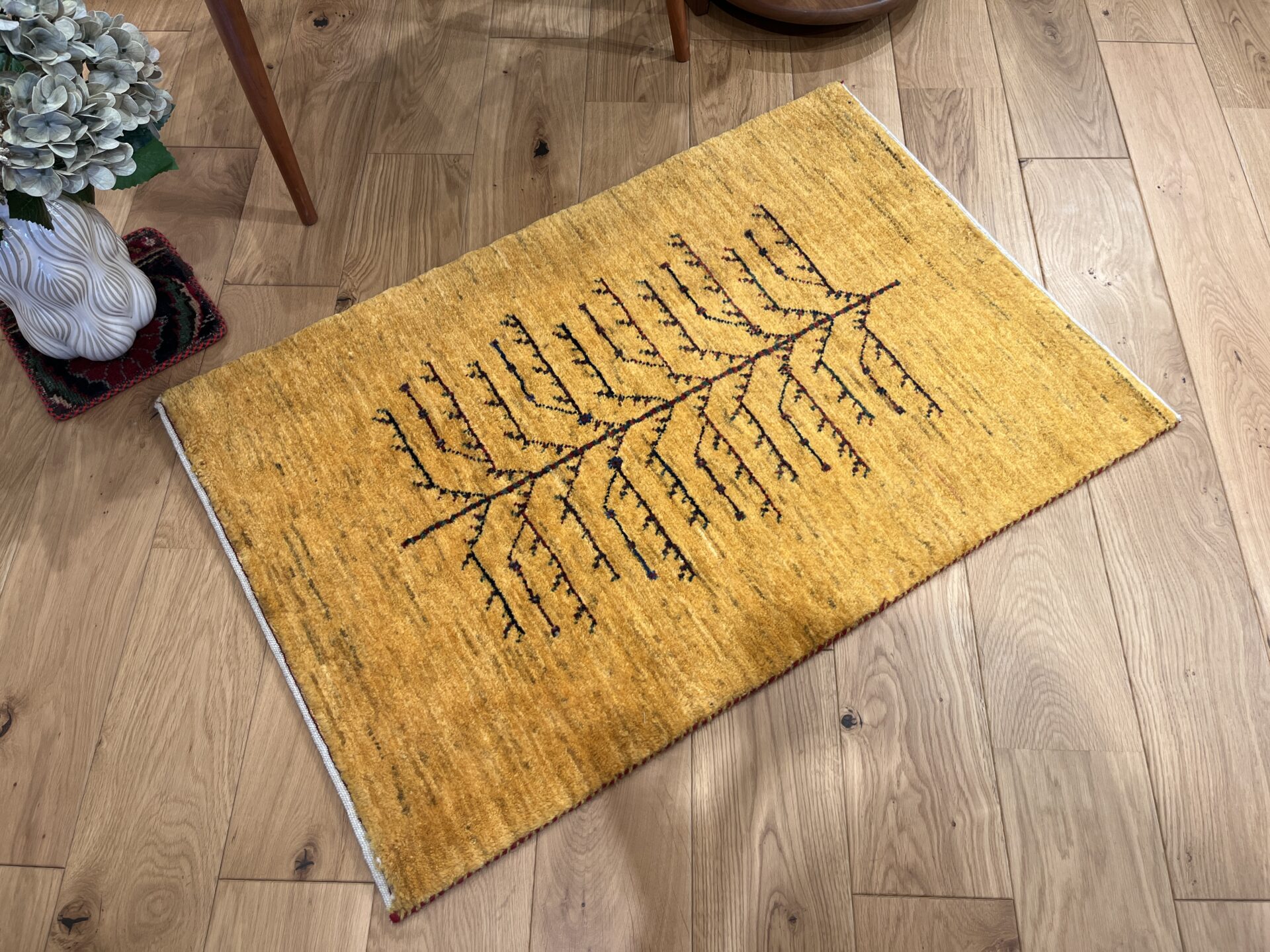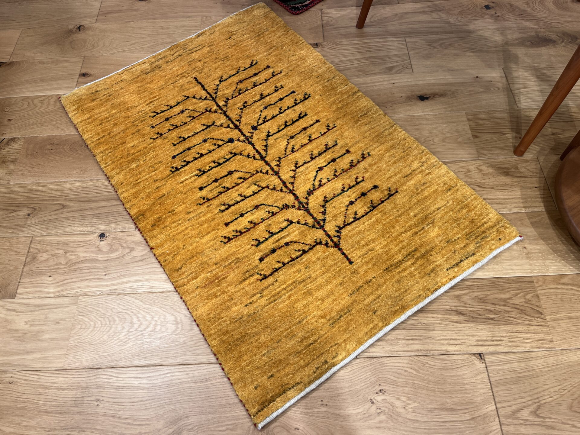 鮮やかな黄色のグラデーションのフィールドに、生命の樹が配された美しいギャッベ。