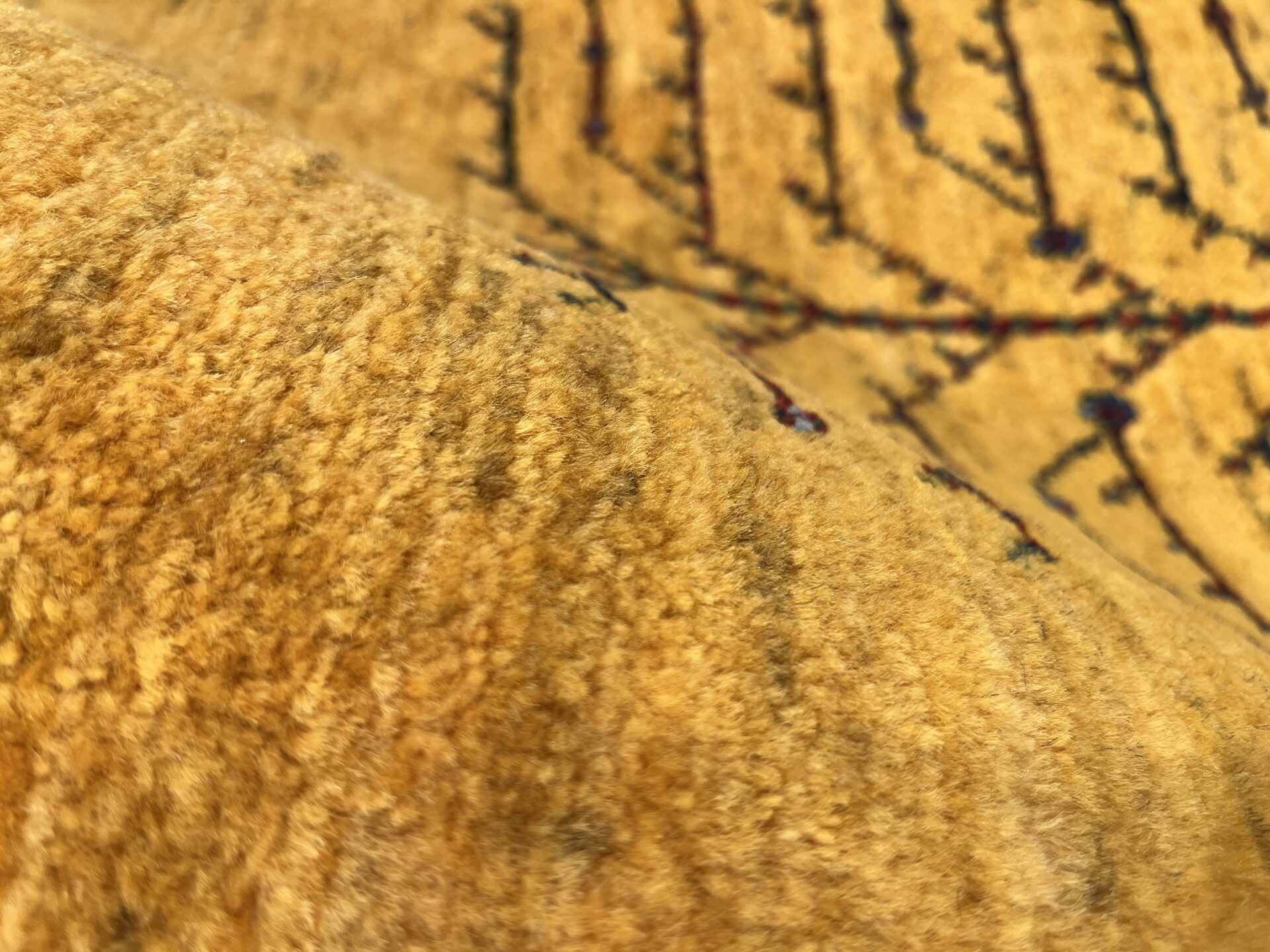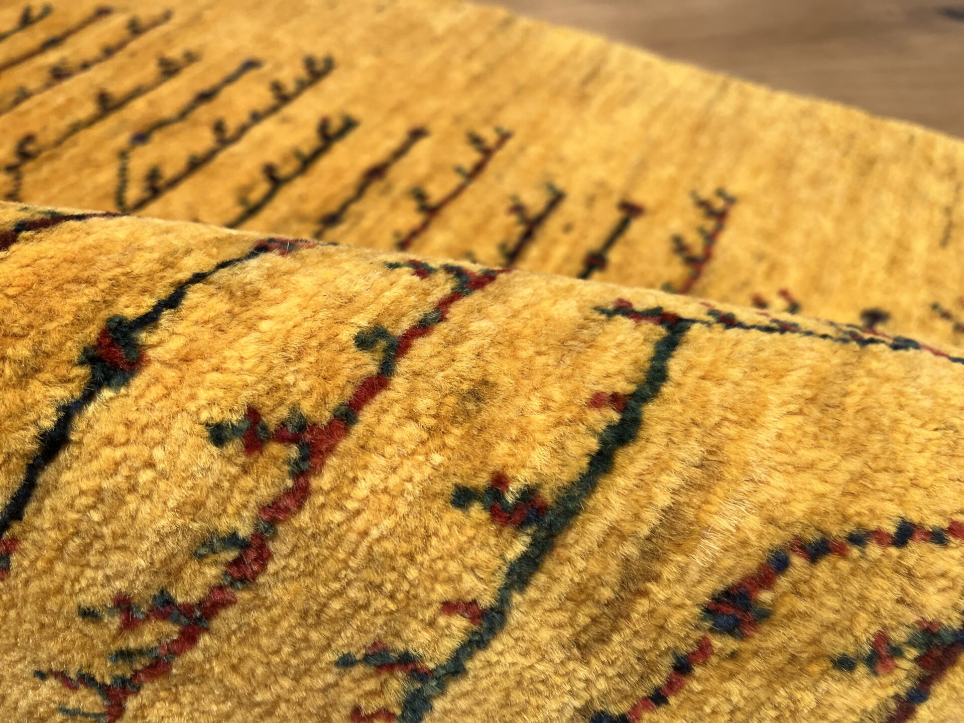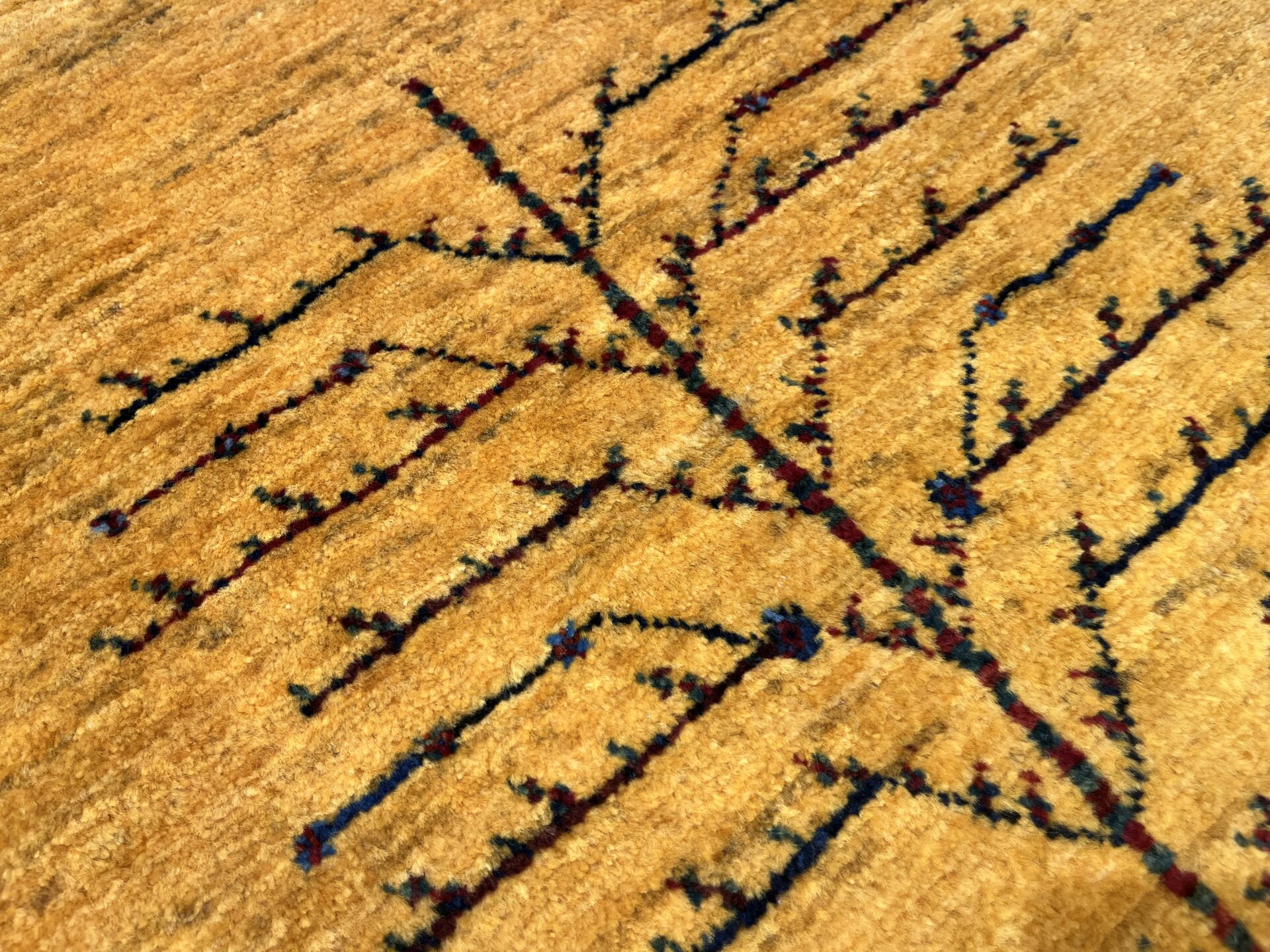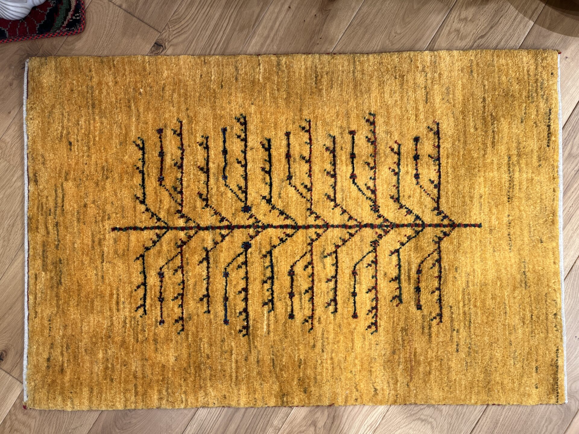 鮮やかな黄色のグラデーションのフィールドに、生命の樹が配された美しいギャッベ。